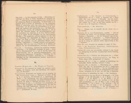 Sa y/ 4 100 i! . … . Î ting eener — in deze gemeente, 18 Julij. — Behandeling der 14 voordragt van Burg. en Weth. betreffende de oprigting van | eene —, (waarvoor een ontwerp-reglement door curatoren van | het Athenaeum Illustre is ingezonden). De Raad besluit: «. in beginsel goed te keuren de uitbreiding van het Athenaeum Utrecht. — Verordening, regelende het marktveer tusschen WY. | Vaarten (Wegen en). — Zie: Wegen en Vaarten. h VatLLANT (C. R.), benoemd tot curator der openbare armen- scholen, 31 October; heeft deze betrekking niet aangeno- men, 21 November. Varenslieden (Kommissie van bestuur over de inrigting tot het examineren van). — Benoemd tot leden: de hh. J. w. F. MATTHES, 22 Februarij en A. HENDRICHS, 21 101 Varkenmarkt. — Zie: Runder- en Varkenmarkt. — Opscheeploon aan de — wordt, te beginnen met 1 Maart 1860, niet meer geheven, 8 Februarij. Aan den markt- meester DAUBANTON, voor het gemis daarvan, eene perso- nele toelage van f 150, en aan elken arbeider aan de — de som van f 88 toegekend, 8 Februarij. Vaste goederen. — Zie: Haarlem. van den brandraad, 4 September. — Aangewezen als raadslid om bij de loting der nationale militie tegenwoordig te zijn, 1 December. VrEN (H, van), benoemd tot makelaar in tabak, 27 Dec, Veer. — Zie: Beurtveer, Marktveer, Schietschuiten- veer, Volksschuitenveer. VrErBURST (H. J.). — Aan — restitutie of afschrijving van plaatselijke direkte belasting verleend, 6 Junij. VrrDoNcK (H.), te Zaandam. — Mededeeling van —, betref- fende zijn plan tot droogmaking van het Y, aangenomen voor kennisgeving, 25 Januarij. — Op een ongezegeld adres van —, betreffende het zinken der aanlegplaatsen voor stoom- booten, overgegaan tot de orde van den dag, 4 September. Verfraaijing en uitbreiding der stad. — Zie: SARPHATI. April; — 9°, 25 April; — 10°. 16 Mei; — 11°, 23 Mei (met avondzitting); — 12°. 30 Mei; — 13°, 6 Junij (met avondzitting); — 14e 7 Junij; — 15°, 20 Junij; — 16°. 27 Junij; — 17e, 18 Julij; — 186, 8 Augustus; — 19°, 4 September (met avondzitting); — 20°. 12 September (met avondzitting); — 21°, 3 Oetober; — 22°. 4 October; — Illustre te Amsterdam onder den naam van „Universiteit te Amsterdam, — en IJsselstein, gewijzigd, 25 April. — Adres ? Maart, — De verordening voor deze inrigting gewijzigd ; Vee. — Klagten over de kontrôle bij den invoer van —, 25 October. VEEREN (H. vaN), niet ontvankelijk verklaard in zijn verzoek om afschrijving of restitutie van plaatselijke direkte belasting, 6 Junij. Vergaderingen van den Raad: 1°. 25 Januarij; — 2°, 8 Fe- bruarij; — 8e, 22 Februarij; — 40, 7 Maart; — 56, 14 Maart; — 66, 21 Maart; — 76. 28 Maat; — 8, 18 Amsterdam,’ zoo als daarvan de grondtrekken in de voor 9 van de „Handelsocieteit” te — aan de Tweede Kamer der | (0. a. besluit tot benoeming van plaatsvervangende exami- VrEcKENs (D. A. van HremskERcK), raadslid, — Lid der kommissie van beheer over de stedelijke rentegevende eigen- dommen, 4 September. — Lid der kommissie voor het bur- gerlijk armbestuur, 4 September. — Plaatsvervangend lid VELDHUYSEN (P.). — Verkoop van stads grond aan —, 4 Sept, í dragt van curatoren zijn omschreven; (0. a. vijf fakulteiten; de studerenden kunnen alle kollegiën bijwonen); %. aan te Staten-Generaal, over de spoorweg-aangelegenheden, voor natoren), 25 April. — Benoemd tot leden: de hh. J. J. 4. Verantwoording (Administratieve) van Burg, en Weth, dienst 1859, goedgekeurd, 17 October. wijzen den sGrooten Doelen” als universiteitsgebouw voor kennisgeving aangenomen, 8 Augustus. — Opheffing van het hi SANTHAGENS en jhr, L. D. RUTGERS VAN ROZENBURG, 16 het verstrekken van onderwijs, en de huur daarvan voorloo- schietschuitenveer tusschen Amsterdam en —, 5 October. — Mei, — Ter vervanging van laatstgenoemden, die deze be- pig op te zeggen bij het verstrijken van den nog loopenden | Opheffing van het volksschuitenveer tusschen Amsterdam en | —, 27 December, trekking niet heeft aangenomen, benoemd de br. P. L. A. ! huurtijd; c. het aangeboden ontwerp-reglement en den staat van begrooting van ontvangsten en uitgaven op nieuw in GOUDsWAARD, 6 Junij. — De suppletoire begrooting 1860 ! handen van Burg. en Weth. te stellen, ten einde de zaak ! verder met curatoren van het Athenaeum [llustre voor te | bereiden, 4 September. — Voorstel KOENEN, op de gemeente- der — goedgekeurd, 20 Junij. Á begrooting 1861 een post van f 40,000 uit te trekken ten |E behoeve van het universiteitsgebouw, verworpen, 25 October.