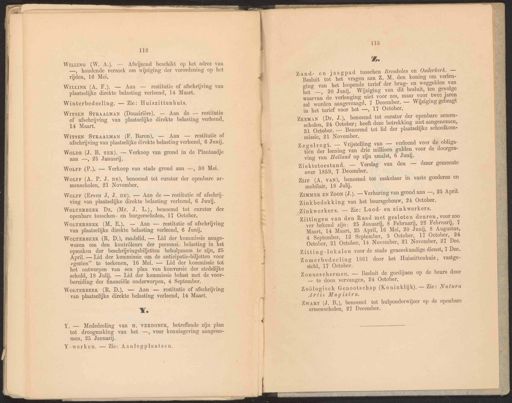 TE 112 Wine (W. A). — Afwijzend beschikt op het adres van —, houdende verzoek om wijziging der verordening op het rijden, 16 Mei. WiLLINK (A. F.). — Aan — restitutie of afschrijving van plaatselijke direkte belasting verleend, 14 Maart. Winterbedeeling. — Zie: Huiszittenhuis. WirsEN STRrAALMAN (Douairière). — Aan de — restitutie of afschrijving van plaatselijke direkte belasting verleend, 14 Maart. WirsEn STRAALMAN (F. Baron). — Aan — restitutie of afschrijving van plaatselijke direkte belasting verleend, 6 Junij. WorDe (J. B. TER). — Verkoop van grond in de Plantaadje aan —, 25 Januarij. Worrr (P.). — Verkoop van stads grond aan —, 30 Mei. Woirr (A. P. J. DE), benoemd tot curator der openbare ar- menscholen, 21 November. Woirr (Erven J, J. DE). — Aan de — restitutie of afschrij- ving van plaatselijke direkte belasting verleend, 6 Junij. WoLTERBEEK Dz. (Mr. J. L.), benoemd tot curator der openbare tusschen- en burgerscholen, 17 October, Yv. Y, — Mededeeling van H. vERDONCK, betreffende zijn plan tot droogmaking van het —, voor kennisgeving aangeno- men, 25 Januarij. Y-werken, — Zie: Aanlegplaatsen. VE Zitting-lokalen voor de stads geneeskundige dienst, 7 Dee. Zomerbedeeling 1861 door het Huiszittenhuis, vastge- steld, 17 October. WoLTERBEEK (M. E.). — Aan — restitutie of afschrijving van plaatselijke direkte belasting verleend, 6 Junij. Zand- en jaagpad tusschen Breukelen en Ouderkerk. — Besluit tot het vragen aan Z. M. den koning om verlen- ging van het loopende tarief der brug- en weggelden van het —, 20 Junij. Wijziging van dit besluit, ten gevolge waarvan de verlenging niet voor zes, maar voor twes Jaren zal worden aangevraagd, 7 December. — Wijziging gebragt in het tarief voor het —, 17 October. Zonneschermen, — Besluit de gordijnen op de beurs door — te doen vervangen, 24 October, WorrTERBEEK (R. D.), raadslid. — Lid der kommissie aange- wezen om den kontrôleurs der personel: belasting in het opmaken der beschrijvingsbiljetten behulpzaam te zijn, 25 April. — Lid der kommissie om de anticipatie-biljetten voor “gezien” te teekenen, 16 Mei. — Lid der kommissie tot het ontwerpen van een plan van konversie der stedelijke schuld, 18 Julij. — Lid der kommissie belast met de voor- bereiding der financiële onderwerpen, 4 September. ZEEMAN (Dr. J.), benoemd tot curator der openbare armen- scholen, 24 October; heeft deze betrekking niet aangenomen, 31 October. — Benoemd tot lid der plaatselijke schoolkom- missie, 21 November. Zoölogisch Genootschap (Koninklijk). — Zie: Natura Artis Magistra. WoLTERBEEK (R. D.). — Aan — restitutie of afschrijving van plaatselijke direkte belasting verleend, 14 Maart, Zegelregt. — Vrijstelling van — verleend voor de obliga- tiën der leening van drie millioen gulden voor de doorgra- ving van Holland op zijn smalst, 6 Junij. Zwart (J. B.), benoemd tot hulponderwijzer op de openbare armenscholen, 27 December. Ziektetoestand. — Verslag van den — dezer gemeente over 1859, 7 December. Zijp (A. van), benoemd tot makelaar in vaste goederen en mobilair, 18 Julij. ZrmmERr EN Zoon (J.). — Verhuring van grond aan —, 25 April. Zinkbedekking van het beursgebouw, 24 October. Zinkwerkers. — Zie: Lood- en zinkwerkers. Zittingen van den Raad met gesloten deuren, voor zoo ver bekend zijn: 25 Januarij, 8 Februarij, 22 Februarij, 7 Maart, 14 Maart, 25 April, 16 Mei, 20 Junij, 8 Augustus, 4 September, 12 September, 5 October, 17 October, 24 October, 81 October, 14 November, 21 November, 27 Dee.