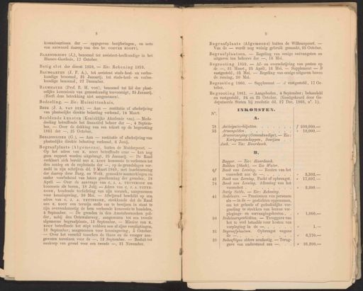 > sE 8 kommissarissen der — opgegeven becijferingen, en nota van antwoord daarop van den hr. CORVER HOOFT), BARENDRECHT (J,), benoemd tot assistent- heelkundige in het Binnen-Gasthuis, 17 October. Batig slot der dienst 1859. — Zie: Rekening 1859 BAUMGARTEN (J. F. A), tot assistent stads-heel- en verlos- kundige benoemd, 25 Januarij; tot stads-heel- en verlos- kundige benoemd, 27 December. BAUMHAUER (Prof. E. H. von), benoemd tot lid der plaat- selijke kommissie van geneeskundig toevoorzigt, 25 Januarij. (Heeft deze betrekking niet aangenomen) jn — Zie: Huiszittenhuis, BEEK (J. VAN DER). — Aan — restitutie of afschrijving van Ie direkte be lasting verleend, 14 Maart. eeldende kunsten (Koninklijke Akademie van). — Mede- betreffende het financiëel beheer der —, 4 Septem- ber. — Over de dekking van een tekort op de begrooting 1861 der —, 25 October, BEELDSNIJDER (G.). — Aan — restitutie of afschrij ving van plaatselijke Uirekt, belasting verleend, 6 Junij. Begraafplaats (Algemeene), buiten de Milde — Op het adres van x, Kooy betreffende eene kan nog geen rapport worden uitgebragt, 25 Januarij. — De Raad verklaart zich bereid aan K. Kooy koncessie te verleenen tot den aanleg en de exploitatie der —, op de grondslagen ver- meld in zijn schrijven dd. 3 Maart 1860, met inachtneming der daarop door Burg. en Weth. gemaakte aanmerkingen en onder voorbehoud van latere goedkeuring der gronden, 18 April. — Over de aanvrage van C. 7. A, TETTERODE om koneessie als boven, 18 Julij. — Adres van C. 7. A, TETTE- RODE, houdende toelichting van zijn verzoek, aangenomen voor kennisgeving, 30 Mei. — Afwijzend beschikt op een adres van C., J. A. TETTERODE, strekkende dat de Raad aan K. KOOY een termijn stelle om te bewijzen in staat te zijn overeenkomstig de hem verleende koncessie te handelen, 4 September. — De gronden in den Amstelveenschen pol der, nabij den Oetewaler weg, aangewezen tot een tweede algemeene begraafplaats, 12 September. — Missive van K. Kooy betreffende het stipt voldoen aan al zijne verpieingen, 12 September; aangenomen voor kennisgeving, 5 October. Begraafplaats (Algemeene) buiten de Willemspoort. Van de — wordt nog weinig gebruik gemaakt, 25 October. Begraafplaatsen. — Regeling van eenige ontvangsten en uitgaven ten behoeve der —, 16 Mei. Begrooting 1859. — Af- en overschrijving van posten op de —, 21 Maart, 25 April, 16 Mei. — Supplement — B vastgesteld, 28 Mei. de raming, 30 Mei. Begrooting 1860. — Supplement — tober. Begrooting 1861. en vastgesteld, 24 en 25 October Regeling van eenige uitgaven boven A vastgesteld, 17 Oc- — Aangeboden, 4 September; behandeld (Goedgekeurd door Ge- deputeerde Staten bij resolutie dd. 27 Dec. 1860, n°. 1). 50 INKOMSTEN. Ys Anticipatie-biljetten. . Ar mengelden . 19, : Armverzorging (Geneeskundige). L Zie: Kerkgenootschappen, Bewijzen Asch. — Zie: Haardasch, Bagger. — Zie: Haardasch. Bank van Leening. Aflossing van het voorscholen als —in de — gestichten opgenomen, om tot geheele of gedeeltelijke ver- goeding te strekken van hunne ver- plegings- en vervangingskosten | f 500,000.— ‚ 10,000,— u 2,200. — 9 1000 j - + 6,770. Over het verschil tusschen de thans en de vroeger aan- gewezen terreinen voor de —, 12 September. — Besluit tot aankoop van grond voor een tweede —, 21 November, Bakken (Stads). — Zie Water. Batig Saldo. — Zie: Rekening. Bedelaarsgestichten. — Teruggave van het te veel betaalde voor kosten van verpleging in de —. EN Bank van Leening. — Renten van het voorschot aan de —. : Bedelaars. — Pensioenen van personen Begraafplaatsen. Opbrengst wegens de —. Bank van Leening, sin of opbrengst. Behoeftigen elders s ar rmlastig. _ Terug: gave van onderstand aan —.