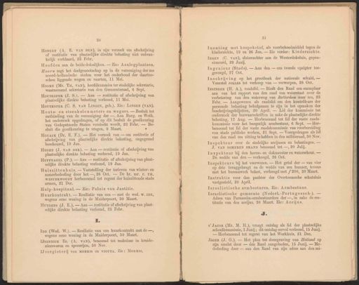 30 HoNtrT (A. E. VAN DEN), in zijn verzoek om afschrijving of restitutie van plaatselijke direkte belasting niet ontvan- kelijk verklaard, 23 Febr, Hoorn zegt het deelgenootschap op in de vereeniging der zes noord-hollandsche steden voor het onderhoud der daartus- schen liggende wegen en vaarten, 11 Mei. Hoorn (Mr. Tu. van), hoofdkommies ter stedelijke sekretarie, waarnemend sekretaris van den Gemeenteraad, 6 Sept. u Ins (Wed. W.). — Resiliatie van een huurkontrakt met de —, wegens eene woning in de Muiderpoort, 30 Maart. IJsenDik Ez. (A. van), benoemd tot makelaar in kruide- nierswaren en specerijen, 30 Nov. IJzergieterij van MORRIS en vroTTa. Zie: MORRIS. Inenting met koepokstof, als voorbehoedmiddel tegen de kinderziekte, 19 en 26 Jan. — Zie verder: Kinderziekte. Ingenieur (Stads). — Aan den — een tweede opzigter toe- gevoegd, 27 Oct. Inschrijving op het grootboek der nationale schuld, — Voorstel JOLLES tot verkoop van — verworpen, 28 Oct. InsinGer (H. A.), raadslid. — Biedt den Raad een exemplaar aan van het rapport van den raad van waterstaat over de verbetering van den waterweg van Rotterdam naar zee, 23 Febr. — Aangewezen als raadslid om den kontrôleurs der personele belasting behulpzaam te zijn in het opmaken der beschrijvingsbiljetten, 20 April. — Lid der kommissie tot onderzoek der bezwaarschriften in zake de plaatselijke direkte belasting, 17 Aug. — Herbenoemd tot lid der vaste raads- kommissie voor het burgerlijk armbestuur, 6 Sept. — Her- benoemd tot lid der vaste raadskommissie van voorbereiding van stads publieke werken, 21 Sept. — Voorgedragen als lid van den raad om zitting te hebben in den militieraad, 30 Nov. Inspekteur over de stedelijke accijnsen en belastingen. — J. VAN SOMEREN BRAND benoemd tot —, 20 Julij. Inspekteur bij den haven- en dokmeester en waterschout. — De wedde van den — verhoogd, 26 Oct. Inspekteurs bij het voerwezen. — Het getal der — van vier op drie teruggebragt en de wedde van een hunner, tevens met het bureauwerk belast, verhoogd met f 200, 30 Maart. Instruktie voor den pachter der Overtoomsche schutsluis vastgesteld, 20 April. Adres van Parnassim-armbestuurders der —,in zake de res- titutie van den accijns, 80 Maart. Zie: Accijns. 5: 8’ Jacog (Mr. M. H.), vraagt ontslag als lid der plaatselijke schoolkommissie, 1 Junij; dit ontslag eervol verleend, 15 Junij. — Herbenoemd tot regent van het Werkhuis, 21 Dee. Hoofden aan de beide doksdijken. — Zie: Aanlegplaatsen. HourtkoPEr (J. S.). — Aan — restitutie of afschrijving van plaatselijke direkte belasting verleend, 11 Mei. INGEN (C. van), sluiswachter aan de Westerdoksluis, gepen- sioneerd, 29 Junij. Israelietische armbesturen. Zie: Armbestuur. Jäser (J. G.). — Het plan tot doorgraving van Holland op zijn smalst door — den Raad aangeboden, 15 Junij. — Me- dedeeling door — aan den Raad van zijn adres aan den mi- HourKoPERr (C. S. vAN LINGEN, geb.). Zie: LINGEN (VAN). Israeclietische gemeente (Nederl.-Portugeesch-). — Houts- en steenkolenmeters en wegers. — Besluit tot ontbinding van de vereeniging der —. Aan Burg. en Weth. het onderzoek opgedragen, of op dit besluit de goedkeuring van Gedeputeerde Staten vereischt wordt, 23 Febr, — Be- sluit die goedkeuring te vragen, 9 Maart. Horack (Dr. E. F.). — Het verzoek van — om restitutie of afschrijving van plaatselijke direkte belasting, ongegrond beschouwd, 19 Jan. Hucar (J. VAN DER). — Aan — restitutie of afschrijving van plaatselijke direkte belasting verleend, 19 Jan. HurrnaGEL (P.). — Aan — restitutie of afschrijving van plaat- selijke direkte belasting verleend, 19 Jan. Huiszittenhuis. — Vaststelling der tarieven van winter- en zomerbedeeling door het —, 26 Oet. — De hr. mr. F. TH, wEsTErwoUDT herbenoemd tot regent der huiszittende stads armen, 21 Dec. Hulp-hospitaal. — Zie: Paleis van Justitie. Huurkontrakt. — Resiliatie van een — met de wed. W. IDE, wegens eene woning in de Muiderpoort, 30 Maart. Hureens (J. E.). — Aan — restitutie of afschrijving van plaat- selijke direkte belasting verleend, 23 Febr.