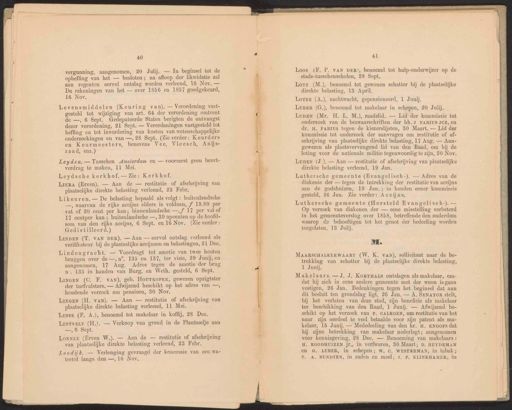 eN ee ee a Been 2 ee 40 vergunning, aangenomen, 20 Julij. — In beginsel tot de opheffing van het — besloten; na afloop der likwidatie zal aan regenten eervol ontslag worden verleend, 16 Nov. — De rekeningen van het — over 1856 en 1857 goedgekeurd, 16 Nov, Levensmiddelen (Keuring van). — Verordening vast- gesteld tot wijziging van art. 64 der verordening omtrent de —, 6 Sept. Gedeputeerde Staten berigten de ontvangst dezer verordening, 21 Sept. — Verordeningen vastgesteld tot heffing en tot invordering van kosten van wetenschappelijke onderzoekingen en van —, 28 Sept. (Zie verder: Keurders en Keurmeesters, benevens Vee, Vleesch, Anijs- zaad, enz.) Leyden, — Tusschen Amsterdam en — vooreerst geen beurt- verdrag te maken, 11 Mei. 41 Loos (F. P. vAN DER), benoemd tot hulp-onderwijzer op de stads-tusschenscholen, 28 Sept. Lorz (M.), benoemd tot gewonen schatter bij de plaatselijke direkte belasting, 13 April. Lorze (A.), nachtwacht, gepensioneerd, 1 Junij. LuBER (G.), benoemd tot makelaar in schepen, 20 Juli. LupDEN (Mr. H. L. M.), raadslid. — Lid der kommissie tot onderzoek van de bezwaarschriften der hh. 7 FABIUS JCz. en dr. H. FABIUs tegen de kiezerslijsten, 30 Maart. — Lid der kommissie tot onderzoek der aanvragen om restitutie of af- schrijving van plaatselijke direkte belasting, 17 Aug. — Aan- gewezen als plaatsvervangend lid van den Raad, om bij de loting voor de nationale militie tegenwoordig te zijn, 80 Nov. MM. MAARSCHALKERWAART (W. K. vAn), sollicitant naar de be- trekking van schatter bij de plaatselijke direkte belasting, 1 Junij. Leydsche kerkhof. — Zie: Kerkhof. LuDEN (J.). — Aan — restitutie of afschrijving van plaatselijke direkte belasting verleend, 19 Jan, Makelaars. —J. J. KoRTHALS ontslagen als makelaar, om- dat hij zich in eene andere gemeente met der woon is gaan vestigen, 26 Jan. Bedenkingen tegen het beginsel dat aan dit besluit ten grondslag ligt, 26 Jan. — A. SENATOR stelt, bij het verlaten van deze stad, zijn beneficie als makelaar ter beschikking van den Raad, 1 Junij. — Afwijzend be- schikt op het verzoek van P. CALKOEN, om restitutie van het naar zijn oordeel te veel betaalde voor zijn patent als ma- kelaar, 15 Junij. — Mededeeling van den hr. H. KNOOPS dat hij zijne betrekking van makelaar nederlegt; aangenomen voor kennisgeving, 28 Dec, — Benoeming van makelaars : H, ROODHUIZEN jr, in verfwaren, 80 Maart; D. HEYDEMAN en G. LUBER, in schepen; W. C. WESTERMAN, in tabak; P. A. BUNDTEN, in zaden en meel; J, P. KLINKHAMER, in LiErA (Erven). — Aan de — restitntie of afschrijving van plaatselijke direkte belasting verleend, 23 Febr. Luthersche gemeente (Evangelisch-). — Adres van de diakenie der — tegen de intrekking der restitutie van accijns aan de godshuizen, 19 Jan. ; in handen eener kommissie gesteld, 26 Jan. Zie verder: Accöjns. Likeuren. — De belasting bepaald als volgt : buitenlandsche — ‚waarvan de rijks accijns elders is voldaan, f 19.80 per vat of 20 cent per kan; binnenlandsche —,f 17 per vat of 17 centper kan ; buitenlandsche —, 39 opcenten op de hoofd- som van den rijks accijns, 6 Sept. en 16 Nov. (Zie verder: Gedistilleerd.) Luthersche gemeente (Hersteld Evangeliseh-). — Op verzoek van diakenen der — eene misstelling verbeterd in het gemeenteverslag over 1858, betreffende den ouderdom waarop d2 behoeftigen tot het genot der bedeeling worden toegelaten, 13 Julij. LINDEN (T. vAN DER). — Aan — eervol ontslag verleend als verifikateur bij de plaatselijke accijnsen en belastingen, 21 Dee. Lindengracht. — Voordragt tot amotie van twee houten bruggen over de —, n°. 135 en 137, ter visie, 29 Junij, en aangenomen, 17 Aug. Adres tegen de amotie der brug n. 135 in handen van Burg. en Weth. gesteld, 6 Sept. LINGEN (C. F. van), geb. HoUTKOPER, gewezen opzigtster der turfvulsters. — Afwijzend beschikt op het adres van —, houdende verzoek om pensioen, 30 Nov, LinGEN (H, vaN). — Aan — restitutie of afschrijving van plaatselijke direkte belasting verleend, 11 Mei. Linser (F. A.), benoemd tot makelaar in koffij, 28 Dec. Lisrverrt (H.). — Verkoop van grond in de Plantaadje aan —, 6 Sept. LoxxNEEr (Erven W.). — Aan de — restitutie of afschrijving van plaatselijke direkte belasting verleend, 23 Febr. Loodijk. — Verlenging gevraagd der koncessie van cen wa- tertol langs den —, 16 Nov.
