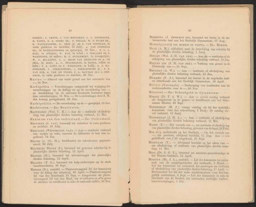 42 metalen, J. AREND, J. VAN MEETEREN, L. J. NEUMEIJER, H. TAKES, H. G. GEERS GZ., P. PIKAAR, W, F, STARK HZ, G. WAFELBAKKER, N, SMIT jr. en F. VAN POPPELEN, in vaste goederen en mobilair, 20 Julij; A. VAN IJSENDIJK EZ., in kruidenierswaren en specerijen, 30 Nov‚; E. €. A. KOLI, in schepen; W. KAT, in tabak; S. SPELLERS en C. WARNSINCK, in suiker; H. C. GUILLEBERT, in droogerijen ; W. GC. BLAAUPOT, J. A. BLOIS VAN TRESLONG en A, DE PRIL, in meel; A. C, PFLUGHAUPT, in huiden, vellen en leder; F. A. LINSE en F. WESSELINK, in koffij; H. E. RA- DEMAKER, J. TEKELENBURG, J. TEKELENBURG jr, Marktpolitie. — De verordening op de — gewijzigd, 19 Jan. Marktveren. — Zie: Beurtveren. MarruijsEn (Wed. C. H.). — Aan de — restitutie of afschrij- ving van plaatselijke direkte belasting verleend, 11 Mei. Maximum van den onderstand. — Zie: Onderstand. LE EE MrsauITa (J. JESsURUN DE), benoemd tot lector in de he- breeuwsche taal aan het Stedelijk Gymnasium, 17 Aug, Metaalgieterij van MORRIS en viorr, — Zie: MORRIS. Merz (A. M.), sollicitant naar de betrekking van schatter bij VAN RYE, A. VAN DE VIJSEL, J. A. RAVELLI en J.J. REE- SINCK, in vaste goederen en mobilair, 28 Dee. MEETEREN (J, VAN), benoemd tot makelaar in vaste goederen en mobilair, 20 Julij. de plaatselijke direkte belasting, 1 Junij. Marine. — Afstand van stads grond aan het ministerie van —,16 Nov. MEETEREN (WESTEROUEN VAN). — Aan — restitutie verleend van accijns op coke, waarvan de deklaratie te laat was in- gediend, 19 Jan. MEuLEN (Wed. J. H. VAN DER). — Aan de — restitutie of af- schrijving van plaatselijke direkte belasting verleend, 19 Jan. Marktgelden. — Verordeningen vastgesteld tot wijziging der verordeningen op de heffing en op de invordering van —, en beschikking op de adressen houdende bezwaren tegen deze verordeningen, 16 Nov. — De verordeningen door Z. M. den koning goedgekeurd, 28 Dec. Meer jr. (G. H.), boekhouder ter rekenkamer, gepensio- neerd, 20 Julij. MEULEN LZ. (J. H. vAN DER). — Verkoop van grond in de Plantaadje aan —, 21 Sept. MeyERrINK Meter (J.), benoemd tot gewonen schatter bij de plaatselijke direkte belasting, 13 April. MEULMAN (A. W.). — Aan — restitutie of afschrijving van plaatselijke direkte belasting verleend, 19 Jan, Mriszsz (H.), benoemd tot sub-ontvanger der plaatselijke direkte belasting, 13 April. MitLarD (F. J.), benoemd tot leeraar in de engelsche taal- en letterkunde aan het Stedelijk Gymnasium, 13 April. Militie (Nationale), — Deelneming van raadsleden aan de MeiLInK (F. G.), benoemd tot hulp-onderwijzer op de stads tusschenscholen, 28 Sept. werkzaamheden voor de —, 30 Nov. Mespes (D.), raadslid. — Plaatsvervangend lid der kommissie voor de loting der schutterij, 20 April. — Plaatsvervangend lid van den brandraad, 21 Sept. — Aangewezen als plaats- vervangend lid van den Raad, om te teekenen en af te geven de attesten en certifikaten in zake de nationale militie, 30 Nov. Minerval. — Zie: Schoolgeld en Gymnasium. MiaueL (Dr. F. A. W‚). — Aan — eervol ontslag verleend als hoogleeraar in de genees- en kruidkunde aan het Athe- naeum [llustre, 21 Sept. MoppermAN (H. J.), vraagt ontslag als lid der stedelijke kommissie voor den schouwburg, 1 Junij; dit ontslag eer- vol verleend, 15 Junij. MODDERMAN (J. H. A.). — Aan — restitutie of afschrijving van plaatselijke direkte belasting verleend, 11 Mei. j Moser (B.) — Het verzoek van —, om restitutie of afschrijving van plaatselijke direkte belasting, gewezen van de hand, 23 Febr. Mo (J.), nachtwacht op het Stadhuis. — Op het verzoek van —, om pensioen, afwijzend beschikt, 17 Aug. Aan — een gratifikatie van f 40 toegekend, 21 Sept. MOLENAAR (T.). Afwijzend beschikt op het adres van — om afschrijving of restitutie van plaatselijke direkte belas- ting, 11 Mei. MoLL (Dr. J.G. Z.), benoemd tot assistent-geneeskundige in het Binnen-Gasthuis, 13 April. j MorstTEr (Mr. J. A), raadslid. — Lid der kommissie tot onder- zoek van de aangelegenheden der turfmarkt, 9 Maart. — Lid der kommissie tot onderzoek der aanvragen om restitutie of afschrijving van plaatselijke direkte belasting, 17 April. — Herbenoemd tot lid der vaste raadskommissie voor het bur- gerlijk armbestuur, 6 Sept. — Lid der kommissie in zake de likwidatie van de fondsen der ontbonden stedelijke turfwer- kersvereenigingen, 5 Oct.