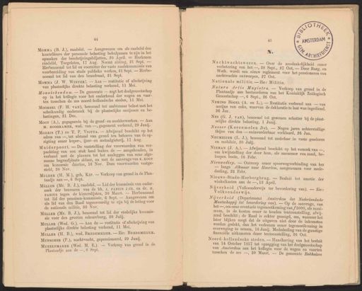 44 ‚ J.), raadslid. — Aangewezen om als raadslid ve NN LE personele belasting DL eg opmaken der beschrijvingsbiljetten, 20 April. pi BN raadslid. Toegelaten, 17 Aug. Neemt De NM . Herbenoemd tot lid en voorzitter der vaste en A Ln voorbereiding van stads publieke werken, 21 Sept. — He noemd tot lid van den brandraad, 21 Sept. ie Momma (J. W. WINTER). — Aan — restitutie ii van plaatselijke direkte belasting verleend, 11 Mei. Monnickendam. — De gemeente -— zegt bet ON op in het kollegie voor het onderhoud DE » We oe a2 ten tusschen de zes noord-hollandsche steden, ; enoemd tot ambtenaar belast met het rde bij raaf- en modderwerken. — Aan oegageerde bij de graaf- e \i Mo cement verleend, 29 Junij. < y an —, gag M. HOOGKAMER, wed. Ve ‚Eg ä % Morris (T.) en T. P. ViorT4. — Afwijzend beschikt op het en van — tot afstand van grond ten behoeve van de op- j di . Fi] 5 : zigting eener koper-, iijzer- en metaalgieterij, 17 Aug. _ Muiderpoort. — De vaststelling der voorwaarden ver- : achting van een stuk land buiten de aangehouc ij Eg met de plannen tot het aanleggen van eene a ge i 5 5 va U id id meene begraafplaats aldaar, en met de aanvrage B EN e 3 Nov ze voorwaarden vastge- i ar 16 Nov. Deze voorwaa g om koncessie daartoe, IJ steld, 80 Nov. erk ran grond in de Plan- Musper (H. M.), geb. Kip. — Verkoop van gro taadje aan —, 6 Sept. WE ee ae ; raadslid. — Lid der kommissie v@ - MüLLer (Mr. B. J.), raadslid. — Lid er Kom pod zoek der bezwaren van de hh. J. AN . Me] S 3 ciezerslijsten, 30 Maart. — rapIus tegen de kiezerslijsten, ö ie ee tot lid der pensioen-kommissie, 6 Sept. - ee : ee als lid van den Raad tegenwoordig te zijn bij de loting 170 T 7 de nationale militie, 80 Nov. IL ! MüLLEr (Mr. B. J.), benoemd tot lid der stedelijke ommis- sie voor den grooten schouwburg, 20 Julij. MuLter (Wed. G.). — Aan de — restitutie of afschrijving van plaatselijke direkte belasting verleend, 11 Mei. Muiier (H. B.), wed. BREDEMEIJER. — Zie: BREDEMEIJER. 1 ar Q "1 MunscHER (P.), nachtwacht, gepensioneerd, 29 Junij. ie 7 7 T arl - ‚ yr de MurzEnmaAKER (Wed. M. E.). — Verkoop van grond in Plantaadje aan de —, 6 Sept. _— 45 E3 ®. Nachtwachtswezen. — Over de noodzakelijkheid eener verbetering van het —, 28 Sept., 27 Oct. — Door Burg. en Weth. wordt een nieuw reglement voor het pensioneren van nachtwachts ontworpen, 27 Oct. Natura Artis Magistra. — Verkoop van grond in de Plantaadje aan bestuurderen van het Koninklijk Zoölogisch Genootschap —, 6 Sept., 26 Oct. NERING BöGEL (A. en L.). — Restitutie verleend aan — van accijns van coke, waarvan de deklaratie te laat was ingediend, 26 Jan. Nrs (G. J. vAn), benoemd tot gewonen schatter bij de plaat- selijke direkte belasting, 1 Junij. Nesser (Korenmolen De). — Negen jaren achterstallige thijns van den — oninvorderbaar verklaard, 26 Jan, der winkelkasten aan de —, 18 April. Nijverheid (Volksonderwijs ter bevordering van). — Zie: Volksonderwijs. ] seL (F. H. vAn), benoemt btenaar belas Nationale militie, — Zie: Militie, NEUMEIER (L. J.), benoemd tot makelaar in vaste goederen en mobilair, 20 Julij. Nijverheid (Departement Amsterdam der Nederlandsche Maatschappij tot bevordering van). — Op de aanvrage, van het —, om eene eventuele tegemoetkoming van f 3000, als maxi- mum, in de kosten eener te houden tentoonstelling, afwij- zend beschikt; de Raad is echter geneigd, om, wanneer het later blijken mogt dat de uitgaven niet door de inkomsten worden gedekt, dan het verleenen eener tegemoetkoming in overweging te nemen, 16 Junij. Mededeeling van de gunstige financiële uitkomsten dezer tentoonstelling, 26 Oct. MOE onderzoek bij de plaatselijke accijnsen en be lastingen, 21 Dec, NIEMAN (J. A). — Afwijzend beschikt op het verzoek van —, om kwijtstelling der door hem, als aannemer van zand, be- loopen boete, 16 Febr. Noord-hollandsche steden. — Handhaving van het besluit van 14 October 1857 tot opzegging van het deelgenootschap van Amsterdam aan het kollegie voor de wegen en vaarten tusschen de zes —, 30 Maart. — De gemeente Enkhuizen Nieuwediep. — Ontwerp eener spoorwegverbinding van het — langs Alkmaar naar Haarlem, aangenomen voor mede- deeling, 28 Febr. Nieuwe-Stads-Herbergbrug. — Besluit tot amotie