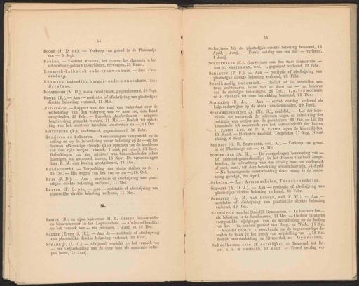 54 Rooeí (J. D. DE). — Verkoop van grond in de Plantaadje aan —, 6 Sept. Roomsch-katholiek burger- oude-mannenhuis. Zie: Brentano. RoosEBooM (A. D.), stads vroedvrouw, gepensioneerd, 28 Sept. RuIrENBERG (T.), nachtwacht, gepensioneerd, 16 Febr. Runderen en kalveren. — Verordeningen vastgesteld op de beffing en op de invordering eener belasting op de — en het daarvan afkomstige vleesch, (150 opcenten van de hoofdsom van den rijks accijns ; vleesch, 7 cent per pond), 21 Sept. Bedenkingen van den minister van binuenlandsche zaken daartegen en antwoord hierop, 16 Nov. De verordeningen door Z. M. den koning goedgekeurd, 28 Dec. Ruys (J. D.). — Aan — restitutie of afschrijving van plaat- selijke direkte belasting verleend, 11 Mei. s. Saarus (D.) en zijne huisvrouw M. E. KEssEr, binnenvader en binnenmoeder in het Leprozenhuis. — Afwijzend beschikt op het verzoek van — om pensioen, 1 Junij en 28 Dec. Schatters bij de plaatselijke direkte belasting benoemd, 13 April, 1 Junij. — Eervol ontslag aan een der — verleend, 1 Junij. ScmHarTEN (F. R.). — Aan — restitutie of afschrijving van plaatselijke direkte belasting verleend, 23 Febr. ScakkinG (F. J.). — Aan — eervol ontslag verleend als hulp-onderwijzer op de stads tusschenscholen, 29 Junij. ScaIMMELPENNINCK Jz. (Mr. G.), raadslid, — Lid der kom- missie tot onderzoek der adressen tegen de intrekking der restitutie van accijns aan de godshuizen, 26 Jan, — Lid der kommissie tot onderzoek van het bezwaarschrift der heeren 7, FABIUS J.CZ. en dr. H. FABIUS tegen de kiezerslijsten, 30 Maart. = Herkozen raadslid. Toegelaten, 17 Aug. Neemt zitting, 6 Sept. Schoolgeld van het Stedelijk Gymnasium. — In hoezerre het — als belasting is te beschouwen, 11 Mei. — De door curatoren voorgestelde wijzigingen van de verordening op de heffing van het — in handen gesteld van Burg. en Weth, 11 Mei, _— Voorstel coor ec. s. strekkende om de tegenwoordige do- centen te laten in het genot van vrijstelling van —, 18 Mei. Besluit naar aanleiding van dit voorstel, zie : Gymnasium. Schoolkommissie (Plaatselijke). — Benoemd tot lid: mr, H, B. M, DRIESSEN, 30 Maart. — Eervol ontslag ver- Rooken. — Voorstel MENDES, het — over het algemeen in het schouwburg-gebouw te verbieden, verworpen, 25 Maart. Rooru (F.). — Aan — restitutie of afschrijving van plaatselijke direkte belasting verleend, 11 Mei. Rundermarkt. — Verpachting der stads stallen op de —, 96 Oct. — Het wegen van het vee op de —, 26 Oct. Ruyrer (F. D. DE). — Aan — restitutie of afschrijving van plaatselijke direkte belasting verleend, 11 Mei. SaLTEr (Erven G. H.). — Aan de — restitutie of afschrijving van plaatselijke direkte belasting verleend, 23 Febr, SCHEEPMAKER (C.), sjouwerman aan den stads timmertuin. — Aan G, WESTERMAN, wed. —, gagement verleend, 23 Febr. Scheikundig onderzoek. — Besluit tot het aanstellen van twee ambtenaren, belast met het doen van — ten behoeve an de stedelijke belastingen, 26 Oct,; F. H. VAN MOORSEL en J. VROLIJK tot deze betrekking benoemd, 21 Dec. Scammrt (G. B. Scawerrz, wed. A.). — Verkoop van grond in de Plantaadje aan —, 18 Mei. Roomsch-katholiek oude-vrouwenhuis. — Zie: Jre- denburg. Rotterdam. — Rapport van den raad van waterstaat over de verbetering van den waterweg van — maar ZC6, den Raad aangeboden, 23 Febr. — Tusschen Amsterdam en — zal geen beurtverdrag gemaakt worden, 11 Mei. — Besluit tot ophef- fing van het beurtveer tusschen Amsterdam en —, 21 Dec. ScmaDE jr. (L. C.). — Afwijzend beschikt op het verzoek van _ om kwijtschelding van de door hem als aannemer beloo- pen boete, 15 Junij. SCHOEMAKER (A. H.). — De voorgedragen benoeming van — tot assistent-geneeskundige in het Binnen-Gasthuis aange- houden, in afwachting van den uitslag van een onderzoek of med. cand. tot deze betrekking benoembaar zijn, 13 April. _ Na bevestigende beantwoording dezer vraag is de benoe- ming gevolgd, 20 April. Scholen, — Zie: Armenscholen, Tus schenscholen. ScmoLTE (A. D. J.). — Aan — restitutie of afschrijving van plaatselijke direkte belasting verleend, 23 Febr. ScrHoLTEN (A. M. vaN BERGEN, wed. P. W.). — Aan — restitutie of afschrijving van plaatselijke direkte belasting verleend, 19 Jan.