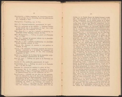 A * ® : i % * 58 Sluisdeuren. — Gelden toegestaan, ter voorziening in de kos- ten ten gevolge van de verwoesting door den paalworm aan de — aangerigt, 6 Sept. Sluisgelden (Verpachting van), 16 Nov. Suit (C.), korporaal-nachtwacht, gepensioneerd, 20 April. Suit (N.), benoemd tot gewonen schatter bij de plaatselijke direkte belasting, 13 April. Sneek. — De ontworpen verordening regelende het beurtveer tusschen Amsterdam en — in handen der kommissie voor de strafverordeningen gesteld, 19 Jan. Deze verordening vastgesteld, 30 Nov, SNoEk (A.), kommies der 2e klasse bij de plaatselijke accijn- sen en belastingen, gepensioneerd, 25 Maart. SpPAMER (J. H.), nachtwacht, gepensioneerd, 20 April. SPANSEERDER (A). — Verkoop van grond in de Plantaadje aan —, 18 Mei, 21 Sept. - SPELLERS (S.), benoemd tot makelaar in suiker, 28 Dec. SPLITGERBER (Mr. J. J.), raadslid. — Toegelaten, 17 Aug. Neemt zitting, 6 Sept. — Voorgedragen als lid van den Raad tot plaatsvervangend lid van den militieraad, 30 Nov. Spoorwegen. — Afschrift van een adres van den gemeente- raad van Schoonhoven aan 7. M. den koning betreffende de spoorwegverbinding, den Raad aangeboden; aangenomen voor kennisgeving, 26 Jan, — Op voorstel van den hr. RIJNDERS besloten zich tot de Hooge Regering te wenden in zake de aansluiting der Zuider —, en kommissie van redaktie be- noemd, 16 Febr. — Aan Burg. en Weth. opgedragen de door deze kommissie ontworpen adressen, aan Z. M. den koning en de Tweede Kamer der Staten-Generaal, te wijzi- gen, naar aanleiding van de eventueel door de leden in te dienen bedenkingen, en de stukken daarna op te zenden, 23 Febr. — Ontwerp eener spoorwegverbinding van het Nieu- wediep langs Alkmaar naar Haarlem, aangenomen voor me- dedeeling, 23 Febr. — Memorie over de spoorwegverbinding, door het gemeentebestuur van Roermonde den Raad medege- deeld, 9 Maart. — Adres der kamer van koophandel en fabrie- ken te Amsterdam aan den minister van binnenlandsche zaken, over de —, den Raad medegedeeld, 9 Maart. — Outwerp van een spoorwegnet, door P. BLANCHEMANCHE aan den Raad inge- zonden; aangenomen voor kennisgeving, 27 April. — Een geschrift getiteld: Een kort woord over de rigting van den Zuider-spoorweg, den Raad aangeboden, 18 Mei, — De bur- gemeester, op voorstel van den heer RIJNDERS, door den Raad uitgenoodigd, in overleg te treden met andere gemeen- tebesturen in het belang der door Amsterdam gewenschte rigting van den Zuider-spoorweg, 15 Junij. Mededeeling door den burgemeester van den uitslag zijner bemoeijingen ten deze, 18 Julij. — De Raad acht het onnoodig, een adres van adhaesie aan het adres van het gewestelijk bestuur van Noord-Holland, betreffende de rigting van den Zuider-spoor- weg, bij de Hooge Regering in te zenden, 13 Julij. — Na- dere mededeeling van den burgemeester aan den Raad, 27 Julij. — Adres door de kamer van koophandel en fabrieken te ’s Hertogenbosch ingezonden over de rigting van den Zuider-spoorweg, den Raad medegedeeld, 27 Julij. — Me- morie over de ontworpen rigting der — in Overijssel, inge- zonden door de kamer van koophandel en fabrieken te AZ- melo, den Raad medegedeeld, 17 Aug. ; aangenomen voor kennisgeving, 6 Sept. — Adressen van de kamers van koop- handel en fabrieken te ’s Hertogenbosch en Utrecht aan de Tweede Kamer der Staten-Generaal over den aanleg van —, den Raad medegedeeld, 17 Aug. — Adres van den Raad aan de Tweede Kamer der Staten-Generaal, tot verwerping van het door de regering ingediend ontwerp van wet tot bekrachtiging van eenige artikelen der verleende koncessiën voor den aan- leg en de exploitatie der Noorder- en Zuider—, 21 en 28 Sept. Adres van het Amsterdamsch-Utrechtsch spoorweg- comité aan de Tweede Kamer der Staten-Generaal terzelfde zake, den Raad medegedeeld, 28 Sept. — Adres der hh. @. 7. REERINK C. s. te Leeuwarden over de rigting der —, aan de Tweede Kamer, den Raad medegedeeld, 28 Sept.; aangeno- men voor kennisgeving, 5 Oet. — Voorstel BIENFAIT, tot het benoemen van eene raadskommissie om bij Z. M. aan te dringen op de gelijktijdige regeling bij ééne wet, naar den wensch van Amsterdam, van den aanleg van — en de Sur (J.), nachtwacht op het Stadhuis. — Afwijzend beschikt op het verzoek van — om pensioen, 17 Aug. Aan — eene gratifikatie van f 40 toegekend, 21 Sept. Sir (N.). — Aan — restitutie of afschrijving van plaatselijke direkte belasting verleend, 23 Febr. Sor (H. van). — Verkoop van grond in de Plantaadje aan —,20 Julij. Sur (Erven K.). — Aan de — restitutie of afschrijving van plaatselijke direkte belasting verleend, 23 Febr. Sur jr. (N.), benoemd tot makelaar in vaste goederen en mobilair, 20 Julij. Sur (MARGARETHA), — Verkoop van grond in de Plantaadje aan —, 6 Sept.