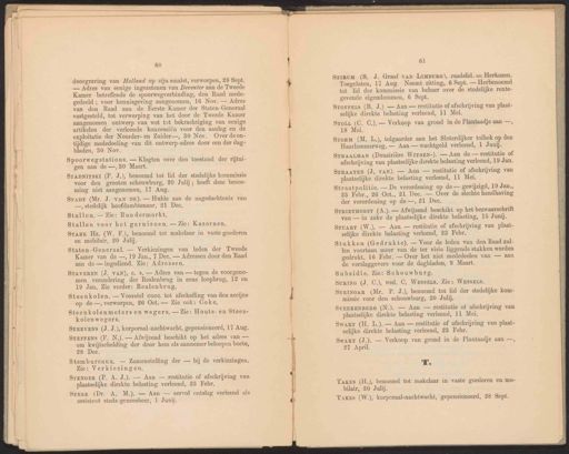 60 doorgraving van Holland op zijn smalst, verworpen, 28 Sept. — Adres van eenige ingezetenen van Deventer aan de Tweede Kamer betreffende de spoorwegverbinding, den Raad mede- gedeeld ; voor kennisgeving aangenomen, 16 Nov. — Adres van den Raad aan de Eerste Kamer der Staten-Generaal vastgesteld, tot verwerping van het door de Tweede Kamer aangenomen ontwerp van wet tot bekrachtiging van eenige artikelen der verleende koncessiën voor den aanleg en de exploitatie der Noorder-en Zuider—, 30 Nov. Over deon- tijdige mededeeling van dit ontwerp-adres door een der dag- bladen, 30 Nov. Spoorwegstations. — Klagten over den toestand der rijtui- gen aan de —,30 Maart. Staten-Generaal. — Verkiezingen van leden der Tweede Kamer van de —, 19 Jan, 7 Dec. — Adressen door den Raad aan de — ingediend. Zie: Adressen. STAVEREN (J. VAN), c. s. — Adres van — tegen de voorgeno- men verandering der Realenbrug in eene loopbrug, 12 en 19 Jan. Zie verder: Realenbrug. SrrrrENs (F. N.). — Afwijzend beschikt op het adres van — om kwijtschelding der door hem als aannemer beloopen boete, 28 Dec. Stembureaux. — Zamenstelling der — bij de verkiezingen. Zie: Verkiezingen. SrenGEr (P. A. J.). — Aan — restitutie of afschrijving van plaatselijke direkte belasting verleend, 23 Febr. Srerk (Dr. A. M.). — Aan — eervol ontslag verleend als assistent stads-geneesheer, 1 Junij. 61 Srirum (S. J. Graaf van Limeure), raadslid. — Herkozen. Toegelaten, 17 Aug. Neemt zitting, 6 Sept. — Herbenoemd tot lid der kommissie van beheer over de stedelijke rente- gevende eigendommen, 6 Sept. KA - Taxes (H.), benoemd tot makelaar in vaste goederen en mo- bilair, 20 Juli. Taxzs (W.), korporaal-nachtwacht, gepensioneerd, 28 Sept. SraDNITsKI (P. J.), benoemd tot lid der stedelijke kommissie voor den grooten schouwburg, 20 Julij ; heeft deze benoe- ming niet aangenomen, 17 Aug. Steenkolen. — Voorstel coo tot afschaffing van den accijns op de—, verworpen, 26 Oct. — Zie ook: Coke. Srorreis (B. J.) — Aan — restitutie of afschrijving van plaat- selijke direkte belasting verleend, 11 Mei. StTaDr (Mr. J. vaN DE). — Hulde aan de nagedachtenis van — ‚stedelijk hoofdambtenaar, 21 Dec. Steenkolenmetersen wegers, — Zie: Houts- en Steen- kolenwegers. Stor, (C. C.). — Verkoop van grond in de Plantaadje aan —, 18 Mei. Stallen. — Zie: Rundermarkt. STEEvENs (J. J.), korporaal-nachtwacht, gepensioneerd, 17 Aug. Srorm (M. L.), tolgaarder aan het Sloterdijker tolhek op den Haarlemmerweg. — Aan — wachtgeld verleend, 1 Junij. SrrAALMAN (Douairière WITSEN-). Aan de — restitutie of Stallen voor het garnizoen. — Zie: Kazernen. afschrijving van plaatselijke direkte belasting verleend, 19 Jan. Stark Hz. (W. F.), benoemd tot makelaar in vaste goederen en mobilair, 20 Julij. STRAATEN (J. VAN). — Aan — restitutie of afschrijving van plaatselijke direkte belasting verleend, 11 Mei, Straatpolitie. — De verordening op de — gewijzigd, 19 Jan, 23 Febr, 26 Oct., 21 Dec. — Over de slechte handhaving der verordening op de —, 21 Dec. STRIETHORST (A.). — Afwijzend beschikt op het bezwaarschrift van — in zake de plaatselijke direkte belasting, 15 Junij. Stuart (W.). — Aan — restitutie of afschrijving van plaat- selijke direkte belasting verleend, 23 Febr. Stukken (Gedrukte). — Voor de leden van den Raad zul- len voortaan meer van de ter visie liggende stukken worden gedrukt, 16 Febr. — Over het niet mededeelen van — aan de verslaggevers voor de dagbladen, 9 Maart. Subsidie. Zie: Schouwburg. SurInG (J. C.), wed. C, Wesseis. Zie: WESSELS. SurinGar (Mr. P. J.), benoemd tot lid der stedelijke kom- missie voor den schouwburg, 20 Julij. SvEERENBERG (N.). — Aan — restitutie of afschrijving van plaatselijke direkte belasting verleend, 11 Mei. Swart (H. L.). — Aan — restitutie of afschrijving van plaat- selijke direkte belasting verleend, 23 Febr. Swart (J.). — Verkoop van grond in de Plantaadje aan —, 27 April.