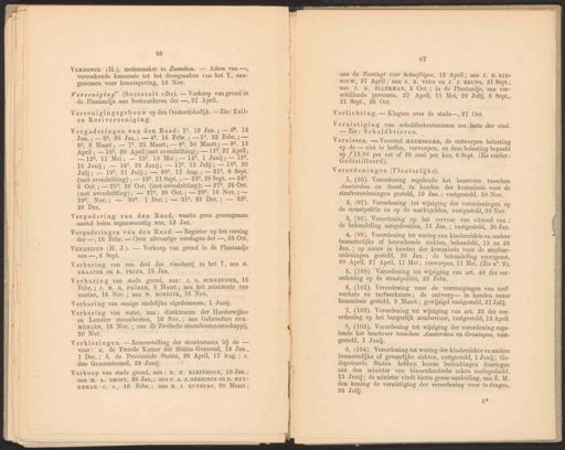 66 VerDoNcK (H.), molenmaker te Zaandam. — Adres van —, verzoekende koncessie tot het droogmaken van het Y, aan- genomen voor kennisgeving, 16 Nov. Vereeniging” (Societeit #De). — Verkoop van grond in de Plantaadje aan bestuurderen der —, 27 April. y igi csdijk. — Zie: Zeil- Vereenigingsgebouw op den Oosterdoksdij en Roeivereeniging. Vergaderingen van den Raad: 10. 12 Jan. ; — 20. 19 Jan,;— 80, 26 Jan.; — 40, 16 Febr.; — 50, 23 Febr; — 69, 9 Maart; — 70. 25 Maart; — 80, 30 Maart ; — 90, 13 April; — 100, 20 April (met avondzitting); — 119, 27 April; 12. 11 Mei; — 130. 18 Mei; — 140. 1 Junij; — 15%, 15 Junij; — 160, 29 Junij; — 179. 13 Juli; — 180, 20 Julij; — 190, 27 Julij; — 200. 17 Aug.; — 21°, 6 Be (met avondzitting) ; — 220. 21 Sept. ; — 230. 28 Sept. — 24. B Oct.;— 250. 26 Oct. (met avondzitting); — 270. 26 Oct. (met avondzitting); — 279. 28 Oct; — 280, 16 NI 990, Nov.; — 300, 7 Dee.; — 319. 21 Dec. ; — 320, 28 Dec. 67 aan de Toevlugt voor behoeftigen, 13 April; aan J. H. KIE- souw, 27 April; aan J. B. vous en J. J. BEUNS, 21 Sept; aan J. G. ELLERMAN, 5 Oct.; in de Plantaadje, aan ver- schillende personen, 27 April, 18 Mei, 20 Julij, 6 Sept, 21 Sept., 26 Oct. Verlichting. — Klagten over de stads—, 27 Oct. Vernietiging van schuldbekentenissen ten laste der stad. — Zie: Schuldbrieven. 9, (104). Verordening tot wering der kinderziekte en andere besmettelijke of gevaarlijke ziekten, vastgesteld, 1 Junij; Ge- deputeerde Staten hebben hunne bedenkingen daartegen aan den minister van binnenlandsche zaken medegedeeld, 15 Junij; de minister vindt hierin geene aanleiding, aan Z. M, den koning de vernietiging der verordening voor te dragen, 20 Julij. 5* Vergadering van den Raad, waarin geen genoegzaam aantal leden tegenwoordig was, 12 Jan. Vernissen, — Voorstel HEEMSKERK, de ontworpen belasting op de — niet te heffen, verworpen, en deze belasting bepaald op 19.80 per vat of 20 cent per kan, 6 Sept. (Zie verder : Gedistilleerd). Vergaderingen van den Raad. — Register op het verslag der —, 16 Febr. — Over uitvoerige verslagen der —, 28 Oct. Verordeningen (Plaatselijke). VERHEIJEN (H. J.). — Verkoop van grond in de Plantaadje aan —, 6 Sept. 1, (96). Verordening regelende het beurtveer tusschen Amsterdam en Sneek, in handen der kommissie voor de strafverordeningen gesteld, 19 Jan.; vastgesteld, 30 Nov. Verhuring van een deel der visscherij in het Y, aan H. KRAAIER en K. PRINS, 19 Jan. 2, (97). Verordening tot wijziging der verordeningen op de straatpolitie en op de marktgelden, vastgesteld, 30 Nov. Verhuring van stads grond, aan: J. G. SCHREUDER, 16 Febr.; 7. M. G. PRÖBER, 9 Maart; aan het ministerie van marine, 16 Nov.; aan W. KOEDIJK, 16 Nov. 3, (98). Verordening op het vervoer van vitriool enz, ; de behandeling aangehouden, 19 Jan. ; vastgesteld, 26 Jan. Verhuring van eenige stedelijke eigedommen, 1 Junij. 4, (99). Verordening tot wering van kinderziekte en andere besmettelijke of heerschende ziekten, behandeld, 19 en 26 Jan. ; op nieuw in handen der kommissie voor de strafver- ordeningen gesteld, 26 Jan.; de behandeling voortgezet, 20 April, 27 April, 11 Mei; verworpen, 11 Mei. (Zie n°. 9), Verhuring van water, aan: direkteuren der Harderwijker en Lemster stoombooten, 16 Nov.; aan Gebroeders ZUR- MÜHLEN, 16 Nov. ; aan de Zwolsche stoombootmaatschappij, 30 Nov. 5, (100). Verordening tot wijziging van art. 48 der ver- ordening op de straatpolitie, 23 Febr. Verkiezingen. — Zamenstelling der stembureaux bij de — voor: a. de Tweede Kamer der Staten-Generaal, 19 Jan, 7 Dec.; ò. de Provinciale Staten, 20 April, 17 Aug. ; c. den Gemeenteraad, 29 Junij. 6, (101). Verordening voor de vereenigingen van turf- werkers en turfwerksters; de ontwerp— in handen eener kommissie gesteld, 9 Maart; gewijzigd vastgesteld, 27 Julij. Verkoop van stads grond, aan: E. H. KLEINHOUT, 19 Jan.; aan H., A. DROST, 26 Jan,; aan C. A. S, GEESINCK en D. HEY- DEMAN c. s., 16 Febr,; aan B. J. KUYPERS, 30 Maart ; 7, (102). Verordening tot wijziging van art. 29 der ver- ordening op het burgerlijk armbestuur, vastgesteld, 13 April. 8, (103). Verordeuing tot wijziging der verordening rege- lende het beurtveer tusschen Amsterdam en Groningen, vast- gesteld, 1 Junij.
