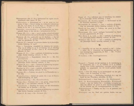 _—_— 76 WesrerwouDrT (Mr. F, Tu), herbenoemd tot regent over de huiszittende stads armen, 21 Dec. Wethouders. — Herbenoemd tot — de hh. BERG en VAN BOSsE, 6 Sept. — Eervol ontslag als wethouder verleend aan den hr. VAN BOssE, 21 en 28 Sept. — Benoemd tot wet- houder de hr. mr. J. R. CORVER HOOFT, 5 Oct. Wiepouw (H. B.), nachtwacht van het Stadhuis. — Op het verzoek van — om pensioen afwijzend beschikt, 17 Aug.; idem om gratifikatie, 26 Oct, 11 Wourr (P. N.), sollicitant naar de betrekking van schatter bij de plaatselijke direkte belasting, 1 Junij. WoLTERBEEK (R. DANIËL). — Aan — restitutie of afschrij- ving van plaatselijke direkte belasting verleend, 19 Jan. WouDE (A. VAN DER). — Verkoop van grond in de Plan- Wux (Erven J. A. van). — Aan — restitutie of afschrijving van plaatselijke direkte belasting verleend, 23 Febr. WuRrrBAIN J.Sz. (J. C.). — Aan — restitutie of afschrijving van plaatselijke direkte belasting verleend, 11 Mei. We Y.— Verhuring van een deel der visscherij in het —, 19 Jan. — Adres van w. VERDONCK, tot droogmaking van het —, voor kennisgeving aangenomen, 16 Nov. — Zie: Verhu- ring van water. Y-werken. — Zie: Aanlegplaatsen, z. Zaagsel. — Voorstel, tot het opnemen in de verordening op de straatpolitie, dat — 1°. in bekleede en 2°. in bedekte manden moet worden opgeheschen, verworpen wat het eerste gedeelte, en aangenomen wat het tweede gedeelte betreft, 23 Febr. Zandbestorting. — Mededeeling betreffende de — aan het hoofd bij den Westelijken afsluitdijk, 23 Febr. Zeeburgervaart. — Land langs de —. Zie: Muiderpoort. Zeil- en Roeivereeniging (Koninklijke Nederland- sche). — Aan het bestuur der — voorloopig toezegging ge- daan van afstand van grond en water bij de Oosterdoksluis, tot het plaatsen van een vereenigingsgebouw, 16 Febr. Ziektetoestand. — Verslag van den — in de gemeente over 1858, 21 Dee, Zittingen van den Raad met gesloten deuren, voor zoo En sns Wettelijke voorschriften. — De voorschriften van Gede- puteerde Staten al dan niet als — te beschouwen, 28 Oct. WiEGaAND (C.), benoemd tot gewonen schatter bij de plaatselijke direkte belasting, 18 April. WortERrBEEK (R. Dantët), raadslid. — Herbenoemd tot lid der financiële kommissie, 6 Sept. taadje aan —, 27 April. WouDENBERG (B.), eervol ontslagen keurmeester van brood en meel, gepensioneerd, 29 Junij. Zand. — Over het toezigt op de hoedanigheid van het gele- verde — voor de bestrating, 16 Febr. WIARDA (Dr. J.). — Aan — eervol ontslag verleend als leeraar in de hebreeuwsche taal aan het Stedelijk Gymnasium, 13 Julij. Wijn. — Verordening vastgesteld tot wijziging der verorde- ning op de heffing en op de invordering van de belasting op — en kunstwijn, 16 Nov.; door Z. M. den koning goed- gekeurd, 28 Dec. WiixeENs (C. J.). — Aan — restitutie of afschrijving van plaat- selijke direkte belasting verleend, 11 Mei. Willemspoort. — Begraafplaats buiten de —. Zie: Be- graafplaats. Wing (Wed. A. G.). — Aan — restitutie of afschrijving van plaatselijke direkte belasting verleend, 11 Mei. WiLLING (S. A.). — Aan — restitutie of afschrijving van plaat- selijke direkte belasting verleend, 23 Febr. WiLLINK (A. F.). — Aan — restitutie of afschrijving van plaat- selijke direkte belasting verleend, 19 Jan. WiLLinK (H.). — Verkoop van grond in de Plantaadje aan —, 20 Julij. Winkelkasten. — Besluit tot amotie der — aan de Nieuwe- stads-herbergbrug, 13 April. Winterbedeeling. — Zie: Huiszittenhuis. WissEL (J.). — Overname door — van grond, vroeger door de stad aan J. VAN BREEMEN verkocht, 18 Mei. Wisselbank. — Regeling der kosten van het schoonmaken der lokalen van de gewezen —, 26 Oct. WirrErING (J.). — Aan — restitutie of afschrijving van plaatse- lijke direkte belasting verleend, 23 Febr. Wop (J. B. TER). — Zie: Pornorr (H.)