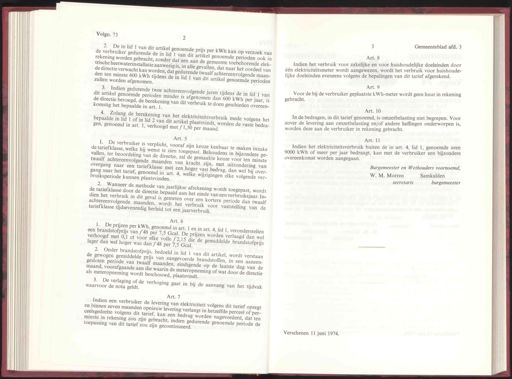 Volgn. 73 2 3 Gemeenteblad afd. 3 2.17) de verbru Art. 8 : q : or Indien het verbruik voor zakelijke en voor Aeneas geleiden Goe één elektriciteitsmeter wordt aangewezen, wordt het verorui Se lijke doeleinden eveneens volgens de bepalingen van dit tarief afg Art. 9 Voor de bij de verbruiker geplaatste kWh-meter wordt geen huur in rekening 3. Indien gedurende twee achtereenvolgende jaren tijdens de in lid l van 00 IJ dit artikel genoemde perioden minder is afgenomen dan 600 kWh per jaar, is gebracht. de directie bevoegd, de berekening van dit verbruik te doen geschieden overeen- Art. 10 6 komstig het bepaalde in art. |, In de bedragen, in dit tarief genoemd, is omzetbelasting niet Ver : eN 3 ? : onderw ij) 4. Zolang de berekening van het elektriciteitsverbruik mede volgens het zover de levering aan omzetbelasting en/of andere heffingen bepaalde in lid 1 of in lid 2 van dit artikel] plaatsvindt, worden de vaste bedra- worden deze aan de verbruiker in rekening gebracht. gen, genoemd in art. 1, verhoogd met 1,50 per maand. i Art. : | ; 4 Indien het elektriciteitsverbruik buiten de in art. 4, DaT se 9000 kWh of meer per jaar bedraagt, kan met de verbruiker een bij in bijzondere ge- overeenkomst worden aangegaan. te keuze voor ten minste Burgemeester en Wethouders voornoemd, met uitzondering van s . » E amkalden overgang naar een tarief klas drag, dan wel bij over- W. M. Morren : ; Je ei meester gang naar het tarief, genoemd in art. 4, welke wijzigingen elke volgende ver- secretaris burge bruiksperiode kunnen plaatsvinden. 2. Wanneer de methode van Jaarlijkse afrekening wordt toegepast, wordt de tarief klasse door de directie bepaald aan het einde vaneen verbruiksjaar. Indien het verbruik in dit geval is gemeten over een kortere periode dan twaalf achtereenvolgende maanden, wordt het verbruik voor vaststelling van de tarief klasse tijdsevenredig herleid tot een jaarverbruik. Art. 6 l. De prijzen per kWh, genoemd in art. | en in art. 4, lid 1, veronderstellen een brandstofprijs van {48 per 7,5 Gcal. De prijzen worden verlaagd dan wel verhoogd met 0,1 ct voor elke volle f2,15 die de gemiddelde brandstofprijs lager dan wel hoger was dan 48 per 7,5 Gcal. an dit artikel, wordt verstaan Art: Indien een verbruiker de levering van elektriciteit volgens dit tarief opzegt en binnen zeven maanden opnieuw levering verlangt in hetzelfde perceel of perceelsgedeelte volgens dit tarief, kan een bedrag worden nagevorderd, dat ten minste in rekening zou zijn gebracht, indien gedurende genoemde periode de toepassing van dit tarief zou zijn gecontinueerd. Verschenen 11 juni 1974. brandstoffen, in een aaneende op de laatste dag van de meteropneming of wat door de directie laatsvindt.