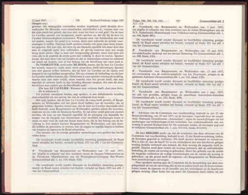 12 juni 1957 756 (Seegers e.a.) Holland-Festival, volgn. 510 De voordracht wordt zonder hoofdelijke stemming goedgekeurd; de Raad neemt mitsdien het besluit, vermeld op bladz. 853 van afd. 1 van het Gemeente- blad. 3° Voordracht van Burgemeester en Wethouders van 23 mei 1957, tot uitgifte in erfpacht van drie terreinen tussen de Jacques Veltmanstraat en de Theodorus Majofskistraat aan de Woningbouwvereniging Het Westen (Gemeenteblad afd. 1, no. 510, bladz. 828). De voordracht wordt zonder discussie en hoofdelijke stemming goedge- keurd; de Raad neemt mitsdien het besluit, vermeld op bladz. 829 van afd. 1 van het Gemeenteblad. Volgn. 544, 509, 516, 543, 757 513—514 De voordracht wordt zonder discussie en hoofdelijke stemming goedge- keurd; de Raad neemt mitsdien het besluit, vermeld op bladz. 861 van afd. 1 van het Gemeenteblad. Gemeenteblad afd. 2 5° Voordracht van Burgemeester en Wethouders van 23 mei 1957, tot onderhandse aankoop van het perceel Sloterweg 782 (Gemeenteblad afd. 1, no. 509, bladz. 826). De voordracht wordt zonder discussie en hoofdelijke stemming goedge- keurd; de Raad neemt mitsdien het besluit, vermeld op bladz. 827 van afd. 1 van het Gemeenteblad. 6° Voordracht van Burgemeester en Wethouders van 23 mei 1957, tot overneming van de onderhoudsplicht van het Zwartepad, gelegen in de gemeente Aalsmeer (Gemeenteblad afd. 1, no. 516, bladz. 839). De voordracht wordt zonder discussie en hoofdelijke stemming goedge- keurd; de Raad neemt mitsdien het besluit, vermeld op bladz. 840 van afd. 1 van het Gemeenteblad. 7? Voordracht van Burgemeester en Wethouders van 1 juni 1957, tot ruil van gronden, gelegen langs de spoorbaan Amsterdam-Zaandam (Gemeenteblad afd. 1, no. 543, bladz. 859). De voordracht wordt zonder discussie en hoofdelijke stemming goedge- keurd; de Raad neemt mitsdien het besluit, vermeld op bladz. 859 van afd. 1 van het Gemeenteblad. 8° Adviezen van de Commissie van voorbereiding, bedoeld in art. 22 der Bouwverordening, van 23 mei 1957, op de beroepen, ingesteld door de naam]. venn. Nationale Grondtrustee ‚„„Amsterdam”’, tegen de aanschrijvingen tot het aanbrengen van verbeteringen en het verrichten van onderhoudswerk aan een woning in perceel Kinkerstraat 92. De conclusies luiden, de beroepen gegrond te verklaren (Gemeenteblad afd. 1, nos. 513-514, bladz. 833-835). De heer SEEGERS merkt op, dat de conclusies van deze adviezen van de Commissie van voorbereiding, bedoeld in art. 22 der Bouwverordening, luiden, de beroepen gegrond te verklaren. Dit heeft spreker bevreemd en verontrust. Wat is hier nl. aan de hand? Er is een winkelpand met een daarboven gelegen woning destijds verhuurd aan iemand, die deze woning als magazijn heeft in- gericht. Daarna werd deze ruimte als woning verhuurd, met de uitdrukkelijke bedoeling, de ruimte als woning te gebruiken. Door het gebruik van de ruimte als magazijn ontbraken de nodige voorzieningen om de ruimte als woning te gebruiken; op die grond heeft de eigenaar van Burgemeester en Wethouders twee aanschrijvingen ontvangen. geweest. Als belangrijke voorstellen werden ingediend, zoals destijds door wethouder De Miranda, voor zwembaden, markthallen e.d., vernam men van die zijde steeds het geluid: dat kan niet, want het kost te veel geld! Nu de heer Le Cavelier spreekt van hoogmoed, merkt spreker op, dat hij bij de heer Le Cavelier kleinmoedigheid constateert. Wanneer men van Amsterdam een stad wil maken, waarin het goed is te wonen, dient men culturele en sociale voor- zieningen te treffen. Daaraan heeft sprekers fractie vele jaren haar beste krach- ten gegeven. Het kan zijn, dat men op een bepaald ogenblik iets meer doet dan men in volgende jaren kan volhouden, als gevolg waarvan men een stapje terug moet zetten. Dan is men niet hoogmoedig geweest, maar had men een visie, die in de praktijk de eerste jaren niet volledig is door te voeren. Spreker hoopt, dat men deze visie zal houden en dat in Amsterdam sociaal en cultureel tot stand zal komen, wat in het belang van de bevolking van onze stad is. 4 Voordracht van Burgemeester en Wethouders van 1 juni 1957, tot uitgifte in erfpacht van twee terreinen aan de Johan Huizingalaan aan de N.V. Nederlandse Maatschappij voor Volkshuisvesting (Gemeenteblad afd. 1, no. 544, bladz. 861). Naar sprekers mening gaat de Commissie bij de beoordeling van deze aan- gelegenheid uit van de opvatting, dat zij iets te maken heeft met de huurovereen- komst tussen de eigenaar en de huurder van het winkelpand en de daarboven gelegen woning. Daar komt het op neer! De Gemeente heeft echter bij het De VOORZITTER, wethouder DE ROOS, meent, dat de heer Le Cavelier het woord, waarover reeds meer werd gesproken, heeft misverstaan. Spreker zou niet gaarne willen beweren, dat de heer Le Cavelier en de zijnen ooit iemand in de rug hebben aangevallen. Dit zou nimmer de bedoeling van de heer Le Cavelier hebben kunnen zijn. Defaitisme is naar sprekers mening de houding, waarin men niet meer strijdt, maar waarbij men het gevoel heeft, dat men eigenlijk al verloren heeft en zijn houding daaraan aanpast. Als men dit doet, berokkent men nadeel aan de betreffende zaak! [De heer LE CAVELIER: Wanneer men verloren heeft, doet men beter, dit te erkennen !] Uit politiek standpunt bezien, zegt spreker, is een defaitistische houding even schadelijk als een aanval, die van de verkeerde kant komt. Het spijt spreker, dat de heer Le Cavelier de vraag heeft gesteld, of Burge- meester en Wethouders wel het juiste besef hebben van de woorden, die zij gesproken hebben. Spreker neemt aan, dat de heer Le Cavelier daarmede niets heeft bedoeld, want Burgemeester en Wethouders spreken alleen die woorden, waarvan zij ten volle de betekenis beseffen. Er zal zeker strijd geleverd moeten worden, als men op een bepaald ogenblik bij de afweging van bepaalde be- langen van de burgerij van Amsterdam voor moeilijke beslissingen komt te staan en men voor de stad een keuze moet doen, die in het belang van de be- volking is. Iets anders ku