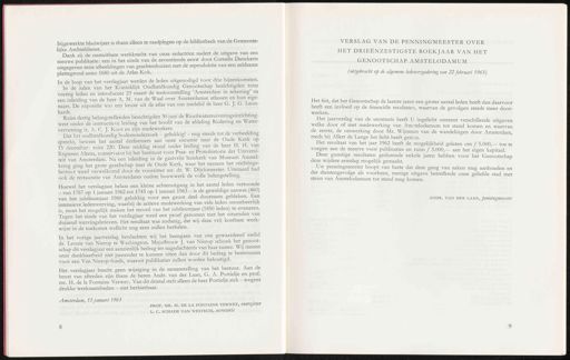 bijgewerkte bladwijzer is thans alleen te raadplegen op de bibliotheek van de Gemeente- lijke Archiefdienst . Dank zij de onstuitbare werkkracht van onze redactrice nadert de uitgave van een nieuwe publikatie : een in het einde van de zeventiende eeuw door Cornells Danckerts uitgegeven serie afbeeldingen van grachtenhuizen met de reproduktie van een zeldzame plattegrond anno 1680 uit de Atlas Kok . In de loop van het verslagjaar werden de leden uitgenodigd voor drie bijeenkomsten . In de zalen van het Koninklijk Oudheidkundig Genootschap bezichtigden ruim veertig leden en introducees 23 maart de tentoonstelling ' Amsterdam in tekening ' na een inleiding van de heer A . M . van de Waal over Amsterdamse atlassen en hun eige- naars . De expositie was een keuze uit de atlas van ons medelid de heer G . J . G . Leon - hardt . -^ . .. ju * Ruim dertig belangstellenden bezichtigden 30 juni de Rioolwaterzuiveringsinnchting- west onder de instructieve leiding van het hoofd van de afdeling Riolering en Water- verversing ir . A . C . J . Koot en zijn medewerkers . Dat het oudheidkundig bodemonderzoek - gelukkig ! - nog steeds tot de verbeelding spreekt , bewees het aantal deelnemers aan onze excursie naar de Oude Kerk op 15 december : ruim 220 . Deze middag stond onder leiding van de heer H . H . van Regieren Altena , conservator bij het Instituut voor Prae - en Protohistorie der Universi- teit van Amsterdam . Na een inleiding in de gastvrije huiskerk van Museum Amstel- kring ging het grote gezelschap naar de Oude Kerk , waar het namens het stichtings- bestuur werd verwelkomd door de voorzitter mr . dr . W . Dijckmeester . Uiteraard had ook de restauratie van Amsterdams oudste bouwwerk de volle belangstelling . Hoewel het verslagjaar helaas een kleine achteruitgang in het aantal leden vertoonde - van 1767 op 1 januari 1962 tot 1743 op 1 januari 1963 - is de geweldige aanwas ( 460 ) van het jubileumjaar 1960 gelukkig voor een groot deel duurzaam gebleken . Een intensieve ledenwerving , waarbij de actieve medewerking van vele leden onontbeerlijk is , moet het mogelijk maken het record van het jubileumjaar ( 1850 leden ) te evenaren . Tegen het einde van het verslagjaar werd een proef genomen met het uitzenden van duizend wervingsbrieven . Het resultaat was zodanig , dat wij deze vrij kostbare werk- wijze in de toekomst wellicht nog eens zullen herhalen . In het vorige jaarverslag herdachten wij het heengaan van ons gewaardeerd erelid dr . Leonie van Nierop te Washington . Mejuffrouw J . van Nierop schonk het genoot- schap dit verslagjaar een aanzienlijk bedrag ter nagedachtenis van haar zuster . Wij menen onze dankbaarheid niet passender te kunnen uiten dan door dit bedrag te bestemmen voor een Van Nierop-fonds , waaruit publikaties zullen worden bekostigd . Het verslagjaar bracht geen wijziging in de samenstelling van het bestuur . Aan de beurt van aftreden zijn thans de heren Andr . van der Laan , G . A . Portielje en prof . mr . H . de la Fontaine Verwey . Van dit drietal stelt alleen de heer Portielje zich - wegens drukke werkzaamheden - niet herkiesbaar . Amsterdam , 15 januari 1963 PROF . MR . H . DE LA FONTAINE VERWEY , voorzitter L . c . schade van WESTRUM , secretaris VERSLAG VAN DE PENNINGMEESTER OVER HET DRIEËNZESTIGSTE BOEKJAAR VAN HET GENOOTSCHAP AMSTELODAMUM ( uitgebracht op de algemene ledenvergadering van 22 februari 1963 ) Het feit , dat het Genootschap de laatste jaren een groter aantal leden heeft dan daarvoor heeft een invloed op de financiële resultaten , waarvan de gevolgen steeds meer door- werken . Het jaarverslag van de secretaris heeft U ingelicht omtrent verschillende uitgaven welke door of met medewerking van Ametelodamum tot stand komen en waarvan de eerste , de omwerking door Mr . Wijnman van de wandelingen door Amsterdam , reeds bij Allert de Lange het licht heeft gezien . Het resultaat van het jaar 1962 heeft de mogeüjkheid gelaten om ƒ 5.000 ,— toe te voegen aan de reserve voor publicaties en ruim ƒ 3.000 ,— aan het eigen kapitaal . Deze gunstige resultaten gedurende enkele jaren hebben voor het Genootschap deze wijdere armslag mogelijk gemaakt . Uw penningmeester hoopt van harte dat deze gang van zaken mag aanhouden en dat dientengevolge als voorheen , menige uitgave betreffende onze geliefde stad met steun van Amstelodamum tot stand mag komen . andr . van der laan , penningmeester 9
