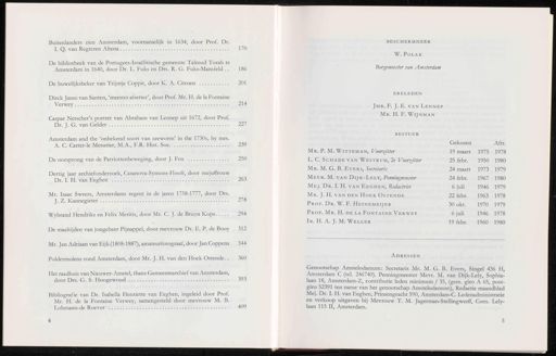 Buitenlanders zien Amsterdam , voornamelijk in 1634 , door Prof . Dr . I . Q . van Regteren Altena 170 De bibliotheek van de Portugees-Israëlitische gemeente Talmud Torah te Amsterdam in 1640 , door Dr . L . Fuks en Drs . R . G . Fuks-Mansfeld . 186 De huwelijksbeker van Trijntje Coppit , door K . A . Citroen 201 Dirck Jansz van Santen , ' meester afsetter ', door Prof . Mr . H . de la Fontaine Verwey 214 Caspar Netscher's portret van Abraham van Lennep uit 1672 , door Prof.Dr . J . G . van Gelder 227 Amsterdam and the ' onbekend soort van zeeworm ' in the 1730s , by mrs.A . C . Carter-Ie Mesurier , M.A ., F.R . Hist . Soc 239 De oorsprong van de Patriottenbeweging , door J . Fox 250 Dertig jaar archiefonderzoek , Casanova-Symons-Hooft , door mejuffrouwDr . I . H . van Eeghen 263 Mr . Isaac Sweers , Amsterdams regent in de jaren 1758-1777 , door Drs . J . Z . Kannegieter 278 Wybrand Hendriks en Felix Meritis , door Mr . C . J . de Bruyn Kops 294 De maaltijden van jongeheer Pijnappel , door mevrouw Dr . E . P . de Booy 312 Mr . JanAdriaanvanEijk(1808-1887),amateurfotograaf , door Jan Coppens 344 Poldermolens rond Amsterdam , door Mr . J . H . van den Hoek Ostende . . 360 Het raadhuis van Nieuwer-Amstel , thans Gemeentearchief van Amsterdam , door Drs . G . S . Hoogewoud 393 Bibliografie van Dr . Isabella Henriette van Eeghen , ingeleid door Prof.Mr . H . de la Fontaine Verwey , samengesteld door mevrouw M . B.Lohmann- de Roever 409 4 BESCHERMHEER W . Polak Burgemeester van Amsterdam ERELEDEN Jhr . F . J . E . van Lennep Mr . H . F . Wijnman Gekozen 19 maart 25 febr . 24 maart 24 febr . 6 juli 22 febr . 30 okt . 6 juli 19 febr . BESTUUR Aftr . 1978 1980 1979 1980 1979 1978 1979 1978 1980 1975 1950 1973 1967 1946 1963 1970 1946 1960 Mr . P . M . Wit tem an , Voorzitter L . C . Schade van Westrum , 2e Voorzitter Mr . M . G . B . Evers , Secretaris Mevr . M . van Dijk-Lely , Penningmeester Mej . Dr . I . H . van Eeghen , Redactrice Mr . J . H . van den Hoek Ostende Prof . Dr . W . F . Heinemeijer Prof . Mr . H . de la Fontaine Verwey Ir . H . A . J . M . Weller Adressen Genootschap Amstelodamum : Secretaris Mr . M . G . B . Evers , Singel 436 H , Amsterdam C ( tel . 246740 ). Penningmeester Mevr . M . van Dijk-Lely , Sophia- Jaan 18 , Amsterdam-Z , contributie leden minimum / 35 , ( gem . giro A 65 , post- giro 52391 ten name van bet genootschap Amstelodamum ), Redactie maandblad Mej . Dr . I . H . van Eeghen , Prinsengracht 590 , Amsterdam-C . Ledenadministratie en verkoop uitgaven bij Mevrouw T . M . Jagerman-Stellingwerff , Corn . Lely- laan 115 II , Amsterdam . 5
