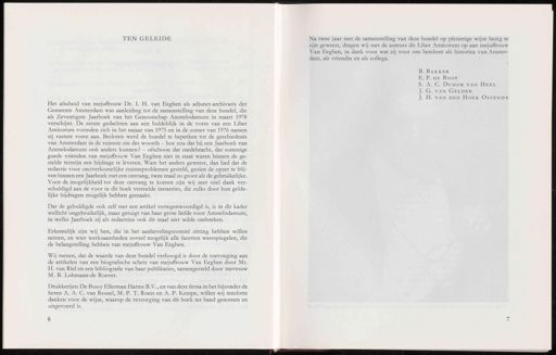 TEN GELEIDE Het afscheid van mejuffrouw Dr . I . H . van Eeghen als adjunct-archivaris der Gemeente Amsterdam was aanleiding tot de samenstelling van deze bundel , die als Zeventigste Jaarboek van het Genootschap Amstelodamum in maart 1978 verschijnt . De eerste gedachten aan een huldeblijk in de vorm van een Liber Amicorum vormden zich in het najaar van 1975 en in de zomer van 1976 namen zij vastere vorm aan . Besloten werd de bundel te beperken tot de geschiedenis van Amsterdam in de ruimste zin des woords - hoe zou dat bij een Jaarboek van Amstelodamum ook anders kunnen ? - ofschoon dat medebracht , dat sommige goede vrienden van mejuffrouw Van Eeghen niet in staat waren binnen de ge- stelde termijn een bijdrage te leveren . Ware het anders geweest , dan had dat de redactie voor onoverkomelijke ruimteproblemen gesteld , gezien de opzet te blij- ven binnen een Jaarboek met een omvang , twee maal zo groot als de gebruikelijke . Voor de mogelijkheid tot deze omvang te komen zijn wij zeer veel dank ver- schuldigd aan de voor in dit boek vermelde instanties , die zulks door hun gelde- lijke bijdragen mogelijk hebben gemaakt . Dat de gehuldigde ook zelf met een artikel vertegenwoordigd is , is in dit kader wellicht ongebruikelijk , maar getuigt van haar grote liefde voor Amstelodamum , in welks Jaarboek zij als redactrice ook dit maal niet wilde ontbreken . Erkentelijk zijn wij hen , die in het aanbevelingscomité zitting hebben willen nemen , en wier werkzaamheden zoveel mogelijk alle facetten weerspiegelen , die de belangstelling hebben van mejuffrouw Van Eeghen . Wij menen , dat de waarde van deze bundel verhoogd is door de toevoeging aan de artikelen van een biografische schets van mejuffrouw Van Eeghen door Mr . H . van Riel en een bibliografie van haar publikaties , samengesteld door mevrouw M . B . Lohmann-de Roever . Drukkerijen De Bussy Ellerman Harms B.V ., en van deze firma in het bijzonder de heren A . A . C . van Reusel , M . P . T . Roest en A . P . Kempe , willen wij tenslotte danken voor de wijze , waarop de verzorging van dit boek ter hand genomen en uitgevoerd is . Na twee jaar met de samenstelling van deze bundel op plezierige wijze bezig te zijn geweest , dragen wij met de auteurs dit Liber Amicorum op aan mejuffrouw Van Eeghen , in dank voor wat zij voor ons betekent als historica van Amster- dam , als vriendin en als collega . B . Bakker E . P . de Booy S . A . C . Dudok van Heel J . G . van Gelder J . H . van den Hoek Ostende 6 MtttfUaiMcMatfMhMMMMaMiue ^