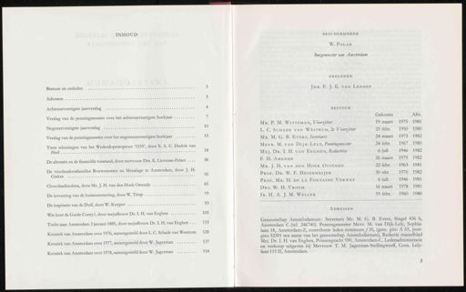 INHOUD Bestuur en ereleden 3 Adressen Achtenzeventigste jaarverslag Verslag van de penningmeester over het achtenzeventigste boekjaar Negenzeventigste jaarverslag Verslag van de penningmeester over het negenenzeventigste boekjaar 15 Twee tekeningen van het Wederdopersoproer ' 1535 ', door S . A . C . Dudok van Heel 18 De alteratie en de financiële toestand , door mevrouw Drs . E . Lievense-Pelser 38 De vioolmakersfamilies Bouwmeester en Menslage te Amsterdam , door J . H.Giskes Chocolaadmolens , door Mr . J . H . van den Hoek Ostende 65 De invoering van de huisnummering , door W . Timp De inspiratie van de Duif , door W.Kuyper Wie kent de Guide Conty ?, door mejuffrouw Dr . I . H . van Eeghen 105 Tocht naar Amsterdam 3 januari 1885 , door mejuffrouw Dr . I . H . van Eeghen .. 115 Kroniek van Amsterdam over 1976 , samengesteld door L . C . Schade van Westrum 128 Kroniek van Amsterdam over 1977 , samengesteld door W . Jagerman 137 Kroniek van Amsterdam over 1978 , samengesteld door W . Jagerman 154 BESCHERMHEER W . Polak Burgemeester van Amsterdam ERELEDEN Jhr . F . J . E . van Lennep BESTUUR Gekozen Aftr . 19 maart 1975 1981 25 febr . 1950 1980 24 maart 1973 1982 24 febr . 1967 1980 6 juli 1946 1982 26 maart 1979 1982 22 febr . 1963 1981 30 okt . 1970 1982 6 juli 1946 1981 16 maart 1978 1981 19 febr . 1960 1980 Mr . P . M . Witteman , Voorzitter L . C . Schade van Westrum , 2e Voorzitter Mr . M . G . B . Evers , Secretaris Mevr . M . van Dijk-Lely , Penningmeester Mej . Dr . I . H . van Eeghen , Redactrice F . H . Amende Mr . J . H . van den Hoek Ostende Prof . Dr . W . F . Heinemeijer Prof . Mr . H . de la Fontaine Verwey Drs . W . H . Vroom Ir . H . A . J . M . Weller Adressen Genootschap Amstelodamum : Secretaris Mr . M . G . B . Evers , Singel 436 h , Amsterdam C ( tel . 246740 ). Penningmeester Mevr . M . van Dijk-Lely , Sophia- laan 18 , Amsterdam-Z , contributie leden minimum ƒ 35 , ( gem . giro A 65 , post- giro 52391 ten name van het genootschap Amstelodamum ), Redactie maandblad Mej . Dr . I . H . van Eeghen , Prinsengracht 590 , Amsterdam-C . Ledenadministratie en verkoop uitgaven bij Mevrouw T . M . Jagerman-Stellingwerff , Corn . Lely- laan 115 II , Amsterdam . 3