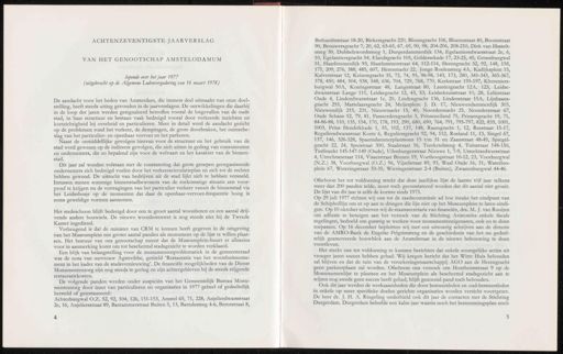 ACHTENZEVENTIGSTE JAARVERSLAG VAN HET GENOOTSCHAP AMSTELODAMUM lopende over het jaar 1977 ( uitgebracht op de Algemene Ledenvergadering van 16 maart 1978 ) De aandacht voor het heden van Amsterdam , die immers deel uitmaakt van onze doel- stelling , heeft steeds uiting gevonden in de jaarverslagen . De ontwikkelingen die daarbij in de loop der jaren werden gesignaleerd betroffen vooral de lotgevallen van de oude stad , in haar structuur en bestaan vaak bedreigd vooral door verkeerde inzichten en kortzichtigheid bij overheid en particulieren . Meer in detail werd de aandacht gericht op de problemen rond het verkeer , de dempingen , de grote doorbraken , het ruimtebe- slag van het particulier - en openbaar vervoer en het parkeren . Naast de onmiddellijke gevolgen hiervan voor de structuur en het gebruik van de stad werd gewezen op de indirecte gevolgen , die zich uitten in gedrag van consumenten en ondernemers , die zo bepalend zijn voor de welvaart en het karakter van de binnen- stad . Dit jaar zal worden volstaan met de constatering dat grote groepen georganiseerde ondernemers zich bedreigd voelen door het verkeerscirculatieplan en zich tot de rechter hebben gewend . De uittocht van bedrijven uit de stad lijkt zich te hebben versneld . • Intussen menen sommige binnenstadbewoners van de toekomstige situatie een voor- proef te krijgen nu de vertragingen van het particulier verkeer vanuit de binnenstad via het Leidsebosje op de momenten dat daar de openbaar-vervoer-frequentie hoog is soms geweldige vormen aannemen . Het stedeschoon blijft bedreigd door een te groot aantal woonboten en een aantal drij- vende andere bouwsels . De nieuwe woonbotenwet is nog steeds niet bij de Tweede Kamer ingediend . Verheugend is dat de minister van CRM te kennen heeft gegeven in de omgeving van het Museumplein een groter aantal panden als monument op de lijst te willen plaat- sen . Het bestuur van ons genootschap meent dat de Museumplein-buurt er alleszins voor in aanmerking komt om tot beschermd stadsgezicht te worden verklaard . Een blijk van belangstelling voor de monumentenproblematiek in de gemeenteraad was de nota van mevrouw Agsteribbe , getiteld ' Restauratie van het woonhuismonu- ment in het kader van de stadsvernieuwing '. De financiële mogelijkheden van de Dienst Monumentenzorg zijn nog steeds te gering en zijn achtergebleven bij de steeds stijgende restauratiekosten . De volgende panden werden onder auspiciën van het Gemeentelijk Bureau Monu- mentenzorg door inzet van ^ particulieren en organisaties in 1977 geheel of gedeeltelijk hersteld of gerestaureerd : Achterburgwal O.Z . 52 , 92 , 104 , 126 , 151-153 , Amstel 65 , 71 , 228 , Anjelierdwarsstraat 2e , 16 , Anjeliersstraat 89 , Bantammerstraat Buiten 5,13 , Barndesteeg 4-6 , Berenstraat 8 , Bethaniënstraat 18-20 , Bickersgracht 220 , Bloemgracht 106 , Bloemstraat 40 , Boomstraat 90 , Brouwersgracht 7 , 20 , 62 , 63-65 , 67 , 69 , 90 , 98 , 204-206 , 208-210 , Dirk van Hasselt- steeg 50 , Dubbelewordtsteeg 1 , Durgerdammerdijk 134 , Egelantiersdwarsstraat 2e , 6 , 10 , Egelantiersgracht 54 , Elandsgracht 105 , Geldersekade 17 , 23-25 , 45 , Groenburgwal 51 , Haarlemmerdijk 93 , Haarlemmerstraat 64 , 112-114 , Herengracht 32 , 92 , 148 , 158 , 171 , 209 , 276 , 388 , 485 , 607 , Herenmarkt 22 , Jonge Roelensteeg 4A , Kadijksplein 15 , Kalverstraat 12 , Keizersgracht 35 , 72 , 74 , 95 , 96-98 , 143 , 173 , 280 , 341-343 , 365-367 , 378 , 450 , 484 , 504 , 538 , 548 , 636 , 704 , 729 , 768 , 770 , Kerkstraat 195-197 , Kloveniers- burgwal 50A , Koningsstraat 48 , Langestraat 80 , Lauriergracht 12A , 123 , Leidse- dwarsstraat Lange 111 , Leidsegracht 12 , 43 , 53 , Leidsekruisstraat 10 , 28 , Leliestraat Oude 4 , Lindendwarsstraat Ie , 20 , Lindengracht 136 , Lindenstraat 15A , Lijnbaans- gracht 255 , Martelaarsgracht 24 , Meijerplein J . D . 17 , Nieuwendammerdijk 303 , Nieuwendijk 215 , 231 , Nieuwmarkt 15 , 40 , Noordermarkt 25 , Noorderstraat 67 , Oude Schans 52 , 79 , 81 , Passeerdersgracht 3 , Prinseneiland 75 , Prinsengracht 19 , 71 , 84- 86-88 , 110 , 135 , 154 , 170 , 178 , 193 , 290 , 680 , 690 , 764 , 791 , 795-797 , 822 , 835 , 1001 , 1003 , Prins Hendrikkade 1 , 55 , 102 , 137 , 148 , Raamgracht 1 , 12 , Reestraat 15-17 , Reguliersdwarsstraat Korte 6 , Reguliersgracht 92 , 94 , 112 , Rusland 11 , 13 , Singel 67 , 137 , 146 , 326-328 , Spaarndammerplantsoen 15 t/m 31 en Zaanstraat 48-49 , Spiegel- gracht 22 , 24 , Spuistraat 300 , Staalstraat 16 , Teerketelsteeg 4 , Tuinstraat 148-150 , Turfmarkt 145-147-149 ( Oude ), Uilenburgerstraat Nieuwe 1 , 7-9 , Utrechtsedwarsstraat 4 , Utrechtsestraat 114 , Visserstraat Binnen 19 , Voetboogstraat 10-12 , 23 , Voorburgwal ( N.Z .) 38 , Voorburgwal ( O.Z .) 96 , Vijzelstraat 89 , 93 , Waal Oude 16 , 31 , Waterloo- plein 67 , Weteringstraat 33-35 , Wieringenstraat 2-4 ( Buiten ), Zwanenburgwal 44-46 . Ofschoon het tot voldoening strekt dat deze jaarlijkse lijst de laatste vijf jaar telkens meer dan 200 panden telde , moet toch geconstateerd worden dat dit aantal niet groeit . De lijst van dit jaar is zelfs de kortste sinds 1973 . Op 29 juli 1977 richten wij ons tot de raadscommissie ad hoc inzake het eindpunt van de Schiphollij n om er op aan te dringen die lijn niet op het Museumplein te laten eindi- gen . Op 10 oktober schreven wij de staatssecretaris van financiën , drs . M . J . van Rooijen om adhesie te betuigen aan het verzoek van de Stichting Aristoteles enkele fiscale regelingen , bedoeld om gunstig te werken voor monumenteneigenaren , ook zo te doen toepassen . Op 16 december bepleitten wij met een uitvoerig schrijven aan de directie van de AMRO-Bank de Engelse Pelgrimsteeg en de geschiedenis van het nu gedeel- telijk geamoveerde bouwblok aan de Amstelstraat in de nieuwe bebouwing te doen voortleven . Het strekt ons tot voldoening te kunnen berichten dat enkele soortgelijke acties uit vroeger jaren succes hebben gehad . Wij kregen bericht dat het Witte Huis behouden zal blijven en dat