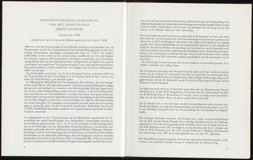 NEGENENTACHTIGSTE JAARVERSLAG VAN HET GENOOTSCHAP AMSTELODAMUM lopende over 1988 ( uitgebracht op de Algemene Ledenvergadering van 8 april 1989 ) 1988 was voor het Genootschap in verschillende opzichten een bijzonder jaar : op 29 september werd in het Gemeentearchief de tentoonstelling geopend uit de verza- meling Amsterdamse tekeningen , bijeengebracht door mr . Chr.P . van Eeghen ( 1880- 1968 ), en het erelid van het Genootschap , mejuffrouw dr . LH . van Eeghen . De collectie , ongeveer 600 Amsterdamse tekeningen omvattende , bij de historisch- topografische atlas van het Gemeentearchief ondergebracht , zal dankzij de waarlijk royale geste van mejuffrouw Van Eeghen als geheel voor onze stad bewaard blijven . Het gemeentebestuur eerde mejuffrouw Van Eeghen met de zilveren Museumme- daille van de stad . Op 30 december werd prof . mr . H . de la Fontaine Verwey , eveneens erelid van het Genootschap , 85 jaar . Een delegatie uit het bestuur heeft de heer Verwey na- mens het Genootschap in de bloemen gezet . In 1988 ging het Maandblad zijn 75e jaargang in . Een jubileum , dat niet onopge- merkt mocht blijven . Het septembernummer werd in een aanmerkelijk grotere oplage dan gewoon vervaardigd en er werden in die aflevering enige bijdragen opgenomen die op een ruime belangstelling zouden kunnen rekenen , in de verwachting daar- door het ledental van Amstelodamum te kunnen versterken . Een groot aantal po- tentiële leden ontving met het septembernummer een uitnodiging tot het Genootschap toe te treden , hetgeen resulteerde in een aanmelding van ongeveer 150 nieuwe leden tot ultimo december . De campagne werd mogelijk gemaakt mede door een toezeg- ging tot financiële steun van het Anjerfonds Amsterdam . Radio-Stad , Het Parool en NRC-Handelsblad besteedden aandacht aan Amstelodamum , daarmede de leden- werfactie steunende . Ter gelegenheid van het 75-jarig bestaan van het Maandblad organiseerde het Ge- nootschap een aantal lunchlezingen over Amsterdam , Amsterdamse mensen en Amsterdamse gebeurtenissen . Op 3 , 10 , 17 en 24 november werden belangstellen- den op de Filmzolder van het Amsterdams Historisch Museum voordrachten aan- geboden , gehouden door de stadshistoricus/geograaf Michiel Wagenaar ( Stadsuit- breidingen rond de eeuwwisseling ), door de historicus en archeoloog Hans Bonke ( Amsterdam en de industriële archeologie ), door de hoogleraar nieuwste politieke geschiedenis Piet de Rooy ( de Nieuwe Gids en Amsterdam-Bier , Politiek en Kunst ) en door de historicus en publicist Richter Roegholt ( de biografie van Ben Sijes ). Hoe - wel in de zaal niet alle stoelen bezet waren , achtte het bestuur de belangstelling toch zodanig dat getracht zal worden deze lunchlezingen een jaarlijks terugkerende activiteit te laten worden . De kwaliteit van de eerste vier lezingen was van hoog niveau . Het bestuur is de inleiders hiervoor zeer erkentelijk . De jaarvergadering werd op 26 maart gehouden in de Raadzaal van het oude Stad- huis . Het zal voor de meesten der vele toen aanwezigen de laatste keer geweest zijn dat zij het in 1927 tot Raadzaal verbouwde oude Admiraliteitsgebouw als zodanig zouden zien . Na de behandeling van het huishoudelijk gedeelte van de vergadering hield drs . Boudewijn Bakker een inleiding over het interieur van de Raadzaal waar- in hij wees op de interessante onderlinge beïnvloeding van het Amsterdamse kapita- lisme en de vooroorlogse sociaal-democratie . Voorts werd in de door Chris Lebeau beschilderde eerste klas trouwzaal aandacht geschonken aan dit monument van de Art Déco . De verhuizing van het oude naar het nieuwe stadhuis was inmiddels gaande . Prin- cenhof , verwacht een ' andren Heer . De voorjaarsexcursie ging ook ditmaal buiten de stad : op 28 mei werd een tweetal forten van de Stelling van Amsterdam bezocht , te weten het Fort benoorden Pur- merend bij Kwadijk en het Fort Spijkerboor nabij De Rijp . Deskundige uitleg werd gegeven door de heer R . Schimmel van de Provinciale Planologische Dienst van de Provincie Noord Holland . De najaarsexcursie werd op 10 december gehouden naar het Filmmuseum . Na een inleiding door de heer Bert Hogenkamp , verbonden aan het Audiovisueel Archief van de Stichting Film en Wetenschap te Utrecht , werd , zo nodig onder pianobelei- ding van de heer Stefan Ram , een groot aantal films vertoond . Op 22 oktober was er voor de leden van het Genootschap een extra excursie : drs . Boudewijn Bakker ontving vele belangstellenden op het Gemeentearchief , waar hij , na een inleiding , zijn gasten door de tentoonstelling ' De verzameling Van Eeghen ' leidde . Het tachtigste Jaarboek verscheen ook ditmaal weer onder verantwoordelijkheid van mr . J.H . van den Hoek Ostende . Een volledige ledenlijst werd in het Jaarboek opgenomen . De in het boek gepubliceerde artikelen waren van de hand van de da- mes B.M . Bijtelaar en dr . LH . van Eeghen , en van de heren drs . S.A.C . Dudok van Heel , dr . B.N . Teensma , prof . dr . L.H . van der Tweel en C . Willems . De Kroniek van Amsterdam over 1987 werd samengesteld door de heer W . Jagerman . Het Maandblad verscheen zesmaal , waarvan het september/oktobernummer , zoals vermeld , een bijzonder karakter droeg in verband met de ledenwerving . 4 5