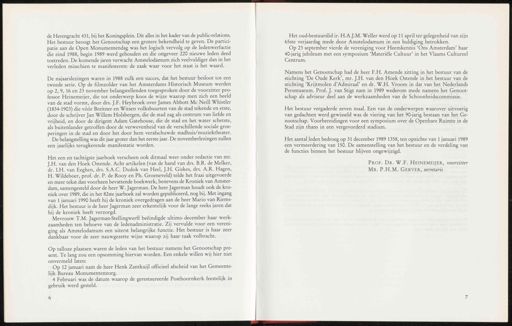 de Herengracht 431 , bij het Koningsplein . Dit alles in het kader van de public-relations . Het bestuur beoogt het Genootschap een grotere bekendheid te geven . De partici- patie aan de Open Monumentendag was het logisch vervolg op de ledenwerfactie die eind 1988 , begin 1989 werd gehouden en die ongeveer 220 nieuwe leden deed toetreden . De komende jaren verwacht Amstelodamum zich veelvuldiger dan in het verleden misschien te manifesteren : de zaak waar voor het staat is het waard . De najaarslezingen waren in 1988 zulk een succes , dat het bestuur besloot tot een tweede serie . Op de filmzolder van het Amsterdams Historisch Museum werden op 2 , 9 , 16 en 23 november belangstellenden toegesproken door de voorzitter pro- fessor Heinemeijer , die tot onderwerp koos de wijze waarop men zich een beeld van de stad vormt , door drs . J.F . Heybroek over James Abbott Mc Neill Whistier ( 1834- 1903 ) die vóór Breitner en Witsen volksbuurten van de stad tekende en etste , door de schrijver Jan Willem Holsbergen , die de stad zag als centrum van liefde en vrijheid , en door de dirigent Adam Gatehouse , die de stad en het water schetste , als buitenlander getroffen door de verwevenheid van de verschillende sociale groe- peringen in de stad en door het door hem verafschuwde stadhuis/muziektheater . De belangstelling was dit jaar groter dan het eerste jaar . De novemberlezingen zullen een jaarlijks terugkerende manifestatie worden . Het een en tachtigste jaarboek verscheen ook ditmaal weer onder redactie van mr . J.H . van den Hoek Ostende . Acht artikelen ( van de hand van drs . B.R . de Melker , dr . LH . van Eeghen , drs . S.A.C . Dudok van Heel , J.H . Giskes , drs . A.R . Hagen , H . Wildeboer , prof . dr . P . de Rooy en Ph . Groeneveld ) telde het fraai uitgevoerde en meer tekst dan voorheen bevattende boekwerk , benevens de Kroniek van Amster- dam , samengesteld door de heer W . Jagerman . De heer Jagerman houdt ook de kro- niek over 1989 , die in het 82ste jaarboek zal worden gepubliceerd , nog bij . Met ingang van 1 januari 1990 heeft hij de kroniek overgedragen aan de heer Mario van Riems- dijk . Het bestuur is de heer Jagerman zeer erkentelijk voor de lange reeks jaren dat hij de kroniek heeft verzorgd . Mevrouw T.M . Jagerman-Stellingwerff beëindigde ultimo december haar werk- zaamheden ten behoeve van de ledenadministratie . Zij vervulde voor een vereni- ging als Amstelodamum een uiterst belangrijke functie . Het bestuur is haar zeer dankbaar voor de zeer nauwgezette wijze waarop zij haar taak volbracht . Op talloze plaatsen waren de leden van het bestuur namens het Genootschap pre- sent . Te lang zou een opsomming hiervan worden . Een enkele willen wij hier niet onvermeld laten : Op 12 januari nam de heer Henk Zantkuijl officieel afscheid van het Gemeente- lijk Bureau Monumentenzorg . 4 Februari was de datum waarop de gerestaureerde Posthoornkerk feestelijk in gebruik werd gesteld . Het oud-bestuurslid ir . H.A.J.M . Weller werd op 11 april ter gelegenheid van zijn 65ste verjaardag mede door Amstelodamum in een huldiging betrokken . Op 23 september vierde de vereniging voor Heemkennis ' Ons Amsterdam ' haar 40- jarig jubileum met een symposium ' Materiële Cultuur ' in het Vlaams Cultureel Centrum . Namens het Genootschap had de heer F.H . Amende zitting in het bestuur van de stichting ' De Oude Kerk ', mr . J.H . van den Hoek Ostende in het bestuur van de stichting ' Krijtmolen d'Admiraal ' en dr . W.H . Vroom in dat van het Nederlands Persmuseum . Prof . J . van Stigt nam in 1989 wederom mede namens het Genoot- schap als adviseur deel aan de werkzaamheden van de Schoonheidscommissie . Het bestuur vergaderde zeven maal . Een van de onderwerpen waarover uitvoerig van gedachten werd gewisseld was de viering van het 90-jarig bestaan van het Ge- nootschap . Voorbereidingen voor een symposium over de Openbare Ruimte in de Stad zijn thans in een vergevorderd stadium . Het aantal leden bedroeg op 31 december 1989 1358 , ten opzichte van 1 januari 1989 een vermeerdering van 150 . De samenstelling van het bestuur en de verdeling van de functies binnen het bestuur blijven ongewijzigd . Prof . Dr . W.F . Heinemeijer , voorzitter MR . P.H.M . GERVER , secretaris 6 7