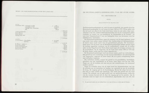 ƒ 2.481 — 21.841,05 4.000 ,— 249,69 ƒ 11.676,8 15.281 ,- WINST - EN VERLIESREKENING OVER HET JAAR 1965 BATEN Contributie 1965 - ontvangen in 1964 ontvangen in 1965 bijdrage Gem . Amsterdam gift Verkoop Publicaties Rente Effecten Rente Banken Nadelig saldo 1965 LASTEN maandbladen jaarboek J . H . de Bussy ■ B . Marcus — register n Kosten Secretariaat Kosten Penningmeester Koersverlies Effecten Diverse Kosten 28.571,74 2.283,50 1.316,17 2.092,73 1.438,06 ƒ 35.702,20 f 26.957,89 5.109 — 863,46 810,60 1.208,21 753,13 f 35.702,20 DE BUITENLANDVAARDERSKAPEL VAN DE OUDE KERK TE AMSTERDAM DOOR MEJUFFROUW B . BIJTELAAR De Buitenlandvaarderskapel zal , zoals de naam al aanduidt , zijn gesticht door het Buitenlandvaardersgilde , en wel tussen de jaren 1360 en 1370 . Of het gilde vóór die tijd reeds een altaar in de Oude kerk bezat , weten we niet zeker , maar waar- schijnlijk is het wel , omdat de Buitenlandvaarders een van de voornaamste gilden vormden ; ze voeren o.m . op Scandinavië , de Hanzesteden en de Oostzee - en juist deze Ommelandvaart *) was een belangrijke bron van inkomsten voor het middeleeuwse Amsterdam . Het Buitenlandvaardersaltaar , tegen de oostmuur van de kapel geplaatst , stond nog onder twee andere namen bekend : Sint Andries-altaar en Sacramentsaltaar ; de laatste naam wordt steeds door de geestelijkheid gebruikt . Dit Sacraments- altaar moet vóór de bouw van de Buitenlandvaarderskapel hebben gestaan tegen de voorlopig opgerichte oostmuur van de zuiderzijbeuk , evenals aan de andere zijde van het Hoge Koor het Maria-altaar stond tegen de voorlopige oostmuur van de noordzijbeuk . Na de vergroting van de Oude kerk tussen 1360 en 1370 zijn de beide altaren verder naar het oosten opgeschoven . De Buitenlandvaarderskapel werd een mooie ruimte , goed van verhoudingen . Het gewelf was een voortzetting van dat van de zuiderzijbeuk : een spitstongewelf van wagenschot , ongeveer elf meter breed . Bij zo'n grote overspanning moest men trekbalken toepassen . Die trekbalken werden , evenals het gewelf en de gewelfribben , beschilderd , misschien nog niet onmiddellijk na de bouw , maar zeker vóór het jaar 1500 . Tegen een van de korbelen ziet men een pot met zonnebloemen , die verrassend modern aandoet . Tegen de oostelijke muur van de kapel stond het Sacramentsaltaar , met aan de zuidzijde een nis ( misschien ter berging van vaatwerk ) en aan de noordzijde de boog , die toegang gaf tot de Kooromgang . Boven het altaar bevond zich een lang en smal venster met spitsboog ; vlak onder het gewelf was een rond venster . De zuidzijde van de kapel prijkte met vier spitsboogvensters ; onder één van die vensters bevond zich de deur die toegang gaf tot de sacristie . Aan de westzijde werd de kapel van de zuiderzijbeuk afgescheiden door een hek met x ) Zo genoemd omdat men om Jutland heen voer naar de Sont , en verder naar de Oostzee . 10 11