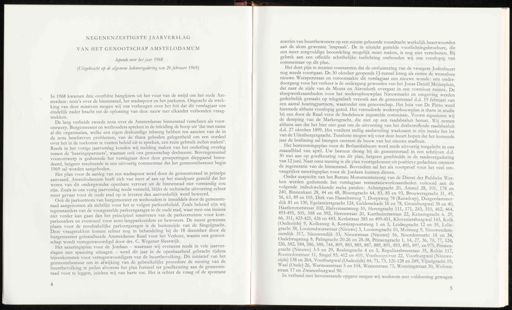NEGENENZESTIGSTE JAARVERSLAG VAN HET GENOOTSCHAP AMSTELODAMUM lopende over het jaar 1968 ( Uitgebracht op de algemene ledenvergadering van 26 februari 1969 ) In 1968 kwamen drie overhitte hangijzers uit het vuur van de strijd om het oude Am- sterdam : nota's over de binnenstad , het stadsspoor en het parkeren . Ongeacht de strek- king van deze missiven mogen wij ons verheugen over het feit dat dit verslagjaar ons eindelijk nader bracht tot de oplossing van deze nauw met elkander verbonden vraag- stukken . De lang verbeide tweede nota over de Amsterdamse binnenstad verscheen als voor- ontwerp . Burgemeester en wethouders spreken in de inleiding de hoop uit ' dat met name al die organisaties , welke een eigen deskundige inbreng hebben ten aanzien van de in de nota beschreven problemen , van de thans geboden gelegenheid om een oordeel over het in de toekomst te voeren beleid uit te spreken , een ruim gebruik zullen maken '. Reeds in het vorige jaarverslag konden wij melding maken van het onderling overleg tussen de ' hearingspartners ', waaraan ook ons genootschap deelneemt . Bovengenoemd voorontwerp is gedurende het verslagjaar door deze groeperingen diepgaand bestu- deerd , hetgeen resulteerde in een uitvoerig commentaar dat het gemeentebestuur begin 1969 zal worden aangeboden . Het plan voor de aanleg van een stadsspoor werd door de gemeenteraad in principe aanvaard . Amstelodamum heeft zich van meet af aan op het standpunt gesteld dat het weren van dit ondergrondse openbare vervoer uit de binnenstad niet verstandig zou zijn . Zoals in ons vorig jaarverslag reeds vermeld , blijkt de technische uitvoering echter meer gevaar voor de oude stad op te leveren dan aanvankelijk werd beweerd . Ook de parkeernota van burgemeester en wethouders is inmiddels door de gemeente- raad aangenomen als richtiijn voor het te volgen parkeerbeleid . Zoals bekend zijn wij tegenstanders van de voorgestelde parkeergarages in de oude stad , waar men ons inziens niet verder kan gaan dan het principieel reserveren van de parkeerruimte voor kort- parkeerders en eventueel voor semi-langparkeerders en bewoners . De meest gewenste plaats voor de noodzakelijke parkeergarages is de buitenzijde van de Singelgracht . Deze vraagstukken komen echter nog in behandeling bij de 18 december door de burgemeester geïnstalleerde Amsterdamse Raad voor het Verkeer , waarin ons genoot- schap wordt vertegenwoordigd door drs . C . Wegener Sleeswijk . Het saneringsplan voor de Jordaan - waarnaar wij eveneens reeds in vele jaarver- slagen met spanning uitzagen - werd dit jaar in de openbaarheid gebracht tijdens bijeenkomsten voor vertegenwoordigers van de buurtbevolking . Dit initiatief van het gemeentebestuur om in afwijking van de gebruikelijke procedure de mening van de buurtbevolking te peilen alvorens het plan formeel ter goedkeuring aan de gemeente- raad voor te leggen , juichen wij van harte toe . Het is echter de vraag of de spontane reacties van buurtbewoners op een zojuist gehoorde voordracht werkelijk beantwoorden aan de alom gewenste ' inspraak '. De in uitzicht gestelde voorlichtingsbrochure , die een meer zorgvuldige beoordeling mogelijk moet maken , is nog niet verschenen . Bij gebrek aan een officiële schriftelijke toelichting onthouden wij ons voorlopig van commentaar op dit plan . Het doet pijn te moeten constateren dat de ontluistering van de vroegere Jodenbuurt nog steeds voortgaat . De 30 oktober geopende IJ-tunnel kreeg als entree de wezenloze nieuwe Weesperstraat en veroorzaakte dit verslagjaar een nieuwe wonde : een onder- doorgang voor het verkeer is de ondergang geworden van het Jonas Daniël Meijerplein , dat naar de zijde van de Mozes en Aaronkerk overgaat in een vormloze ruimte . De sloopwerkzaamheden voor het wederopbouwplan Nieuwmarkt en omgeving werden gedeeltelijk gestaakt op telegrafisch verzoek aan de gemeenteraad d.d . 19 februari van een aantal hearingpartners , waaronder ons genootschap . Het huis van De Pinto werd hiermede althans voorlopig gered . Het verouderde wederopbouwplan is thans in studie bij een door de Raad voor de Stedebouw ingestelde commissie . Voorts signaleren wij de demping van de Markengracht , die niet op een raadsbesluit berust . Wij nemen althans aan dat het hier niet gaat om de uitvoering van het desbetreffende raadsbesluit d.d . 27 oktober 1899 . Het verdient stellig aanbeveling waakzaam te zijn inzake het lot van de Uilenburgergracht . Tenslotte mogen wij voor deze buurt hopen dat het komende jaar de beslissing zal brengen omtrent de bouw van het nieuwe stadhuis . Het bestemmingsplan voor de Bethaniënbuurt werd reeds uitvoerig toegelicht in ons maandblad van april . Uw bestuur drong bij de gemeenteraad in een schrijven d.d . 30 mei aan op goedkeuring van dit plan , hetgeen geschiedde in de raadsvergadering van 12 juni . Naar onze mening is dit plan voortgekomen uit positieve gedachten omtrent de regeneratie van de binnenstad . Bovendien zal het als voorproef voor het veel om- vangrijker saneringsplan voor de Jordaan kunnen dienen . Onder auspiciën van het Bureau Monumentenzorg van de Dienst der Publieke Wer- ken werden gedurende het verslagjaar restauratiewerkzaamheden voltooid aan de volgende indrukwekkende reeks panden : Achtergracht 20 , Amstel 28 , 101 , 178 en 240 , Binnenkant 28 , 44 en 48 , Bloemgracht 64 , 83 , 85 en 93 , Brouwersgracht 31 , 49 , 56 , 63 , 89 en 105 , Dirk van Hasseltssteeg 7 , Dorpsweg 78 ( Ransdorp ), Durgerdammer- dijk 81 en 130 , Egelantiersgracht 124 , Geldersekade 16 en 78 , Groenburgwal 38 en 40 , Haarlemmerstraat 102 , Halvemaansteeg 10 , Herengracht 111 , 171 , 243 , 310 , 462 , 464 ,' 493-495 , 505 , 588 en 592 , Herenstraat 20 , Karthuizersstraat 22 , Keizersgracht 6 , 29 ^ 66 , 311 , 423-425 , 426 en 443 . Kerkstraat 385 en 499-451 , Kloveniersburgwal 143 , Kolk ( Oudezijds ) 9 , Kolksteeg 4 , Korsjespoortsteeg 1 en 3 , Leidsegracht 12 en 39 , Lelie- gracht 38 , Looiersdwarsstraat ( Nieuwe ) 3 , Looiersgracht 10 , Molsteeg 9 , Nieuwend