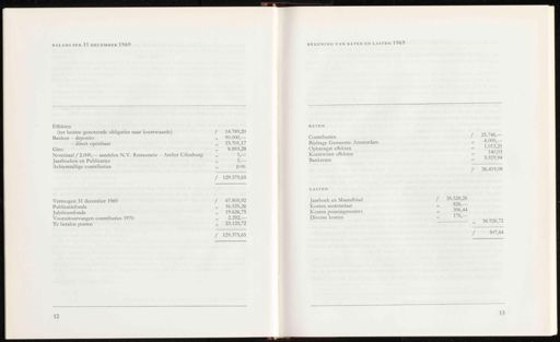 BALANS PER 31 DECEMBER 1969 REKENING VAN BATEN EN LASTEN 1969 Effekten ( ter beurze genoteerde obligaties naar koerswaarde ) Banken — deposito — direct opeisbaar Giro Nominaal ƒ 2.000 ,— aandelen N.V . Restauratie - Atelier Uilenburg Jaarboeken en Publicaties Achterstallige contributies f 14.789,20 90.000 ,— 15.701,17 8.883,28 1- 1 — p.m . BATEN Contributies Bijdrage Gemeente Amsterdam Opbrengst effekten Koerswinst effekten Bankrente ƒ 25.746 ,— 4.000 — 1.013,21 140,03 5.519,84 ƒ 36.419,08 ƒ 129.375,65 LASTEN Vermogen 31 december 1969 Publicatiefonds J ubileumfonds Vooruitontvangen contributies 1970 Te betalen posten ƒ 67.805,92 16.525,26 19.626,75 2.292 — 23.125,72 Jaarboek en Maandblad Kosten secretariaat Kosten penningmeester Diverse kosten f 35.528,28 )> 826 ,— 3 ? 396,44 176 — 36.926.72 ƒ 129.375,65 ƒ 507,64 12 13