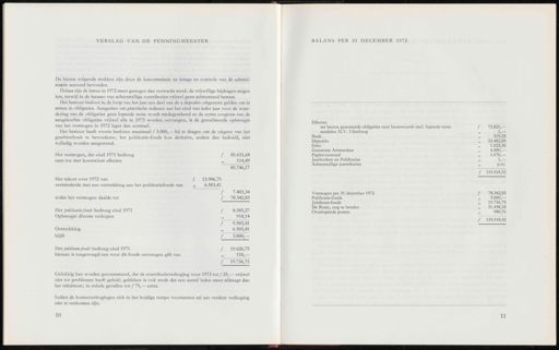 VERSLAG VAN DE PENNINGMEESTER BALANS PER 31 DECEMBER 1972 De hiema volgende stukken zijn door de kascommissie na inzage en controle van de admini- stratie accoord bevonden . Helaas zijn de lasten in 1972 meer gestegen dan verwacht werd ; de vrijwillige bijdragen stegen iets , terwijl in de incasso van achterstallige contributies vrijwel geen achterstand bestaat . Het bestuur besloot in de loop van het jaar een deel van de a deposito uitgezette gelden om te zetten in obligaties . Aangezien om practische redenen aan het eind van ieder jaar voor de waar- dering van de obligaties geen lopende rente wordt medegerekend en de eerste coupons van de aangekochte obligaties vrijwel alle in 1973 worden ontvangen , is de gerealiseerde opbrengst van het vermogen in 1972 lager dan normaal . Het bestuur heeft voorts besloten maximaal ƒ 3.000 ,— bij te dragen om de uitgave van het grachtenboek te bevorderen ; het publicatie-fonds kon derhalve , anders dan bedoeld , niet volledig worden aangewend . / 85.631,68 » 114,49 85.746,17 ƒ 13.906,75 6.503,41 / 7.403,34 / 78.342,83 / 8.585,27 » 918,14 f 9.503,41 „ 6.503,41 f 3.000 ,— f 19.626,75 » 110 ,— ƒ 19.736,75 Het vermogen , dat eind 1971 bedroeg nam toe met koerswinst effecten Het tekort over 1972 van verminderde met een onttrekking aan het publicatiefonds van zodat het vermogen daalde tot Het publicatie-fonds bedroeg eind 1971 Opbrengst diverse verkopen Onttrekking blijft Het jubileum-fonds bedroeg eind 1971 hieraan is toegevoegd een voor dit fonds ontvangen gift van Effecten ter beurze genoteerde obligaties naar beurswaarde excl . lopende rente aandelen N.V . Uilenburg Bank Deposito Giro Gemeente Amsterdam Papiervoorraad Jaarboeken en Publicaties Achterstallige contributies Vermogen per 31 december 1972 Publicatie-fonds Jubileum-fonds De Bussy , nog te betalen Overlopende posten 72.821 — 1 — 519,33 53.482,89 1.023,30 4.000 ,— 1.670 — 1 ,— p.m . ƒ 133.518,52 ƒ 78.342,83 3.000 — 19.736,75 31.458,18 980,76 ƒ 133.518,52 Gelukkig kan worden geconstateerd , dat de contributieverhoging voor 1973 tot ƒ 25 ,— vrijwel niet tot problemen heeft geleid ; gebleken is ook reeds dat een aantal leden meer afdraagt dan het minimum ; in enkele gevallen tot / 75 ,— extra . Indien de kostenverhogingen zich in het huidige tempo voortzetten zal aan verdere verhoging niet te ontkomen zijn . 10 11