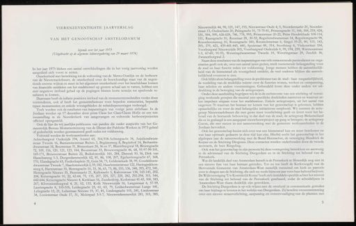 VIERENZEVENTIGSTE JAARVERSLAG VAN HET GENOOTSCHAP AMSTELODAMUM lopende over het jaar 1973 ( Uitgebracht op de algemene ledenvergadering van 29 maart 1974 ) In het jaar 1973 bleken een aantal ontwikkelingen die in het vorig jaarverslag werden aangeduid zich voort te zetten . Onzekerheid met betrekking tot de voltooiing van de Metro-Oostlijn en de herbouw van de Nieuwmarktbuurt , de onzekerheid over de bouwkundige staat van de negen- tiende eeuwse wijken en meer in het algemeen onzekerheid over het beschikbaar komen van financiële middelen om het stadsherstel op grotere schaal aan te vatten , hebben een zeer negatieve invloed gehad op de pogingen binnen korte termijn tot sprekende re- sultaten te komen . Daarnaast heeft de inflatie positieve invloed van de monumentensubsidies verder doen verminderen , ook al heeft het gemeentebestuur voor beperkte restauraties , bepaalde typen monumenten en enkele woongebieden de subsidiepercentages verhoogd . Toch werden ook de resultaten van inspanningen van vorige jaren zichtbaar . In de Jordaan werden op 17 december door prins Claus het Claes-Claesz Hofje en een ten- toonstelling in de Noorderkerk van aangevangen en voltooide herbouwprojecten officieel opengesteld . Ook de lijst die wij jaarlijks publiceren van panden die onder auspiciën van het Ge- meentelijk Bureau Monumentenzorg van de Dienst der Publieke Werken in 1973 geheel of gedeeltelijk werden gerestaureerd geeft reden tot voldoening . Voltooid werden de werkzaamheden aan : Achterburgwal Oudezijds 194 , Amstel 65 , 316/318- Achtergracht 34 , Anjeliersdwars- straat Tweede 16 , Bantammerstraat Buiten 3 , Begijnesteeg 8 , Begijnhof 14 , Bethaniën- dwarsstraat 18 , Beursstraat 31 , Binnenkant 24 , 36 en 37 , Blauwburgwal 18 , Bloemgracht 72 , 109 , 116 , 120 , 121 , 123 , 164 , Boomstraat 33 , Brouwersgracht 46 , 68 , 95-97-99-101 , 169-171 , Brouwerstraat Buiten 22 , Buiksloterdijk 160 , 284 , Damrak 50 , 56 , Dirk van Hasseltssteeg 1- 3 , Durgerdammerdijk 62 , 81 , 86 , 108 , 207 , Egelantiersgracht 67 , 168 , 170 , Elandsgracht 63 , Frederiksplein 31 , Gein 54 , 73 , Geldersekade 38 , 99 , Goudsbloem- dwarsstraat Tweede 7 , Haarlemmerdijk 2,59,182 , Haarlemmerstraat 122 , Haringpakkers- steeg 6 , Hartenstraat 35 , Herengracht 10 , 33 , 36 , 63 , 73 , 86,110,136 , 348 , 393 , 472 , 541 , Herengracht Nieuwe 35 , Herenmarkt 21 , Kalkmarkt 5 , Kalverstraat 138 , 143-145 , 202 , 204 , Keizersgracht 10 , 22 , 62-64 , 75 , 135 , 207 , 225 , 227 , 229 , 282 , 292-294 , 315 , 544 , 642-644 , Keizersgracht Nieuwe 4 , Kerklaan 16 , Zunderdorp , Kerkstraat 41-43,100,183 , 217 , Kloveniersburgwal 4 , 21 , 52 , 133 , Kolk Nieuwezijds 16 , Langestraat 6 , 57-59 , Lauriergracht 8 , 103-105 , Leidsegracht 23 , 61 , 63 , 79 , Leidsedwarsstraat Lange 141 , Leliegracht 13 , 21 , Leliestraat Nieuwe 19 , 37 , 81 , Lindengracht 105 , 241 , Lindenstraat 34 , Looiersstraat Oude 17 , 31 , Molenpad 3-5-7 , Nieuwendammer dijk 281 , 315 , 385 , Nieuwendijk 44 , 98,121,147 , 153 , Nieuwstraat Oude 4 , 5 , Noordermarkt 20 , Noorder- straat 13 , Oudeschans 20 , Palmgracht 51 , 73-79-81 , Prinsengracht 11,166,168,218 , 424 , 531 , 584 , 590 , 626-628 , 746 , 778 , 993 , Prinsenstraat 20-22 , Prins Hendrikkade 108-114 , 151 , Raamgracht 10 , Reestraat 28 , 30-32 , Reguliersdwarsstraat 14 , Reguliersgracht 98 , Rozenboomsteeg 10 , Rozengracht 160 , Roomolenstraat 6 , Singel 19-21 , 80 , 115 , 143 , 295 , 379 , 421 , 439-441-443 , 440 , Spuistraat 88 , 314 , Stoofsteeg 6 , Vinkenstfaat 184 , Voorburgwal Nieuwezijds 303 , Voorburgwal Oudezijds 8 , 99,194 , 239 , Warmoesstraat 1- 3 , 67-69 , 91-93 , Weteringdwarsstraat Tweede 18 , Weteringstraat 29 , Zeedijk 36 , Zwanenburgwal 2 . Naast deze resultaten van de inspanningen van vele restaurerende particulieren en orga- nisaties geeft ook de , over een aantal jaren gezien , sterk toenemende belangsteling voor de stad en haar functie reden tot voldoening . Jonge mensen hebben de aantrekkelijk- heid van de binnenstad als woongebied ontdekt , de veel ouderen blijken die aantrek- kelijkheid eveneens te zien . Ook blijkt alom belangstelling voor de problemen van de stad : haar toegankelijkheid , de verdeling van de stedelijke ruimte over de functies wonen , werken en ontspanning , haar scholen en andere voorzieningen . Gebundeld komt deze onder andere tot uit- drukking in de beweging van de actiegroepen . Onder deze aanduiding begrijpen wij de in de rechtsvorm van een stichting of vereni- ging werkende groepen die meestal zeer specifieke doeleinden nastreven en waarvan ze- ker impulsen uitgaan voor het stadsbestuur . Enkele actiegroepen , uit het aantal van ongeveer 70 waarvan het bestaan ter kennis van het genootschap is gekomen , hebben opmerkelijke en voor de stad belangrijke initiatieven ontplooid . Wij noemen de actie- groep Nieuwmarktbuurt die met grote inzet voorlichting geeft en ijvert voor het be- houd van de bestaande bebouwing in dat deel van de stad ; de actiegroep Bickerseiland die er in geslaagd is een aangepast nieuwbouwproject op gang te brengen ; de actiegroep Cocon , die met succes in een samenwerking met de gemeente werkzaamheden in de Jordaan bevordert . Ook het genootschap bezint zich over wat een binnenstad kan en moet betekenen en wat haar optimale gedaante in deze tijd kan zijn . Hierbij zocht het genootschap in het afgelopen jaar de samenwerking met de Bond Heemschut , de vereniging Hendrick de Keyser en de Stichting Diogenes . Deze contacten werden onderhouden door de tweede secretaris , de heer Ringeling . Ook was het genootschap in zijn persoon bij deze vormgeving betrokken en aanwezig in de adviesraad van de Stichting Durgerdam en in de Stichting tot behoud van de Petruskerk . Wat dit landelijk deel van Amsterdam betreft is de Petruskerk te Sloterdijk nog niet in een nieuwe fase van haar bestaan getreden . Tot nu toe heeft de Kerkvoogdij van de Hervormde Gemeente van Amsterdam-West namelijk verzuimd om kerk en pastorie over te dragen aan de Stichting , die z
