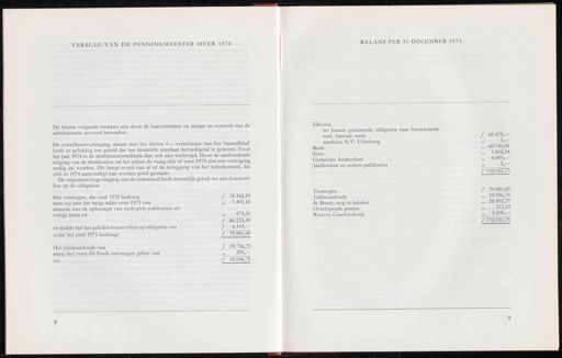 VERSLAG VAN DE PENNINGMEESTER OVER 1973 BALANS PER 31 DECEMBER 1973 De hierna volgende stukken zijn door de kascommissie na inzage en controle van de administratie accoord bevonden . De contributieverhoging , samen met het slechts 6 X verschijnen van het ' maandblad ' heeft er gelukkig toe geleid dat het financiële resultaat bevredigend is geweest . Voor het jaar 1974 is de minimumcontributie dan ook niet verhoogd . Door de aanhoudende stijging van de drukkosten zal het echter de vraag zijn of voor 1975 niet een verhoging nodig zal worden . Dit hangt er ook van af of de teruggang van het ledenbestand , die zich in 1974 aankondigt kan worden goed gemaakt . De ongemeen hoge stijging van de rentestand heeft natuurlijk geleid tot een koersver- lies op de obligaties . ƒ 78.342,83 „ 7.401,16 479,50 ƒ 86.223,49 ƒ 6.343 — ƒ 79.880,49 ƒ 19.736,75 „ 200 - ƒ 19.936,75 Het vermogen , dat eind 1972 bedroeg nam toe met het batig saldo over 1973 van alsmede met de opbrengst van verkochte publicaties uit vorige jaren ad en daalde met het geleden koersverlies op obligaties van zodat het eind 1973 bedraagt Het jubileumfonds van steeg met voor dit fonds ontvangen giften van tot Effecten ter beurze genoteerde obligaties naar beurswaarde excl . lopende rente aandelen N.V . Uilenburg Bank Giro Gemeente Amsterdam Jaarboeken en andere publicaties Vermogen Jubileumfonds de Bussy , nog te betalen Overlopende posten Reserve Grachtenboek ƒ 65.478 ,— 1 - 60.740,41 1.802,34 4.000 — 1 ^ f 132.022,75 ƒ 79.880,49 „ 19.936,75 „ 28.992,37 213,14 „ 3.000 — ƒ 132.022,75 8