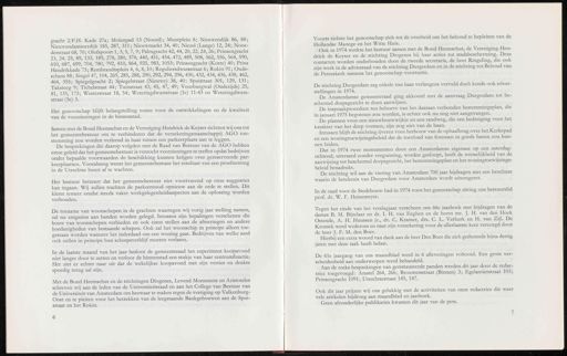 gracht 2/P.H . Kade 27a ; Molenpad 13 ( Noord ); Muntplein 8 ; Nieuwendijk 86 , 88 ; Nieuwendammerdijk 185 , 287 , 311 ; Nieuwmarkt 34 , 40 ; Niezel ( Lange ) 12 , 24 ; Noor- derstraat 68,70 ; Olofspoort 1 , 3 , 5 , 7 , 9 ; Palmgracht 42,44,20 , 22,24,26 ; Prinsengracht 23 , 24 , 25 , 89 , 133 , 189 , 278 , 280 , 378 , 440 , 451 , 454 , 472 , 489 , 508 , 562 , 556 , 564 , 590 , 610 , 687 , 699 , 704 , 780 , 792 , 810 , 864 , 925 , 983 , 1053 ; Prinsengracht ( Korte ) 40 ; Prins Hendrikkade 73 ; Rembrandtsplein 4 , 6 , 8,10 ; Reguliersdwarsstraat 6 ; Rokin 91 ; Oude- schans 88 ; Singel 47,104 , 269 , 285 , 288 , 290,292,294 , 296 , 430 , 432 , 434 , 436 , 438 , 462 , 464 , 355 ; Spiegelgracht 2 ; Spiegelstraat ( Nieuwe ) 38 , 40 ; Spuistraat 301 , 129 , 131 ; Taksteeg 9 ; Tichelstraat 44 ; Tuinstraat 43 , 45 , 47 , 49 ; Voorburgwal ( Oudezijds ) 25 , 81 , 135 , 173 ; Westerstraat 18 , 54 ; Weteringdwarsstraat ( Ie ) 11-43 en Weteringdwars- straat ( 3e ) 3 . Het genootschap blijft belangstelling tonen voor de ontwikkelingen en de kwaliteit van de voorzieningen in de binnenstad . Samen met de Bond Heemschut en de Vereniging Hendrick de Keyser richtten wij ons tot het gemeentebestuur om te verhinderen dat de verzekeringsmaatschappij AGO toe- stemming zou worden verleend in haar tuinen een parkeerplaats aan te leggen . De besprekingen die daarop volgden met de Raad van Bestuur van de AGO hebben ertoe geleid dat het gemeentebestuur is verzocht voorzieningen te treffen opdat bedrijven onder bepaalde voorwaarden de beschikking kunnen krijgen over gereserveerde par- keerplaatsen . Vooralsnog wenst het gemeentebestuur het resultaat van een proefneming in de Utrechtse buurt af te wachten . Het bestuur betreurt dat het gemeentebestuur niet voortvarend op onze suggesties kan ingaan . Wij zullen trachten de parkeemood opnieuw aan de orde te stellen . Dit klemt temeer omdat steeds vaker werkgelegenheidsaspecten aan de oplossing worden verbonden . De toename van woonschepen in de grachten waartegen wij vorig jaar stelling namen , zal nu enigszins aan banden worden gelegd . Intussen zijn bepalingen verschenen die bouw van woonschepen verbieden en ook eisen stellen aan de afmetingen en andere hoedanigheden van bestaande schepen . Ook zal het woonschip in principe alleen toe- gestaan worden wanneer het inderdaad om een woning gaat . Bedrijven van welke aard ook zullen in principe hun scheepsverblijf moeten verlaten . In de laatste maand van het jaar besloot de gemeenteraad het experiment koopavond niet langer door te zetten en verloor de binnenstad een stukje van haar centrumfunctie . Het ziet er echter naar uit dat de wekelijkse koopavond met zijn vertier en drukte spoedig terug zal zijn . Met de Bond Heemschut en de stichtingen Diogenes , Levend Monument en Aristoteles schreven wij aan de leden van de Universiteitsraad en aan het College van Bestuur van de Universiteit van Amsterdam om bezwaar te maken tegen de vestiging op Valkenburg- Oost en te pleiten voor het betrekken van de leegstaande Bankgebouwen aan de Spui- straat en het Rokin . Voorts richtte het genootschap zich tot de overheid om het behoud te bepleiten van de Hollandse Manege en het Witte Huis . Ook in 1974 werkte het bestuur samen met de Bond Heemschut , de Vereniging Hen- drick de Keyser en de stichting Diogenes bij haar acties tot stadsbescherming . Deze contacten worden onderhouden door de tweede secretaris , de heer Ringeling , die ook zijn werk in de adviesraad van de stichting Durgerdam en in de stichting tot Behoud van de Petruskerk namens het genootschap voortzette . De stichting Durgerdam zag enkele van haar verlangens vervuld doch kende ook teleur- stellingen in 1974 . De Amsterdamse gemeenteraad ging akkoord met de aanvraag Durgerdam tot be- schermd dorpsgezicht te doen aanwijzen . De inspraakprocedure ten behoeve van het daaraan verbonden bestemmingsplan , die in januari 1975 begonnen zou worden , is echter ook nu nog niet aangevangen . De plannen voor een nieuwbouwwijkje en een randweg , die een bedreiging voor het karakter van het dorp vormen , zijn nog niet van de baan . Intussen blijft de stichting ijveren voor herbouw van de ophaalbrug over het Kerkepad en een woningtoewijzingsbeleid dat de toevloed van forensen in goede banen zou kun- nen leiden . Dat in 1974 twee monumenten door een Amsterdamse eigenaar op een zaterdag- ochtend , uiteraard zonder vergunning , werden gesloopt , heeft de wenselijkheid van de aanwijzing tot beschermd dorpsgezicht , het bestemmingsplan en het woningtoewijzings- beleid benadrukt . De stichting wil aan de viering van Amsterdam 700 jaar bijdragen met een brochure waarin de betekenis van Durgerdam voor Amsterdam wordt uiteengezet . In de raad voor de Stedebouw had in 1974 voor het genootschap zitting ons bestuurslid prof . dr . W . F . Heinemeyer . Tegen het einde van het verslagjaar verscheen ons 66e jaarboek met bijdragen van de dames B . M . Bijtelaar en dr . I . H . van Eeghen en de heren mr . J . H . van den Hoek Ostende , A . H . Huussen jr ., dr . C . Kramer , drs . C . L . Verkerk en H . van Zijl . De Kroniek werd wederom en naar zijn verzekering voor de allerlaatste keer verzorgd door de heer J . F . M . den Boer . Hierbij een extra woord van dank aan de heer Den Boer die zich gedurende bijna dertig jaren met deze taak heeft belast . De 61e jaargang van ons maandblad werd in 6 afleveringen voltooid . Een grote ver- scheidenheid aan onderwerpen werd behandeld . Aan de reeks besprekingen van gerestaureerde panden werden dit jaar door de redac- trice toegevoegd : Amstel 264 , 266 ; Brouwersstraat ( Binnen ) 3 ; Egelantierstraat 103 ; Prinsengracht 1091 ; Utrechtsestraat 145 , 147 . Ook dit jaar prijzen wij ons gelukkig met de activiteiten van onze redactrice die weer vele artikelen bijdroeg aan maandblad en jaarboek . Geen afzonderlijke publikaties kwamen dit jaar van de pers .