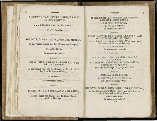 JE ADJUDANT VAN HET KONINKLIJK PALEIS TE AMSTERDAM . • • . HOYINCK VAN FANSNDRECHT . in het Paleis . DIRECTEUR VAN HET KONINKLIJK MUSEUM , in het Trippenhuis op den Klovcniers Burgwal ," C . APOSTOOL , ia vtotnoemd lokaal . —— THESAURIER VAN HET SYNDIKAAT ÖER NEDERLANDEN , i » iet lokaal van het Syndikaat op het St . Joris hof , in de Spinhuislteeg , '' tui-HlW sb-nav J . FRASÉR , J'j tj » voornoemd lokaiW ^ «« Iqntfc SECRETARIS ENUOBPE'RWEKHOUDER VAN HET GROOTBOEK , op de Oude Turfmarkt , - C . H . VAN WEST , in voornoemd lokaal » . VERI-FICAJEUR DER , KANSBILLETTEN VAN DÉ'UITGESTELDE SCHULD , In het lokaal van ' het voormalige Ministerie yan Finantïe in de Spinhuisfteeg , - j . j,^be vries , - in voornoemd lokaal . DIRECTEUR DBtfjMMA'REW V»N DE ZUIDERZEE . N . iemmers '; Ridded van den Nederlandfchen Leeuw 4 Schout-by-Naclu . aan hét Koninklijk Magazijn en Werf . EQUÏPAGIE.MEESTER . . ROEPEi , Kapitein - ter Zee , . aan de Koninklijke Werf . DIRECTIE DER NEDERLANDSCHE BASK ,, hrKet lokaal der B»n $', op de Oude Turf- . V»Wi W'rkt , No » !&,„, ■ DIRECTEUR DER KONVOOIJEN EN.LICENTEN , in het Oosündifche Huis , hoek van deu Klove - niers Burgwal en Hoogftraat , CE , VAILLANT , tn voornoemd lokaal . A * 5ffiS2§KSS233KRS3SS85S'S53ïSï ÏHBW ^^^^ H