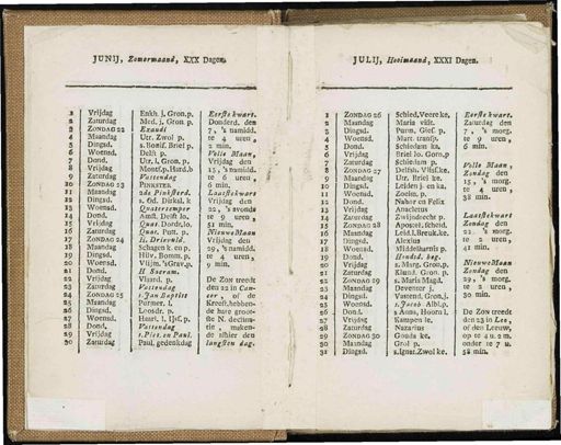 JÜNIJ , ZoKirtiaani , XXX Dage » JUUJ , Jleoimaand , XXXI Dagen , 3 Vrijdag a . Zaturdag 9 Zondag aj 4 ' Maandag | 5 Oingsd . 6 Woensd . 7 Dond . » Vrijdag 9 Zaturdag 10 Zondag 23 II ' Maandag ia Dingsd . 18 Woensd . > 4 Dond . 15 Vrijdag 16 Zaturdag 17 Zondag 24 18 Maandag 19 Dingsd . 20 Woensd . ftl Dond . SI Vrijdag » 3 Zaturdag * 4 Zondag 25 « S Maandag * « 6 Dingsd . * 7 Woensd . SU Dond » * S > 1 Vrijdag 90 Zaturdag I Enkh . j . Gron.p . Med . j . Gron . p . Exaudi Utr . Zwol p . s.Bonif.Bnelp. Delft p . Utr . I , Gron , p . Montf.p.Hard.b Vastendag Pinkster < 3.de Pinkflerd . s . Od . Dirksl . k Quatertemper Amft . Delft lo . Q*ar.Dordr t \ Oi Qt/at . Putt , p , H , Drievnld , Schagen k , en p . Hilv.Bomm.p. Vlijm . ' sGrav.p . H Sacram . Vlaarcl . p . Vastendag s-^an Baptist Purnier , 1 . Loos dr . p . Haart . 1 . IJsC.p . Vastendag s.Piet . en Paul . Paul , gedenkdag Ëerfte kwart » Donderd . den 7 , ' s namidd . te 4 uren 9 i min . Volle Maan , Vrijdag den 15 » ' s namidd . te 6 uren , 6 min . Laatflekwart Vrijdag den aa , ' s avondi te 9 uren , 51 min . Nieu- wêMaan Vrijdag den 29 , '« namidd . te 4 uren , 9 min . De Zon treedt den 22 in Can- cer , of de Kreeft , hebben- de bare groot- te N . declina- tie , maken- de alhier den langfiin dag . I Zondag 26 Schied,Veereke » Eerfte kwart . 3 Maandag Maria viflt . Zaturdag den 3 Dingsd . Purm . Gief . p . 7 , ' s morg . 4 Woensd , Mart . tranfp . te 9 uren 9 5 Dond . Schiedam ka . 6 min . 6 Vrijdag Brïel lo . Gorn.p 7 Z 9 Zaturdag Zondag 17 Maandag Schiedam p . Delfsh . VHsf.ke . Utr . Brïel ke . Volle Maan , Zondag den 15 , ' s morg . te 4 uren , 38 min . 10 Dingsd . Leiden j . en ka . 11 Woensd . Zoelni . p . 32 Dond . Nahor en Felix 13 Vrijdag Anacletus 14 ' Zaturdag Zvvijndrecht p . Laatflekwart 15 Zondag 28 Apostel . fcheid . Zondag den 16 Maandag LeidJ.Breuk.ke . 22 . ' s morg . « 7 Dingsd . Alexius te 2 uren , 18 Woensd . Middelharais p . 41 min . - 19 Dond . Hondsd . beg . 20 Vrijdag & Marg . G ron.p . Nieuwe Maan 21 Zaturdag Klund . Gron . p . Zondag den 12 Zondag 29 s . Maria Magd . 29 , ' s morg . 23 Maandag Deventer j . te 2 . uren , 24 Dingsd . Vastend . Gron.j . 30 min . 15 Woensd . s.Jacob . Alblp . IÖ - Dond . s Anna , Hoorn I , De Zon treedt 17 Vrijdag Kampen Ie . den 23 in Leo , 28 Zaturdag Nazarius of den Le e uw , 19 Zondag 30 Gouda ke . op te 4u . 21H , $ a Maandag Grol p . onder te 7 u . J » Dingsd » s.Ignat.Zwol ke . 58 min .