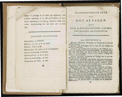 -■ ryyssag igs Begin " ' s middags te 12 uren 35 . minuten ; liet | midden namiddag te 3 uren 35 minuten ; en het einde namiddag te 6 uren 35 minuten : - maar van welke Verduistering bij ons niets zal te zien i \ zijn . JOODSCHE FEESTDAGEN . Mamansfeest , : 9 Februari ;". Pafchen , 17 , iS , 23 en 24 April . Pinkfler , 6 en 7 Jun ^. Nieuwe Jaar , A *. 5382 . 27 «" s8 September . Groote Verzoendag , 6 October . Loofliuttenfeest , n en n dito . Feest der Onthouding , 18 dito . Vreugdedag der Wet , 19 dito . TEGENWOORDIGE ORDE o P lÉP ^ AFVAREN VOLK - BN MJ^EjjftjS^B'I.TEN , 5CHEP|EN , ■ 2»£P$i$^8p S $$ fö )* DILIGENCES . VWWVWVWWWWtAWWWWVWWWWWVWWW van AMSTERDAM op •■■ l&almilr , Maandag , Woensdag en Vrijdag om 12 nor van derfStoiürmarltc . - 1 ' l^pkotuls , alle Maandagen om 12 nor van den Amftel'bii * deUHalwemaansbrog , ( _ i.»3aY / ï - Alkmaar , alle morgen een Schip « en 9 , en ' s Maand , ten a ■ ünf , ; van-'t Warer voor de Karnemelkfteeg ; of ovor-Haarlem van waar tlte mor $. Jen half.o noren een Postwagen rijdt ! Ook , b-j beSoteo water , om de 3 of 14 dagen , ' s mow « een ssWafafcjevfvanibffiseveaKj "? ö Alphen , MaaDdag , Woenldag en Vrij »» . om 12 nurvai'het Roki'n . over de Kapel . ( nt£«at « ca ■"' JtiRtrifiHirt , cagwiafcyiDónderdag , Zatordag e » Zondae's MmorgeoSrom-S nor een Schip van ' t Water voor de Vrou- • t#«lt*«iüeSMvt * l%#*i,svan waar Zaaii ^ Maand ., Dood . en Vnjd . ' s morgens - ten 7 en ' s oamidd . ten 2 nor eeDirottr - wiged"ri]drjï%H dageïij&s ten 4 our een Kar.l ,> ' Mv / ?* f I , "°' van < len ' A Pri u ° t den'ï^Sftober deaMaan- W^tajjjagi'rratoid . ten 1 nnr jien'.toar.jl noren van bnitén- van t Oaot«V]ïo»pjApril , MainS . i«mhtd;5t«E 11 ; uor dn 5&Ui!!- J !£'> ?*^ M ?'"' e ^^^ t /'* e^feW't < R<««B>l3i de : ^^ afeersftWj^rtSMeflotett *» tei aai)8rs«<Mjan en V^öaï » een wagen rijden van hetlieWüke'fclefe^iliideïSmaW^K ,. && k * W '¥? sa eW 8 « nh8Ha4»erft|ns » Vao Hemelvaartsdag tot 1 ' Amltetdamfclie:kermis , ïZoodag ïs morgenster half 7 de ' Kerk - "« fit:WajS«?"elt »' ite <, '' ftBftel * '° " W * ( WSUIKWi *'
