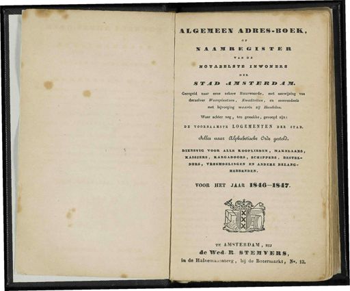 AIiCtEBEEEHr ADRES-BOEK , op I A 1 II H K « I S VER VAN DB NOTABBL3TB INWONERS D ER Geregeld naar eene zekere Huurwaarde , met aanwijzing van derzelver Woonplaatsen , Kwaliteiten , en meerendeels met bijvoeging waarin zij Handelen . Waar achter nog , ten gemakke , gevoegd zijn : DE VOOEMAAKSTE LOGEMENTEN BIB STAD . ésïïe * uaav &£ yêa&etitc6e Qibe . < pte &. DIENSTIG VOOB AIIB KOOPLIEDEN , SAKBU1IS , KASSIEBS , KABGADOOBS , SCHIPPEBS , BESTEE . BBBS , TBIS1IDEIISOEK BW A.VDEBE BHAJG - BEBSHSDEN . VOOB HET JAAR 1S46 — 1847 . te AMSTERDAM , bij de We«l . R . STEMVER », in de Halvemaansteeg , bij de Botermarkt , If ». 13 ,