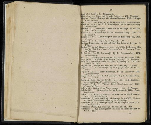 sjpoij ( N .) Kadijk , 2 - Mastenmaker . ^ Jooij ( Jean de ) SingeJ bij de oude Spiegelslr . 423 . Koopman . ^[ pij en Zoonen ( Haring ) Vierwinden-Dwarsstr . 1867 . Scheeps * timmerlieden , ( C . van den ) Vijzelstr . bij de Kerkstr . 4595 . Boekverkooper . ' rch en Comp . ( Ier ) JV . Z . Voorburgwal bij de Brouwerssleeg . Steenkoopeis . • dens ( T . J .) Leidschestr . tnsschen de Keizersgr . en Kerkstr . 3il7 . In Ilorologien . fcrdens ( A .) ïïieuwendijk bij de Karnemelksteeg , 1726 . In Ilorologien . [ ordes ( de ) O . Z . Achterburgwal over de Stoofsteeg , 62 . Med . Doctor . ■ ordes ( C . E . de ) Singel bij de Vijzelstr . 4385 . ■ ordes , Heisterman en van Eik ( de ) ten huize als boven . In Wijnen . ■ ordes ^ W . J . de ) Warmcesstr . over de Wijde Korksteeg , 161 . Griffier bij het Prov . Geregtshqf en in Patent- , Raapr . en Lijnolie , lordes ( J . P .) Haarlemmerdijk bij de Eenhoornsluis , 1508 . Plaatdrukker . lorel ( S . C .) Leliegr . tussehen de Heeren - en Keizorsgr . 2564 . lorel ( Wed . C .) Rokin bij de Langenbrugsteeg , 43 . Koopman . 5 ( G .) Oudenbrugsteeg en hoek Oudenbrug . 7 . In Duim ' stokken en Ellen . lorghols ( H .) Zeedijk en hoek van de Stormsteeg . Tapper . iorghols ii . ( H .) Prinsengr . bij de Vijzelgr . 4938 . In Piano- Fortes . [ Borghorst ( A . H .) korte Prinsengr . bij de Vinkenstr . 1382 . Lijnwaadperser . SrIs Biorghorst ( J . J .) N . Z . Achterburgwal bij de Huiszittensleeg , 86 . In Tabak . [ Borght en Comp . ( J . van dei ) Heêrengr tussehen de Huidenstr . en Leidschegr . 507 . Commissionair . Borgman ( Wed . W .) Vijzelstr . bij de Reguliersdwarsstr . 3993 . Pennenfabriek . Borhard ( C .) Water bij de Nieuwenbrug , 1643 . In Hoeden . Borleffs ( C . J .) Wieuweridijk bij de Raamskooi , 1372 . Boek- handelaar . Borloz ( J . E .) Rozengr . tussehen de eerste en tweede Dwarsstr . 2019 . Schoolhouderesse . iBormeester ( J .) Amsteheld bij de Prinsengr . boven 5605 . Tweede Luitenant Kwartiermeester bij de Schutterij . Bormeester ( P . G .) Heêrengr . bij de nieuwe Spiegelslr . 4031 . 554 . In Manufacturen . Bormeester ( Wed . C .) Keizersgr . bij den Amstel , 5931 . Bormeester ( S . S .) Heerengracht tussehen de Leidschestraat ea Gracht , 2932 .
