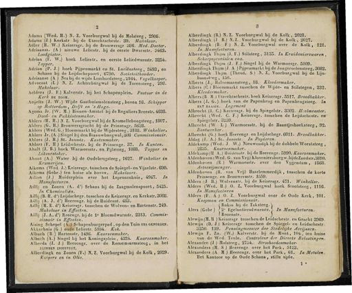 2 "*' H - »• Z Voorburgwal bij de Holsteeg , 2906 . Adrïun » Ta ') nv erSgr -,^ de *«»"»«« B ' a86 . Med . Doctor . LoodgiLel Bil tlj de eerSle Üwal8£lr - { B ^ IBb h ° ek Ielie8tr ' en eer5te Leliedwa ™"- 3254 . Adrian ( P . 8 hoek Pijpenmarkt en St . Luciënsteeg , 3493 , en Schan , bij de Leijdschepoort , 6790 . SocieteithmdJrf Ae,d ^ i J B / I , „ o K ; WerStr - bÖ het S ^ apenple in . , w jQ de Agema Jr . ( W.H .) Binnen-Amstel | de uooa - en P akkistenmakcr . Abler . IE . H .) N . Z . Voorburgwal bg de Kromelleboogsteeg , 1807 . ■ M 6rS ( ™ ? J Br <">^ er»gracht bg de Prinsen ^. 56?8 . S ' Ah H ™ I «" 1 Blo f mma ' k < b S de WgdesteegT3188 . Winkelier . A e ' fl ( H , l , 5 , , ng i ' b ' J , denB ' aa »"'""- S-al 1 308 Commissionair . All ers ( J . H .) St . Jansstr . Kastenmaker . Ahlu 3 / i b ^ h Le ! d w estr - h!i de P "™" S *. 37 . ƒ« jr««l «. Aholt ( J . B .) hoek About ( A .) Water bij de Oudebrug.teeg , 1627 . Winkelier in Kramerijen . Aikema ( Wed . J ) Manufacturen . Aillij en Zonen [ A . d ') Schans bij de Zaagmolenspoort , 5425 . In Chemicaliën . iP { ?: H - d ' J Leadschegr . tussclien de Keizersgr . en Ai g ( A . J . d ) Heerengr . bij deHuidenst . 483 . Ailhj ( M . E . d ') Keizersgr . tussclien de Wolven - en Aillij ( J . A . d ') Rozengr . bij de 1 » Bloemdwarsstr . 2313 . Commis- sionair in Effecten . Aising Schepel ( JHtóchapenburgerpad , op den Tuin ons genoegen . Akkerhuis ( G .) oude Leliestr . 5184 . Kak Albach ( B .) Hartenstr . 1496 . Kaarsenmaker . A bach ( A .) Singel bij het Koningsplein , 4324 . Kaarsenmaker . Alberda ( J . J .) Heerengr . over de Romeinsarmstebg , in het BLINDEN INSTITUUT . Alberdingk en Zonen ( F .) N . Z , Voorburgwal bij de Kolk , 2029 . Kuipers en in Olie . 3 Alberdingk ( B .) IV . Z . Voorburgwal bij de Kolk 20'B Alberdingk ( J B .) M . Z . Voorburgwal b.j de Kolk Wï Alberdingk ( B . F ) ». Z . Voorburgwal over de Kolk ' 121 In Manufucluren . ■ ' Alberdingk Thg .. ( J . F .) Slilsteeg , 3135 . In Kruideniersware » Scheepsprovisten enz . ' - Alberdingk Th,j „, ( J . F .) Singel bij de Warmoesgr . 5109 A berdingk Thgm ( JA ) Pijpenmarkt bij de Jongeroelensteeg , 3082 . A,be b d : , „ tt k . eg " ü i 5 o . ( Theod - 1 g z - BK ! * £ d Alben , ( i.j Halvemannsteeg , 18 . Klcedermaker Albers ( C.I Bloemmarkt tu.schen de Wijde - en Slilste^en , 232 Kleedermaker . ö ' Albers ( B Sjj HfcT HAASJE . Logement 6 s t !?™ 0 ?.' 1 w 0 -,' 11*111 bi ' de s P''«S«»»fr . 3302 . Meimeester . mSSmSiBm ssr - tusschen de teydsohe3tt - ew Albrecht ( W l ) bontwerker . "' Albrecht ( G .) hoek.Heerengr . en Leijdschegr . 6011 . Broodbakker . Aiaag ( J . A .) St . Jansslr . In Papieren . Aldekarnp ( Wed . J . W .) Nieuwendijk bij de dubbele Worststeee 2835 '. Kaarsenmaker . ' Aldekamp(H A .) Huide.istr . bij de Heerengr . 5990 . Kaarsenmaker A denhoven fWed . G . van Vrij ) Klovenier^urgwJnjdeZarXTsMO Aldenhoven , E ) Warmoesslr . over den " V.jgendam S ' Artsenijmenger . ' *"""• Aldenhoven ( H . van Vrij ) Haarlemmerdijk , tusschen de korte Prinsengr . en Brouwersslr . 1559 . Alders ( J H .) Wolvenstr . bij de Keizersgr . 471 . Winkelier Alders ( Wed H .) O . Z . Voorburgwal Lek Stooft ",?, MM In Manufacturen "' i,lu - Alders ( F . A ) O . Z . Voorburgwal over de Oude Kerk . 101 Hoopman en Commissionair . ( Kokiii bij de Taksteeg . \ Alers ( Gebr ) > 2 - \ Rozenstr . \ Alewijn ( M . H ) Keizersgr tusschen de , e ^° r „ ( D -, 4 i K r er8 - gr tU * 3Chen . de S ^ el - ™ LeidscheTtr .' oi)ü . 139 . Penningmeester der Stedelijke Aeciinscn Alewgn F . Zn . ( W .) Kalverstr . bij de Munt , 104 V "\ * hn™van de Wed . Teule . Controleer der Directe Bcïa7tin"en A eundre ( J ) Mol.teeg , 2734 . Strookoedenmaker S 1 * A eiandcrs | M . S ) Heerengr . over het Park . 5123 Alexanders ; ( A M ) Heerengr . over het Park , 61 . ' In Metalen . Bet Kantoor op de Oude Schan . , stille ïgde .