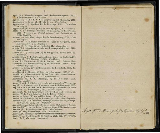 6 Aflol ( E .) Kloveniersburgwal hoek Oudemanhuispoorl , 2277 . I Kunstlakker^en in Glaswerk Appeldoorn ( J M ) fll , Z . Vooiburgwal bij het Klimopstr . 2113 . Appeldoorn en Comp . ( F . M .) als boven Kooplieden . Appenzcller ( J .) Vijzelstr . bij de Hecrengr . 4001 . In Lakens en Stoffen . Appenzeller ( J .) Heerengr . bij de oude Spiegelstr , Kleedermaker . Arala ( P . d ') Heerengr tusschen de Heerenstr . en Brouwersgr . 4684 Koopman en Consul-Generaal van Sardinië en de heide Siciliën Arbraan en Schroder , Singel bij de Romolensteeg , 278 . Con - vooiloopers . Arbman Jr ( E ) Kerkslr . tusschen de Vijzel- en Spiegelstr . ' 4181 . Deurwaarder bij de Regtlank . Arbman ( J . F .) Ygr . bij de Foelieslr . 17 . Kargadoor . Arends ( A .) Leijdschestr . tusschen de Keizersgr . en Kerkstr . 3114 . Koekbakker . Arends ( J . J .) Buitenkant bij de Scbipperslr . boven 2184 . 29 . Makelaar . Arends ( Wed , J.j Buitenkant tusschen de Peper - en Foeliestr . 244 . Arendsen ( B . W .) Holsteeg , 2730 . Koekbakker . Arens ( R ) Warmoesstr . bij de SU Jansstr . 1332 . Broodbakker . Arenspoot ( P ) Halvemaansteeg bij de Botermarkt . 4669 . Koop - vaardij- Kapitein . Arnaud en Comp . ( d ') Geldersche Rade bij Boomsloot . 3361 . 10 . Cargadoors . Arnold Jr . ( J J ) Bloeragr . bij de eerste I.eliedwarsstr . 2950 . Grutter . ' Arnold ( A . J.J Haarlemmerdijk bij het Plein 2422 . Commissionair . Arnould ( A .) Looijersgr . 6353 . Klaviersteller . Arntzenius ( D . J . A .) Heerengr . bij de Leidsehegr . 6004 . Med . Doctor . Arons ( B . en L . M ) Keizersgr . tusschen den Amstel en Weespersfr . Arp ( M . A . Fraissinet van ) Planlaadje over dcüluiderpoort , 6905 . Arp en Comp . ( 1H . van ) O . Z . Achterburgwal fusschen de korte Storm - en Molenslegen , 585 . Convooiloopers . Arriè'ns ( C . W . C .) Prinsengr . tusschen de Run - en Beerenstr . 54 . Arripe ( Wed . J . d ') Keizersgr . bij de Leliegr . 2941 . Arripe en Comp . ( d ') ten zelfden huize Kooplieden . Asmus ( G .) Prinsengr . bij de Brouwersgr . 5163 . Gep , Kapitein . Asschenbergh ( J.H Hackman ) Heerengr . tusschen de Reguliersgr . en Vijzelstr . 4658 . 580 Makelaar . Asschenbergh enCalkoen . Ten huize ah boven Makelaars in Katoen . Asscher ( E ) Weesperstr bij dePrinsengr . boven 6308 . Heelmeester , [ H Asscher ( B .) Rapenburgerstr . 5199 . Heelmeester . Asselt ( J . van ) Passeerdergr . 6524 . Broodbakker . A ss er ( C . JJ . ) Heo iu ngi bij de ütreuliLsclieslr 5043 . 603 . Ad v oca at . Asser ( T . en , E J .) Singel bij de Vijzelstr . 4385 . 536 . Procureurs . Asser ( E . J,j als boven . Advocaat . ^ t^.^/.^^^j ^ ^ ^^^^^ P < 4~#6 .