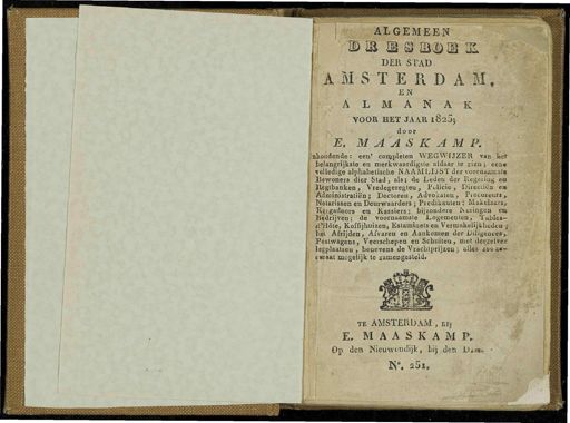 ALGEMEEN SL DER STAD . lil STERDAM , EN ALMANAK .^ VOOR HET JAAR l82Ïj 5§S5|ɧj dooi E . M A A S K A M P . aUoudende : een ' completen WEGWIJZER van ket belangrijkste en merkwaardigste aldaar te zien ; eeD * psdhiinistraliën ; Doctoren , Advokalen , Pi coureurs ,. Notarissen en Deurwaarders ; Predikanten ; Makelaars , I^ligadoors en Kassiers ; bijzondere . Neringen ett •? ïS¥drijven ; de voornaamste Logementen , Tables- « l'Hóte , Koffijhuizen , Eslamiuelsen Vermakelijkheden 5 | ï & A&ijden , Afvaren en Aankomen der Diligences , Postwagens , Veerschepen en Schuiten , met derzelveir legplaatseu , benevens de Vrachtprijzen ; alLe > zoaa*- f waat mogelijk te zameDgssleld . te AMSTERDAM , bij E . MAASKAM P , Op den Nieuwt-ïulijk , bij den iXimi .