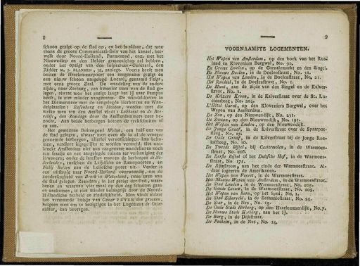 O * fcboon gezigt op de ftad op , en liet is aldaar , dat metr thans de groote Coramunicatiefluis'van het kanaal , het- welk door Noord-Holland -, Purmerend , enz . met het Nieuwediep en den Helder gemeenfcbap zal hebben , onder het opzigt van den InfpeAeür-'Gifteraal , den Ridder m . j . blanken , jz . aanlegt . Vooris heeft men buiten de Haarlemmerpoort een aangenaam gezigt en een nieuw fchoon aangelegd Locaal , genaamd fzigt ,. met eejil - groote Zaal . De wandeling aan de andere zijde , naar Zeeburg , een kwartier uurs van de ftad ge » legen , alwaat men bet gezigt langs het IJ naar Pampus hdfeftj is niet-minder aangenaam . "< l9fe wandeldreven in het Diemermecr met de aangelegde Herberaen en'Wan- - delplaatfen : Rofenburg en Moskou , worden met die Welke men aait . den Aniftel vindt lookhorst en de Bee- rebijl , des Zondags door de AirffteJfdammers zeer be- zöfclr . Aan bïïie herbergen komen de trekfchuiten af èn aan . Het gewezene Buitengoed Welna * een half uur van de ftad gelegen , alwaar men * ieven als in al de vroegergenoemde herbergen , allerlei ververfchingcn kan beko- men ,, verdient ingsgelijks te worden vermeld . Het ont- breekt Amfterdam niet aan aangetnfftie wan del Ween noch aan fraaije en net aangelegde tuinen ter verlustiging derinwoners ; onder de laatften munten de herbergen deNe- iteïkriden , tusfcben deXêljdfche en Raampoorten , en Nattj Bulten aan de Leijiifche poort uit . Verder is een uitftapje naar 1 N&órïl-Holland overwaard^,som de zonderlingheid van Broek in WaterktnH , twee uren van(iê'flkd gelegen . Zaandam , in het gezigt der Ftertbjiwaar»henen en waarvan vier maal op den dag fchuiten gaan en aankomen , is niet minder belangtijk door de Noord- H-illandiche netheid en zindelijkheid . Men vindt aldaarhet vermaarde huisje van Czaar peter den grooten , hetgeen men om te bezigtigen in hetM,ogement de Otter aldaar , kan bevragen . * Jt : n5.ai '. cl * 3 if**F ••■ •-! ia )* as » 3K*M ,; . VOORNAAMSTE LOGEMENTEN ? liet JPapen van Amfterdam , op den hoek van het Rus ; land en Kloveniers Burgwal , No . 90 . IWproote Disten , op de Garnalemarkt en den Singel . t)é'Nieuwe Doelen , in de Doeienftraat , No . si . Hst IVapen van Londen,Aa de Doeienftraat , No . 21 . tiet Rondeel , in de Doeienftraat , No . 1 . De Munt , aan de zijde van den Singel en de Kalver - ftraat , No . i . De Keizers Kroon , in de Kalverftraat over ' de Sc . Lu - ciemteeg , No . 204 . VHotel Garni , op den Kloveniers Burgwal , over het Wapen vau Amfterdam . De Zon , op den Nieuwendijb , No . 291 . De Zwaan , op den Nieuwendijb , No . 191 . Het Wapen van Einden , op den Nieuwendijk . De Jonge Graaf , in - de Kalverftraat over de Spaarpot - fteeg , No.'M » ' De Oude Graaf , in de Kalverftraat bij de Jonge Roe - loffteeg , No . to . De Tweede Bijbel , bij Cattermolen , in de Warmoes . flraat , No . - 206 . De Eerjle Bijbel of het Duitfche Hof , in de Warmoes » ftraat , No . ijra . De Rijnjlroom t aan het . einde der Warmoesftraat . Al- daar logeeren de Amerikanen . Het IVapen van Voorst , in de Warwöesflraat . Het NiefweWapen van rfm(lerdamitffë$éfc,fjiitimaesXïK2tt , De Stad Londen , in de Warmoesftraat ', Sftft * Ó5 *»' '•< De Goude Leeuw , in de Warmoesftraat , No . 205 . liet Wapen van Bern , op het Spui , Noi l.ct ? De Stad'Èlherveld , in de Bethanieftraat , No . 25 . De Star , in de Nes , No . 15 . De Oude-'&tads Herberg , op den Haarlemmerdijk , No . 7 . De Nieuwe Stads H-.rbirg , aan het IJ » -< JtIT*c De Burg , in de Dijkftraat , De Fontein , in de Nes , No . 14 , m