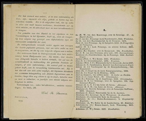 Hei kan evenwei niet anders , of in eene onderneming als deze , zijn , ongeacht alle vlijt , geduld en kosten nog ver . scheidcne leemten . Het is de uilgeefster leed , dat zij zulks in alles niet heeft kunnen voorkomen ; desniettemin zal zij niets ontzien , om dit Adresboek meer en meer tot volkomenheid te brengen . Ten . gemakke van ■ den Handel in het algemeen en van Vreemdelingen in het bijzonder , heeft zij , even als vroeger , bij deze uitgave nog gevoegd eene Alphabetische lijst der voornaamste logemeïteiï der stad . De ondergeteekende verzoekt verder opgave van beroepen der daarin geplaatste personen , voor zoo verre zulks nu niet is aangewezen , om dit bij eene volgende uitgave aan te vullen . Met vertrouwen biedt de Ondcrgeteekende deze hare onder- neming haren Stadgenooten aan . Zij meent , door dezelve eene dringende behoefte te hebben vervuld ; het zal van de welwillendheid en medewerking des geeerden Publieks af- hangen , of ee?ie onderneming , die zooveelgeld en moeite gekost heeft , aan de verwachting beantwoorden zal . Zij is hei dan ook aan zich zelve verpligt , dit Algemeen Adresboek der algebeeke belangstelling aan Amstels Ingezetenen aan te bevelen ; langs dien weg alleen is zij in staat , hetzelve meer en meer ie volmaken ; en jaarlijks eene nieuwe uitgave ver- krijgbaar te stellen . Verbeteringen van , onder het afdrukken , ontdekte misstel- lingen . Zie bladz , 298 . * m.vew . WU &&, s & Amjtsbdah , 1848 . A . 4a ( M . * W . van der ) Brouwersgr . over de Keizersgr . 47 . In Haard-Assche . Aa ( J . van der ) Prinsengr . hoek Noordcrmarkt , 5G48 . Winkelier . Aa ( G . van der ) Haarlemmerdijk bij de Oranjestr . 1499 . Aken ( J . van ) Prinsengr . bij de en Verfwuren . j Aalders ( H . G .) hoek Prinsengr . en nieuwe Leliestr . 3215 . Koekbakkrr . Aalders ( M .) Elandstr . over de Konijnenstr . 534 . Broodbakker . ^ ar ( J . H . van der ) Overtoom stille zijde , 229 . Koornmolenaar | Aarinksen ( J .) Uticchtschestr . bij de Prinsengr . 5840 . Buckver - kooper . Aartsen ( Wed . J . W .) Reestr . 1513 . Winkelier . Abas ( S . J .) Zwanenburgwal , 4204 . Koopman . Abbema ( Wed . J . F .) Bloemmarkt bij hot Keizerrijk , boven 3187 . Abbema ( J . F .) Spinhuissteeg Kantoor van Buitengewoon Zegel . Abbink ( J . J .) Voorburgwal bij de Heintjeshoeksleeg , 140 . Trans/atcur . Abee ( Th . 1 ') Singel bij de korte Korsjespoortsteeg , 2308 . Abel ( G.C ) Singel bij de Heisteeg , 3952 . Abel en Simmers , ten zelfden huize . Jn Leder en Huiden , Abels ( J . J ) lange IViezel , 19 . Schoenmaker . Abels ( F .) Prinsengr . bij de Angeliersgr . 5989 . Schoenmaker . Aberson ( F . N . L .) Keizersgr . over de Spiegelslr . 120 . Gep . Generaal Majoor . Aberson ( O . L . G . F .) ten huize als boven . Advocaat , Aberson ( D . P . H .) ten huize als boven . Advocaat . Abrahams ( A . Daniels ) Keizersgr . over de Keizerlijke Kolf baan , 6505 . Koopman . Abrahams ( J . Swart ) Kieuwendijk bij de St . Jacobstr . Abrahams ( 1 ).) Keizersgr . bij de Weespcrstr . In Juweelen , Abrahamsz . ( C .) Geldersche Kade bij Boomsloot . Abrahamsz . Jr . ( C.J Buiten-Bantammerstr . 1 . Koopvaardij - Kapitein . Abrahamsz . ( A . W .) Rokin bij de Lombardsteeg . 69 . Makelaar . Achtienhoven ( J .) Binnen-Amstel , hoek Watersteeg , 6451 . Steenkooper . Ackerman ( F . W .) Keestr . 1527 . Broodbakker ,