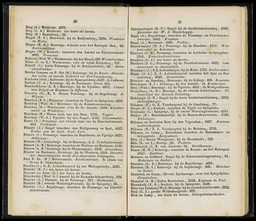 w Bing ( A .) Muiderstr , 4977 . Hing ( J . A .) Muiderstr . ten huize als boven . Bing ( H .) Rapenburg , 32 . Bingel ( B . F .) Nieuwend . bij de Baafjessteeg , 2394 . Winkelier in Moaesi ■ r Binger ( M . H .) Heerengr . schuins over het Entrepot-Dok , 63 . Boekhandelaar . Binger ( W.jflKferkstr . tussehen den Amstel en Utreehtschestr . 6091 . Procureur , Binhout ( Wcd.W .) Warmoesstr . bij den Kiezel , 683 . Winkelierster . Binns ( J . en E .) Warmoesstr . over de wijde Kerksteeg , 727 . Bishoff (. 1 .) korte Prinseugr . bij de Eenhoornsluis , 24 . Stcen - plaatdrukker . Birrius Campen en P . Pet ( D .) Keizersgr . bij de Reeslr . Directie der eerste en tweede Sociëteit ter Zee-Verzekering . Bisehofer ( Geb .) Kalverstr . bij de Spaarpotsteeg , 3307 . InLederen .' Bisdom ( C . A .) Keizersgr . bij de Heerenslr . boven 485 . Bisschoffsheim ( l . R .) Heerengr . bij de Vijzelstr . 4667 . Consul van België en Koopman in Effecten . Bisschnp ( G . M . S . Steins ) Prinsengr . bij de Reguliersgr . In Wijnen . j^S v Bisschop ( H . I .) Prinsengr . tussehen de Vijzel - en Spiegelstr . 4230 . Bisschop ( Wed . G .) Heerengr . bij de Romeinsarmsteeg . Bisschop ( R .) Warmoesslr . over de St . Jansstr . 1293 . Kleeder - maker en Winkelier . Bisschop ( H .) Water hoek van den Dam , 2795 . Tapper . Bisschop ( W . A .) Vijzelstr . bij den Singel , 4392 . Schoenmaker . Bisset ( A .) Prinsengr . het tweede huis van de ïïooiderdwarsstr . 818 . Predikant . Blaaser ( J .) Singel tussehen den Heiligenweg en Spui , 4297 . Koster aan de Luth . Oude Kerk . Blaauw ( J .) Prinsengr . tussehen de Hoorderstr . en Vijzelgr.4927 . Ambtenaar . Blaauw ( W .) Leidschegr . bij de Heerengr . Z.Z . Tabaksfabrikant . Blaauw ( A . M .) Keizersgr . tussehen de Wolven - en Hartenstr.1120 . Blaauw ( A.H .) Keizersgr . bij de Westermarkt , 2239 . Assuradeur . Blaauw en Haakman , Keizersgr . bij de Westerm . 2239 . Directie der Amsterdamsche derde Zee-Assurantie Compagnie . Blad H . Zn . ( H .) Heerenmarkt . Boekhandelaar . In plaats van Erven B . Ouwerkerk . Blancke(J .) O.Z . Achterburgwal bij het Walenpleintje , 2399 . Blancke ( H.-JJ !) ten huize als boven . Blancke en Zoon ( G .) ten huize als boven . Blancke Gz . ( Wed G .) Amstel bij de Fransche Schouwburg , 109 . Blancke ( G .) Elandstr . bij de Prinsengr . 897 . Stalhouder . Blancke ( B .) tweede Weteringdwarsstr . bij de Spiegelgr . 36 . Blaneke ( A .) Reguliersgr , tussehen de Prinsengr . en Utrecht- schedwarsstr . 21 Blanckenhagen ( H . P .) Singel bij de Gasthuismolensteeg , 4908 . Directeur der W . I . Maatschappij . Blank ( A .) Reguliersgr . tussehen de Prinsengr . en Utrcchtsche - dwarsstr . 5642 . Koopman . Blank ( A .) Hartenstr 1896 . Poelier . Blanckemeijer ( M . A .) Prinsengr . bij de Elandstr . 1111 . Win- kelierster in Katoenen . Blankert ( C . H .) Prinsengr . tussehen do Leidsche - en Spiegelstr . 3503 . Kostschoolhouderesse . Blankert ( C . J .) ten huize als boven . Blankert ( J . C .) Prinsengr . bij de Noorderdwarsstr . 4922 . Com- missionair in Assurantiën . Blankhart ( J .) N.Z.Achterburgw . bij de Moist . 2752 . Boekdrukker . Blaser ( J . J .) N . Z . Achterburgwal tussehen het Spui en Ros - kamsteeg , 3849 . Deoartiseur . Bleecker en Joosting , He'erengr . bij de Leliegr . 400 . Kassiers . Bleeckman ( B . J .) Achtergr . bij den Amstel . In Kramerijen . Bied ( Wed .) Heerengr . bgfüe Vijzelstr . 4631 . In Modegoederen . Bleijenburg ( A . B .) Bloemgr . bij de tweede Leliedwarsstr . 27 . Controleur der Directe Belasting . Blekkingh ( J . H .) Singel bij de korte Gasthuismolensteeg , 3252 . Artsenijmenger . Blekman ( E .) O . Z . Voorburgwal bij de Stoofsteeg ', 77 . Bleusé ( P . J .) Kerkslr . tussehen de Vijzel - en Spiegelstr . Bleijkman ( A .) Spiegelgr . bij de eerste Weteringdwarsstr . 4311 . Blieker ( B .) Haarlemmerdijk bij de Binnen-Brouwersstr . 5700 . Blikslager . Bukman en Sartorius Dam bij den Vijgendam , 1667 . Kantoor - boekverkoopers . Blikman ( H .) K . Z . Voorburgwal bij de Molsteeg , 2718 . Bukman en Comp ., Buitenkant tussehen de Bantammer - en Schipperstr . Kargadoors . Blitz ( J .) Eerste Weesperstr . bij de Houtmarkt , 129 . Blitz ( G . en l .) Houtgr . 23 . Poeliers . Blitterswijk ( J . H . van ) Lindestr . 94 . Beeldhouwer . Bloem ( H . W .) Keizersgr . tussehen de Runstr . en het Molenpad . 5927 . Instituut . Bloemen en Gebhard , Singel bij de Sehoorsteenvegerssteeg , 91 . Makelaars in Suiker . Bloemen ( G . F .) Heerengr . bij de Reguliersgr . 4651 . Bloemen ( H . J .) Keizersgr . bij de Leijdschegr . 639 . Makelaar in Suiker . Bloemink en Comp . ( Erven ) Lijnbaansgr . over het Spiegclplein . Zeepzieders . Bloemist ( S . H .) Joden Houttuinen , 5349 . Koopman in Turf . Bloemkolk ( F . G .) Kerkstr . bij de Spiegelstr . 3430 . Blois van Treslong ( Wed.JBloemgr.bij de eersteLeliedwarwtr . 2952 . Blok ( C . J .) groote Wittenburgerstr . 697 . Blok en Comp ., ten huize als boven , Scheepstimmérlieden .