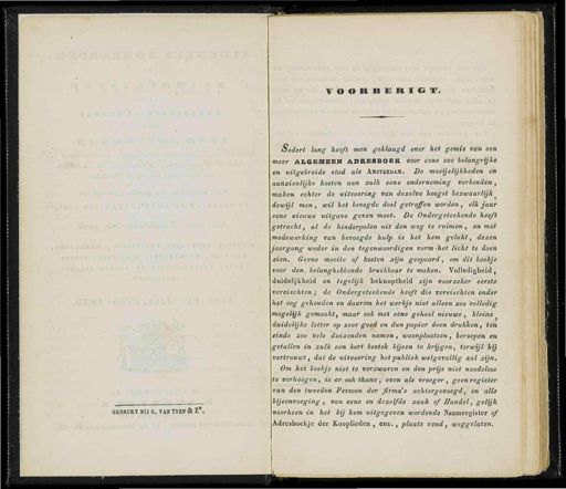 ¥ O O R B li 11 I T . T . I GEDHDK.T BIJ G , YAH TÏEK & Z " Sedert ■ lang heeft men geklaagd over het gemis van een meer ALGEMEEN ADRESBOEK vóór eene zoo belangrijke en uitg- ebreide stad als Amstebdam . De moeijelijkheden en aanzienlijke kosten aan zulk eene onderneming verbonden , maken echter de uitvoering van dezelve hoogst bezwaarlijk dewijl men , wil het beoogde doel getroffen worden , elk jaar eene nieuwe uitgave geven moet . De Ondergeteekende heeft getracht , al de hinderpalen uit den weg te ruimen , en met ■ medewerking van bevoegde hulp is het hem gelukt , dezen jaargang weder in den tegenwoordigen vorm'het licht te doen zien , Geene moeite of kosten zijn gespaard , om dit boekje voor den , belanghebbende bruikbaar te maken . Volledigheid , duidelijkheid en tegelijk beknoptheid zijn voorzeker eerste vereischten ; de Ondergeteekende heeft die vcreischien onder het oog gehouden en daarom het werkje niet alleen zoo volledig mogelijk gemaakt , maar ook met eene geheel nieuwe , kleine duidelijke letter op zeer goed en dun papier doen drukken , téh einde zoo vele . duizenden namen , woonplaatsen , beroepen en getallen in zulk een kort bestek bijeen te krijgen , terwijl hij vertrouwt , dat de uitvoering het publiek welgevallig zal zijn . Om het boekje niet te verzwaren en den prijs niet noodeloos te verhoogen ., is - er ook thans , even als vroeger , geen register van den tweeden Persoon der firma's achtergevoegd , en alle bijeenvoeging , van eene en dezelfde zaak of Handel , gelijk voorheen in het bij hem uitgegeven wordende Naamregister of Adresboekje der Kooplieden , enz ., plaats vond , weggelaten , ^ Hmhm