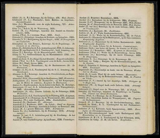 4 Allebé ( G . A . H .) Keizersgr . hij de Leliegr . 476 . Med . Doctor . Allcbrandi ( P . A .) Plantaadje , hoek Midden - en Lepellaan . Societeithouder . Alma ( L .) Warmoesstr . over de wijde Kerksteeg , 737 . Artse- nijmenger . Alma ( A .) Rok-in bij de Watersteeg , 3631 . Alofsen ( H . J .) Prinsengr . tusschen den Amstel en Utrecht - schestr . 6182 . Alofsen ( Wed . R .) kromme Waal , 2629 . Smid . Alsteede ( J .) Prinsengr . tusschen de Kruisstr . en Spiegelstr . 3563 . Alsteéde ( J . F .) Heiligenweg bijden Singel , 4183 . InDroogeryen en Ver/waren . Alstorphius en von Hemert , Keizersgr . bij de Reguliersgr . In ■ Linnens en op America . Alken ( H .) Stilsteeg bij de N.Z . Achterburgwal , 3122 . In Schoenen . Altena(M . van Regteren ) N»Z . Voorburgwal , hoek Armsteeg , 94 . Altess ( P .) Heerengr . bij de Rlaauwburgwal , 5272 . Alting ( C . S .) Gelderschekade bij de Bantammerstr . 2761 . Art- senijmenger . Allink en Zoon ( J . D .) Singel hij het Klooster . Roggebroodbakker . Altink ( Wed G .) H.Z . Voorburgwal over de Kolk , boven 2124 . Altius ( H .) Waal , boven 2634 . Altius en Comp ., Binnenkant , hij de Bantammerstr . 20 . In Houtwaren . Altmann ( J . ]).) O.Z . Voorburgwal bij de O.Z . Armsteeg , 66 . Steenkooper . Altmann ( J . D .) Keizersgr . tusschen de Utrechtschestr,en Regu- liersgr . 5529 . Altmuller ( H.D .) NieuwendijkbijdeBaafjessieeg,2387 . Winkelier . Ambagtsheer ( J .) buiten de Raampoort , op het Kuiperspad ., aan de Molen ie cobneua . Koopman in Houtwaren . Ament ( C.J Regtboomsloot , bij de Geldersche Kade , 78 . Makelaar . Amerongen ( J . van ) O . Z . Achterburgwal , hoek Walenpleintje , 2389 . Artsenijmenger . Amerongen ( G . van ) nieuwe Leliestr . bij de Prinsengr . 3156 . Winkelier . Araersfoordl(J .) O.Z . Voorburgwal bij de Pijlsteeg , 1371 . Koopman . Amersfoordt ( P . J .) Prinsengr . bij de Westermarkt , 354 Advocaat . Ameschot ( W .) oude Turfmarkt , 1904 . Banketbakker . Ameshoff ( H .) Doelenstr . 17 . Advocaat . Ameshoff ( J .) Huidenstr . 6197 . In Tabak , Snuif en Sigaren . Ameshoff ( P . J .) Heerengr . tusschen de Leliegr . en Heerenstr . 368 . Amesz ( H . J .) groote Bikkerstr . 1679 . Koornfacter . Amsen Pz . ( A .) Leidschestr . bij de Prinsengr . 3178 . Artsenij- menger . Amsink ( J . van ) O . Z . Achterburgwal bij de Stoofsteeg . In het Eng . Weeshuis . Amstel ( P . van ) Oostenburgergr . bij hetFunen , 1230 . Touwslager . 5 Ancher ( J . Brouwer ) Binnenkant , 2602 . Ancher ( J .) Buitenkant bij de Schipperstr . 2864 . Koopman . Ancona ( J . d ') Weesperstr . bij de Heerengr . 4567 . Med . Doctor . Anoona ( G . d'J Nieuwendijk over de Mieuwstr . 2391 . Med . Doctor . Andel ( F . van den ) Heerengr . bij de oude Leliestr . 5301 . Heel- en Vroedmeester . Anderson ( A .) Hartenstr . 30 . Boekbinder . Andrea ( J . H . d ') Wijde Gasthuismolensteeg , 4891 . Andresen ( J . F.)'Water bij de Karnemelksteeg , 83 . In Tabak . Andresen ( J .) Plantaadje bij de Muiderpoort , op de Tuin binnenhof . Koopvaardij Kapitein . Andresen ( A . J .) Binnenkant bij de buiten Bantammerstr . 2623 . Koopvaardij Kapitein . Andreson ( J .) oude Schans bij de Keizerstr . Commissionair . Andreson ( Geb .) ten huize al » boven . In Garens en Wollen . Andriessen ( J .) Boomsloot , 3057 . Koopman in Steenkolen . Andriessen ( Wed . J .) Water bij de Nieuwenbrug , boven 1659 . Andriessen ( A .) Brouwersgr . bij de korte Prinsengr . 1625 . In Drogerijen . Andriessen Jr . ( A .) Prinsengr . bij de Brouwersgr . 52 . Andriesse en Comp ., Hoogstr . bij de Kloveniersburgwal 36 . In Kanten . Ange ( J . Teissèdre 1 ') Keizersgr . tusschen de Vijzel-en Spiegelstr . 4091 . Predikant . & Angenendt ( T .) ïïieuwendijk en hoek van de Kieuwstr . Winke- lier in Hoeden . Anink ( G . J .) oude Waal bij de oude Schans . Houtvlotter . Anken ( D .) Hoogstr . bij de Bethaniendwarsstr . 1465 . In Fruiten en Visch . Ankerman ( J . F .) Amstel bij het Amstelgr . 6408 . Schipper op ' s Hage enz . Ankersmit ( W . J .) Singel hoek oude Leliestr . 5183 . Artsenij- menger . Ankersmit ( J .) Singel over de Warmoesgr . 145 . In Tabak . Annesleij ( J .) Keizersgr . tusschen de Reguliersgr . en Vijzelstf . 714 . Consul van Groot Brittaniën . Ansing ( Wed . G .) Bloeragr . bij de Prinsengr . 2858 . Ansken ( P .) Amsteldijk buiten de Weesperpoort , 46 . Tapster en Stalhouderesse . Anspach ( F . J .) Heerengr . bij de Gasthuismolensteeg , 5341 . Anspach en Donk , N . Z . Voorburgwal bij het Postkantoor . Geldwisselaars . Anthoine ( F . C .) Kalverstr . hoek Spaarpotsteeg , 3305 . Horo- logie - en Chronometersmaker . Apol ( E .) Kloveniersburgwal hoek oude Manhuispoort 2277 . Kunstlakker en in Glaswerk . Appeldoorn ( J . M .) N . Z . Voorburgwal bij het Klimopstr . 2113 . Appeldoorn en Comp . ( F . M .) als boven . Kooplieden .