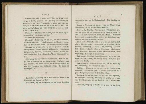 X *» g INieuwtnda », van t4 Febr . tot';i4 Óct . ten 8 . ie . tt.ii en 4 ," en Zondag ook ten 4 ure , en terug op de werkdagen ten 8 . 9 . ' ïs/en 2 ure ; ' sMaandags in plaats van 9 ten 10 « re ; en in de andere maanden vari Atriïl . ten 9 . 12 , 2 en 4 . en op Marktdagen ten 7 ure ; terug ten jfïaa . a . 4 6 en 7 ure . Vracht s ft , Nituviveen , Maandag ten 12 ure , van het Rokin bij ds Lombardfleeg , en Zondag van daar . Noorden , als Nieuwkoop . NotrAvtijk , Donderdag ten 12-Hre , van de Boommarkt , en Zondag van daar . Patfagiers gaan over Haarlem , ' en van daar met de Leijdfche Schuit , tot aan den Noordwijker hoek . Nor Atv , zoo er een Schip is om de 3 weken , van de Haringpakkerij . Neemt mede op Akkumerziel , Bargebubr ., Marienhaven , Dornum , Mtddelbuur , Embden , Minier , Es- fens , Nesraerziel , Jever , Rhastede , Wester- Akkumerziel en ' Hage . Nijmegen , een uur vóór Boomklokluiden , van den Sin- gel voor de Stroomarkt , en Zondag terug . Pasfagiers gaan . over Utrecht , van waar Zondag een Postwagen afrijdt , ef met den Postwagen van Amfterdam direct . Zie Lijst der Postwagens , enz . O . kosthuizen , Maandag ten 1 ure , van het Water bij de Sapélfloeg , en Zondag van daar . Qistzanes , op de Marktdagen ten 2 , en op de andere c 23 y êagen ten ï ure , van de Haringpakkerij . Ook dagelijks vatt daar . Opmeer , Woensdag ten 10 ure , van het Water bij da Nieuw'ebrug , en op dezelfde dagen van daar . Ouderkerk , Maandag , Woensdag en Vrijdag ten 1 ure , van het Rokin bij het Schapenplein , en daags te voren van daar . Zoo ook bij befloten water een Wagen . Pasfagiers " kunnen ook op onderfcheidene tijden met de Schuiten ver- trekken , die van de Beerebijt afvaren . . Oudewaier ^ Maandag , ' s namiddag ? ten 3 ure , van den Singel bij den Toren , en Zondag terug . Pasfagiers gaan meest over Gouda . Oude Wetering , Maandag ten 13 ure , van het Rokin bij de Lombardfleeg , en Zondag van daar . Oudshoorn , Maandag ten 12 ure van het Rokin bij de ' Langebrug ; Zondag van daar . ' t Winters fomtrjds een Wa - gen . Pasfagiers gaan met de Xjsijdfche Schuit . Overtoom - ( tot aan de S!uis ) van April tot Oét , dagelijks ,., en vervolgens Maandag , Woensdag en Vrijdag ten 1 ure , van de Prinfengracht bij de Runltraat , en ' s morgens-van daar . & reryeen , Dingsdag ea Vrijdag ten 2 urej van de Br«»J