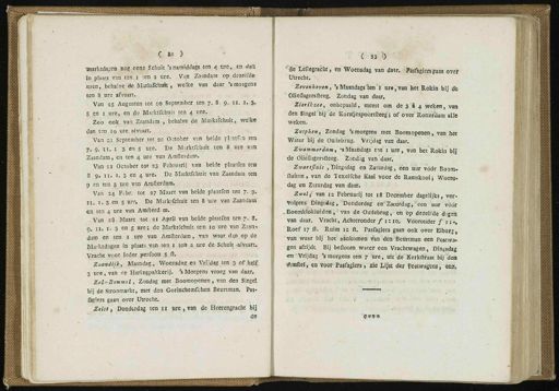 C Je 5 ■• uuktda^en nog ecne Schuit ' s namiddags ten 4 ure , en - daft in plaats van ten i ten 2 ure . Van Zaandam op dezelfde . uren , behalve üe Marktfchuit , welke van daar ' s morgens ten S ure afvaart . Van as Augustus lot co September ten 7 . S . 9 . J3 ; 1 . 3- S en 1 ure , en de Marktfchuit ten 4 ure . Zoo ook van Zaandam , behalve de Marktfchuit , welk « dan ten 10 ure afvaart . ' Van 21 September tot 20 October van beide fl.at&n ten 7 . 9 . 11 . 1 3 en 5 ure . De Mirktfcliuic ten 8 uie « n Zaandam , en ten 4 ure van Amfterdsm . Van 21 October tot 23 Februarij van beide plaatfen ten 9 . il . 1 . 3 en 4 ure . De Marktfchuit van Zaandam ten en ten 3 ure van Amfterdam . Van 24 Fcbr . tot 27 Maart van beide plaatfen ten 7 . ' 9 . 11 . 1 . 3 en 3 ure . De Markrfèhuit ten 8 ure van Zaandam- en ten 4 ure van Amftërd . m . Van 28 Maart tot ai April van beide plaatfen ten 7 . ï . o . 11 . 1 . 3 en 5 are ; de Marktfchuit ten 10 ure van Zaan . dam en ten 1 ure van Amfterdam , Tan waar dap op de Marktdagen in plaats van ten 1 ten 2 ure de Schuit - afvaart . Vracht voor ieder perfoon . 5 ft . Zaandijk , Maandag , Woensdag en Vrijdag ten 3 of half 3 ure , van de Haringpakkerij . ' s Morgens vroeg van daar . Zal<-Bommtl , Zondag met Boomopenen , van den Singel bij de Stroomarkt , met den Gorinchemfchen Beurtraan , ïas- ögiers gaan over Utrecht . ZtUt , Donderdag ten n ure , van de Heerengracht bij de f . 33 ï > - 3e Leliegracht , en Woensdag van danr . ' Pasragiersgaan over Utrecht . Zevenhoven , ' s Maandags 1ten~i ure,van het Rokin bij de ' Olieflagersfteeg . Zondag van daar . Zierikzee , onbepaald , meest om de 3 4 4 weken , van den Singerbij de Korstjespoorrtleeg '; of over ' Rotterdam alle weken . Zutphen , Zondag ' s morgens met Boomopenen , van hét Water bij de Oudebrug . Vrijdag van daar . Zviammerdam , - sMaandags Mn ' 1 ure , van het Rokin bij de öliéflagerstteeg , ' Zondag van daar . Zwartjtuh , Dingsdag en Zatürdag , een uur vóór Boom- fluiten , van de Tcxelfche Kaai voor de Ramskooij Woens- dag en Zatürdag van daar . Zwolfvm 12 Februarij tot 18 December dagelijks , ver- volgens Dingrïag , Donderdes ? èn^Zatrirdag^een uur vóór „ Boomklokmiden , van de Otniebrug , en bp dezelfde dijen van daar . Vracht , Achteronder ƒ 1:10 . Vooronder ƒ 1 ; s Roef 17 ft . Ruim 12 ft . Pasfagiers gaan ook over Elburg , van waar bij het aankomen vWi den Beürtman een Postw *. gen afrijdt . Bij befloten water een Vrachtwagen , Dïngsdaj « n " Vrijdag ' s morgens ten 7 ure , uit de Kerkftraat bij ' den Amftel , en voor Pasfagiers , zie Lijst der föstwagens , enz . ?¥ T »