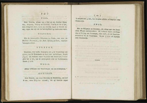 JjÖ®ÖS8«M .;: f 4 * )' ! T I El . Over Utrecht , alwaar van i Mei tot uit , October Maan . dag , Dingsdag , Vrijdag enZaturdag , ' s morgens ten 6 ure , , eene Diligence rijdt ; komt op dezelfde dagen te Utrecht te - - mg , tegen den tijd d2t UeTniüdagfchuit op Amfterdam vaart . TILBURG . Met de Antwerpfchc Diligences tot Breda , van waar de - Bosfcher Postwagen , dis door TJlburg . rasfeert , dagelijks - '« morgens ■ afiijdt . UTRECHT . Dagelijks , vice vèrfa * , ' s morgens ten 4 en ' s'namiddags tea <> r ure , van"de Boterrriarkt en hoek der Amflelitraat . Vracht- ƒ 3:8 . Bij befloten water insgelijks een Postwagen , ' s mor » gens ten 9 ure , van de Achtergracht over de Varkenmsrkt ." . Vracht ƒ 2 ! S . W E ' E S P . Alleen ' s Winters een Vrachtwagen van de Achtergracht ,'* Z U T P H E N . Over Utrecht , van waar Maandag en Donderdag , ten ha'f Si me , eene " Diligence , vertrekt , die op dezelfde dagen - Vmorgensten 4 ure , van 2utphen afrijdt ; Sa owt - Harderwijk . ZWOL . Met de Diligence op Deventer , die aldaar met den Zw ®. ■ fchen Wagen correspondeert . Bij befloten wa.er ook Ding . ■ dag en-Vrijdag een Postwagen , vice verfd , uit de Reguliers , - dwarsflraat bij de Vijzeltaat . Vr.cht ƒ 7 ; 2 . 0 f dageüjfes . over Harderwijk .
