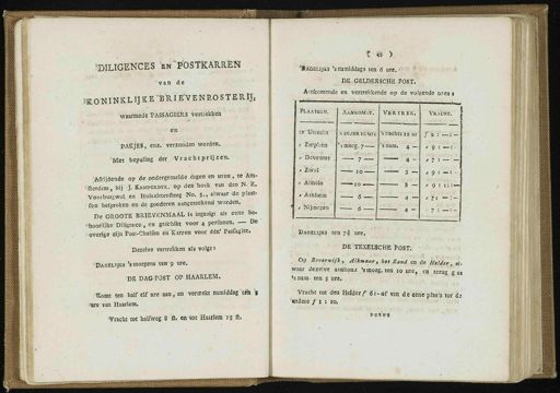 mmm ^ DILIGENCES en ' POSTKARRÈN van de tiONINKLIJKE- BÏLltfVENEOSTERlJ , ■ waarmede TASSAGIERS vertrekken en PAKJES , enz . verzonden worden . ' Met bepaling der Vrachtprijzen . Afrijdende op de otidergémelde dagen en uren , te Ara- i'flerdam , bij J . Kamperdyk , op den'Tioek van den N . Z . Voorburgwal , en Huisziitenfteeg No . 5 -, alwaar de plaat- fen befproken en de goederen aangeteekend worden . De GROOTE BRIEVENMAAL is ingerigt als eene Be- ihoorlijke Diligence , en gefchikt voor 4 perfbnén . — De ^ overige zijn Post-Chaifen en Karren voor één ' Pasfasier . Dezelve Vertrekken als volgt s ' Dagelijks ' s morgens ten ' 9 ure . DE DAGPOST OP HAARLEM . Komt ten half elf ure aan,'en vertrekt namiddag " tea t are van Haarlem . ^ Vracht tot halfweg 8 ft . en tot Haatlem ' is ft . X * > ' % XtSELijKs ' s namiddags ten 6 ure . ÉJ £ DE GELDERSCHE POST . Aankomende en vertrekkende op de volgende uren • Plaatsen . Aankómstv Vertrek . Vracht . te"Utrecht ' s av.ten ic-ure ' slfkchtsiz ur fa : ~:_ 1 Zutp^ien ' smörg.7 ' s nam . 4 — > 9 : —.- * Deventer 7 4 _ ' 7 ■■ i Zwol —- 10 — 3 — , 9 : — J - * Almelo — JO 8 — / 9 : 1 2 : — =:=| e Nijmegen t 7 : —.— Daselijks ten ^% ure . DE TEXEISCHE POST . Op Beverwiji , AUaaur , het Zand en de kttder , » i . waar dezelve aa-nkoiu « smotg . ten 10 ure , en terug g ai ' s nam . ten 5 ure . Vracht tot den Helder ƒ 6 :- of van de eene plaafs tot dj ' wdere ƒ 1 : w .
