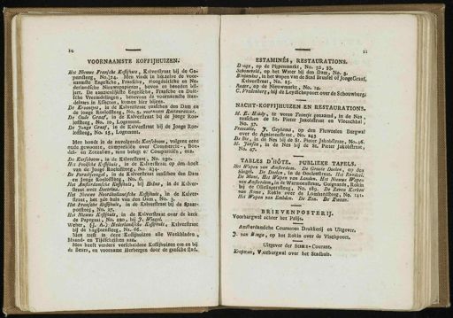 11 VOORNAAMSTE KOFFIJHUIZEN .' Hst Nieuwe Franjche Koffijhuis , Kalvesftraat . bij de Gï- pfiisftêeg , N0.I24 . Men vitidc in hetzelve de voor- naamlle Engelïche , Franlclie , Hoogduitiche en We * derlandfche Nieuwspapieren , boven en beneden bil- jart . De aauzienlijifte . Engelfche , Franfche en Duic- fche Vreeinaëlingen , benevens de voornaamlte Han- delaars in Effecten , komen hier bijeen .,".' Se Kroontjes , in de Kalverftraat tusfeneji den Dam en de longe Roeloffteeg , No . 5 . yoornacah Aestaurateur . Be Oude Graaf , ïnTIS"Kalverltraat bij de Jonge Roe- loffteeg ., No . 10 , Logement . Se Jonge Graaf , in de Kalverflraat bij de Jonge Roe- loffteeg , No . 15 , Logement . Mee houdt in de navolgende Karfeboom , volgens eene oude,gewoonte , comparUiën over Commercie -» Boe . del- en Zcezaren , men belegt e .' ComparUiën , enz . Ds Karfeboom , in de Kalverltraat , No . 230 '. Hst Poolfche Koffijhuis , in de Kalverftraat op den-.hoek van de Jonge . Roeloflleeg , No . 334 . De Paradijsvogel , in de Kalverltraat lusfehen den Dam • en Jonge Roeloffteeg ., No . 6 . Het Amflerdamfche Koffijhuis , bij Belas , in de Kilver - ftraat over Doctrina ; jUii ,- J Het Nieuwe Noordhollandfche Koffijhuis , in de Kalver - ftraat , het 3de huis van den Dam , No . 3 . Het franjeke Koffijhuis , in de Kalverltraat bij de Spaar - potfteegi , . No . 27 . U £ jb e |„ Hst Nieuwe Kiffijhuls , in de Kalverftraat over de kerk de Papegaai 4 No . 220 , bij Jyjtywcl . ^, < Weber , (■].■ A.$j • Nederlandfche Koffijhuis , Kaiveiftraat bij de bagijnenltèeg , Ns . < i6 . Men treft ( n dezeHKoffijnuizen alle Weekbladen , Maand- en Tijdfch riften aan . Men heeft verders verlcheidene Koffijhuizen om en bij de Beurs , en voorname Herbergen door de ganfche Qad . ESTAMINÉS , RESTAURATIONS . Sicqx , op de Pijpenmarkt , No . 32 , 33 , S&mstU , op het Water bij den Dam , No . «. Binjtmint , in het wapen van de Stad toustó oTjóngeGraaf Kalverltraat , No . 15 . - j»hbm«.i «, • Reaer , op de Nieuwmarkt , No . ia . C . Vredenberg , bij de Leydichepoort over de Schouwburg ; NACHT-KOFFIJHUIZEN EN RESTAURATIONS . ^ S * ■.*•**> o e v ^ en bontje germmi , in de Nes rusfehen de St . Pieter Jakobltmt en ' Vle«chha ! ,' Frascaiie . J . Geyïama , op den Fluweelen BurswaJ over de Agnietenftraat , No . 243 uwcelen uur S wi ' M'4»'J ? de . N ? b Ü de St : pi «« Jakobnraat , No . 4 «: nI £?' e NeS l>ij de St ' Pietet Jaköbftraa "; TABLES D'HOTE . PUBLIEKE TAFELS . IZT ° rf * m P ' rd Vn . De Groote Doelen , op de « De&t US #"!' in de , 0o '' ertlraat . Hel Rondeel De Munt . Het iVapen van Londen . Hst Nieuwe Waven WKJmllerdam^m de Warmoesftraat . GutonarS.aokta • bij de Oliellagersfteeg . $ 0 . , 89 . De Zelen Kerkel yan Rome , R^fcl „ 0 $ er de Lombard ^?!., if ,? Hst Wapen yan Embden . De Zon . Be Zwaan ?' * BRIEVENPOSTERIJ . Voorburgwal achter het Palijs . Amflerdamiche Couranten Drukkerij en Uitgever . 3- van Umga , op het Rokin over de Viscbpoort . Uitgever der Staats-Courant , Knopman , Vjorburgwal over het Stadhuis .