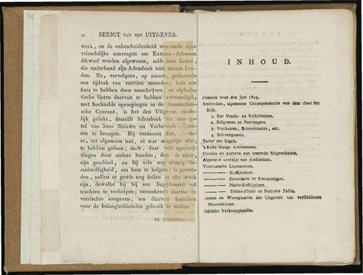 ia BERIGT van den UITGEVER . werk , en de onbescheidenheid waarmede zijnel vriendelijke aanvragen om Extract-Adressen ' dikwerf werden afgewezen , zelfs door lieden , i die naderhand zijn Adresboek niet missen kon-j den . Na , vervolgens , op nieuw , gedurende ! een tijdvak van "^ ïaarrrefr^fflltanden , huis aanf huis te hebben doen omschrijven ; en alphabe ,-' tische lijsten daarvan te hebbearr '- vervaardigd J met herhaalde oproepingen in de Amsterdaöi-S sche Courant , is het den Uitgever ,- einde- lijk gelukt , deszèlfs Adresboek tot F;feeö^'ge -| tal van 3ooo Nieuwe en Verbeterd * w ,-****! sèn te ~ brengen . " £ Hij vermeent Mats 5 ,' },; . pM^M ze , tot algemeen nut , al wat moge'Iijfe ' fess ,' j te hebben gedaan ; doch , daar vele opsehrij-j Vingen floor andere handen , dan de zijïreJ zijn geschied , en bij veTé lf ' nO {«''' ( W ) einig 3 ? i)'é -} reidwilligheid , om hem te helpen , is geVcW-j den , züTlén er gewis nog feilen in zirti Twerk zijn , dewelke " Tuj^bij een Supplement ; ^ Wlj trachten te verhelpen ; verzoekende daartoe de vereischte aangaven , om daarvan kosteloos I voor de belanghêifihen'den gebruikte makèrt .*-' DE XIIIGEVBK.V " 3 INHOUD . Almanak voor den Jsre 1S2S . , algemeens Correspondentie run dtar óoer ieê Rijk . 1 . Der Vracht - en Volkfchuiten . a . Diligences en Postwagens , j . Fosikarren.Brievenmalen , enz . 4 . Brievenposten . Tarief det Zegels , ' s Rijks Hooge Ambtenaren . Confuls en Agenten van vreemde MogeHdhede », ■ Algemeen overzi<t van Amfterdam . Voornaamfte Logementen . ——— Kofiijhuizen —— EstamiBets en Restaurateurs . - Nacht-Röffiihuizen , — Tables-d'Höte en Publieke Tafels . Namen en Woonplaatfen der Uitgevers van TerfchüJemte Nieuwsbladen .' oblieke Verkooppiaatfen ,