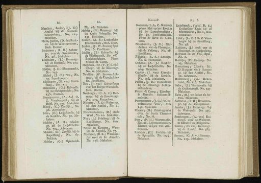 - M . Mercker , Junior , [( J . D .) Amftel bij de Fransche Schouwburg , No . 114 - Makelaar . Meza , Junior , ( D . de ) Kerk- sir . bij de Weesperstraat , Med . Doaor Merjeraan , ( J . H .) Achter- gr . over de Ossenmarkt , No . 2.6 , Makelaar . Merjnders , ( J .) Heerengr . bü do Hartenflr . No . 424 . Makelaar . Meijer , ( J . D .) Bloemmarkt , No . 245 . Michel , ( J . c 0 Ncs ' No - 30 . Leerköoper . Middagten , ( M . van ) Beurs - fteeg , No . 11 . Molenaars , ( G .) Kalverftr . bü het Schapenplein , No . 135 . Pastoor . Monshouwer , ( A - A .) O . Z . Voorburgwal , bij de Halft . No . 225 . Makelaar . Mooü , ( CO Zeedijk , No . 96 . Apotheker . Mos , ( H ) Leijdfcheftr . bij de Kerkftr . No . 3 °- Ma - kelaar . Mulder , ( A \ H .) Prinfen- gr . bü de Leijdfcheftr . No . 704 . Advocaat . Mulder , ( D .) Zeedijk bü de Kapelfteeg , No . 67 . Bakker . Mulder , ( G .) SpinhuisB . M . No . 16 . Makelaar . ■■■ Mnlder , ( H .) Heerengr . bij de Oude^Spiegelftr . No . 151 . Makelaar . Muller , ( A . S .> Lutherfche Diaconiehuis , Med . Doet . Muller , ( J . W . Statius ) Spui No . 15 . Predikant . Muller , ( J -) Kalverftr . bü de Olieflagersft . No . i63 . Boekhandelaars . Firma , Muller & Comp . Muijsken , Fz . CF . P .) Lerjd - . fchegr . bij de Heerengr .: No . 6 . Makeiaar . Nevifon , ( W . Brown ; Ach- j tergr . bü deUtreclitfche- ftr . Predikant . . Nes , ( J . van ) Kalverftraat over het Bnrger Weeshuis . Med . Doctor . Nueborgh , ( C . A . v .) Hee- rengr . bü de Brouwersgr . No . 309 . Kargadoor . Nieman , ( J . D .) Keizersgr . bij den Amftel , No . 4 , Makelaar . Nieuwenhuizen , ( D .) Oude Waal , No . 10 . Makelaar . Noé , ( J.J Prinfengr . bü de Reguliersgr . No . 829 , Makelaar . Nosfe en Kemper , Water bü de Kapelft . No . 77 . Nostlieer , ( B.K .) Warmoes- ftrr over de St . Anneftr . No . 178 , Makelaar . N P . • Normant , ( L.A . C . SJeJ-inet I primo Mei op het Rockin bü de Langebrugfteèg , No . 43 - Boekhandelaar . Firma de Erve H . Garc - man . Noothoven , ( J . M .) Mid- dellaan van de Plantagie , bü de Valbrug , No . 18 . Predikant , . NÜkerk , ( E . S .) Raamgr . No . 5 . Procureur . Obbens , ( A . J .) Kerkftr . bü de Leüdfcheftr . No . 229 . Makelaar . Ogtrop , ( J . van ) Utrecht - fcheftr . bij de Kerkftr . No . io5 . Makelaar . Pelfter,(J . H .) Hazenftraat bü de Elandsgr . Suiker - raffinadeur . Pieuts & Comp . , Elandsgr . in Utrecht . Suikerraffi - . nadeurs . Poortermans , ( J . C .) ' sGra - velandsche Veer , No . 148 .' Makelaar . ■ Prieser , ( H .) Prinfengracht over . de Stads Timmer -!: tuin,.No . 8 . Puts , ( P . H .) Warmocsftr . No . 28 . Logementhouder . Nieuwe Wapen van Am - fterdam . Rashorn ; ( C .) Kerkftr . bü de Spiegelftr . No . 294 , Makelaar . R , S . Reinfranck , ( Wed . t D . E .) Gclderfche Kade bü de Nieuwmarkt , No . 2 , Kas- tenmaker . Reisf , ( L . E .) O . Z.Voor- burgw . bü de Stooffteèg , No . 58 . Reü'dou , ( J .) hoek van de Heerengr . én Korsjesfteeg . Reü'vaan en ' de Vos , Spui , No . 8 . Romün , ( P .) Rozengr . No . 24 . Makelaar . Rozenburg , fjonkli . Mr . D . Rutgers van ) Heeren- gr . bü den Amftel , No . 11 . Advocaat . Ruitenberg ', ( A .) Hekcl- veldjNo . 216 . Makelaar . Salm , ( J .) Warmoesftr . bg de Oudenbrngft . No . 157 . Makelaar . Salm , ( H .) ten huize als bo- ven . Makelaar . Sartorius , CF . H ) Brouwers- gr . bü . de Oranjeftraat . Sandra , ( J .) Heerengr . Fbij de Wolvenftr . No . 471 ;. Advocaat . | Santbergen ,' ( A . van ) Kei- zersgr . over de Westerm . in Effecten en Obligatien . Santen , ( C . van ) Keizersgr .- - bij de Ruuftr . No . 585 . , . Makelaar . Santen , ( C . A . v .) Bloemgr . No . u9.iMakelaar , i
