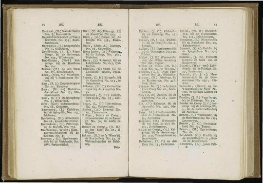 WÊE&8B ra BE . Beekman ,( H .) Noordermarkt 9 ^ lb '. 9 , Kastemaker . Beekman en Schouten , ( Firma ) Kalverflr . No . 234 , Boek- handelaars . Beekmeijer , ( J .) Schapenplein No . 6 , Chirurgijn . Beeldfnytler , ( B . T .) Regu - liersgr . bij de Keizersgr . No . 103 , Wijnkooper . Beeldfnyder , ( Wed ) Kei- • zersgr . bij de Runflraai No . 220 . Beelen , ( T .) op den Dam No . 27 , Schoenmaker . Beem , ( Wed . v .) Voorburg- wal bij ' t Postkantoor No . 206 . Beer , ( B . J .) Zwanenburgwal No . 71 , Koopman . Beer , ( H . de ) Bethanie - dwarsfiraat No . IS , Mu - zijkmeester . Beer , ( I . I ) Oudebrügfèeeg No , 3,-Zilverfmid . Beer , ( Joel ) Jodenbreeftraat No . 20 , Koopman . Beerekatnp , ( J .) Kerkftraat bij de Spiegelftr . No . 115 , Molenaar . Beerenburg , ( H .) Stroomarkt No . 16 , Kruidenierswinkel . Beerendonk , ( J -) P'infengr . bij de Kerkltr . No . 733 . Beerenkamp , Witten ; Elias , Kloveniersburgwal bij de ■ Raamgr . No . 4 ?. J ?", Beerman , ( JO Haarlemmer- dijk bij de VisGmerflr . No . 318 , Saaijetwinkel , BE . I Beet , ( C . de ) Keizersgr . bij de Rheelïraat No . 5 f4 . Beets , ( D .) JSingel bij dé Bergfir . No . 355 , Make -, laar . Beetz , ( Andr . A .) Bloemgr , No . 22 , Chirurgijn . Beetz Junior , ( A ) Keizersg ^ bij de Leliegr . No . 482 , Makelaar . Beetz , ( J .) Keizersgr . bij de Leijdfcheflr . No , 627 . Chi- rurgijn . Begeman , ( E .) Singel bij de Latijnfche School , Predi- kant . Beguin , ( J . B ) Kalverftr . bij de Gaperfleeg No . 213 , in Galanterien . Behrens , ( M . C .) Gelderfche Kade bij de Kraanfluis No . 42 . Beinvoort , ( J . H .) Leliegr . Ilillezijde , No . 35 , Bak- ker . Bekel , ( L . D ) Heérenftraat No . 24 , Varkenflager . Bekink , ( A . ) Rozengr . No . 12 , Timmerman . Bekker , Berntz en Comp ., Groeneburgwal bij de Raam- gr . No . 30 , in Koffij en Thee , Bekker en Comp . , ( G . H .) op het Spui No . 21 9 in Wijnen . Bekker , ( H .) op ' t Water bij de Baaljesfteeg No . 33 , in Walvisclibaarden en Balei- nen , Bek - BE . Bekker , ([. C .) Vinkenftr . bij de Prrnlengr . No . 19 , Smid . Bekker , ( ü . J . G .) Vinken- ftr . bij de Oranjefb.No . 5 , Bakker . Bekker , ( J .) Haarlemmerdijk bij de Dommerfir . No . 129 , Bakker . Bekker , ( J . D .) Warmoesflr . over de Wijde Keiklteeg . No . 168 , Tapper . Bekker en Comp . ( C . H .) Si)Ui No , a.6 , in Wijnen . Bekking , ( G . J .) Oude Teer- tuinen No . 37 , Winkelier . Bekman , ( G ) Prinfengr . bij de B.- ouwersgr , No . 446 , Med . Doet . Bekouw . Kz . ( J .) in de Jonge Roelofiteeg Nó . 18 , Boek- winkel . Bel , ( D . de ) Zeedijk bij de Kapelfteeg No . öé , Laar- zenmaker . Bel , ( P ) Keizersgr . bij de Heerenllr . No . 337 , Ma - ■ keiaar . Beier , ( A .) Haarlemmerdijk over de Heerenmarkt No . 35 , Apotheker , Belg ' ado , ( M .) Weesperftr . bij het Anth . ke:khof No . 131 , Hoofdmeester . Belit.g en Comp ., ( A .) Kei- zersgr . bij de Brouwersgr . No 409 , Commisfionair op Noorwegen . Bellefante , ( T . C .) op den Dam No . 15 , Collecteur . 15 BE . Beltjes , ( W . H ) Nieuwen - di.k bij de JMattelaarsgr . No . 115 , Tabafokooper . Bemeiman , ( J .) Nieuwcndijk bij de Ramskooi No . 95 , Tabakswinkel . Bemmel , ( E . v .) Kerkltr . bij de Spiegelftraat No . 270 , Smid . Bemmel , ( J . v .) Fluweele burgwal en hoek van de Kmpcrfteeg . Bemmel , ( Wed . van ) Leijd - fcheftr . bij de Prinfegr . No . 39 , Kruidenier . Bejnmel , ( L . J . v ) Haar- lemmerdijk bij de Doni - merilraat No . 23s , Chi - mist . Genaaide , ( Pieter ) op het ' s Gravelandfche Veer No . 150 , in silcfisch Linnen en Garen . Benclte , Q . P ) Reguliersgr . bij de Prinfengr . No . 72 . Bender en Comp ( j . C.)Lau *- riergr bij de Prinfengr . No . 3 , in de Suikerraffinaderij de Notebaai . Bender , ( J .) Warmoesflr . bij de Oude Brugfteeg No 229 , Leertouwer . Bender , ( J . G .) Haringpak - kerij No . 19 , Tapper . Bender , ( H .) Egelantiersgr . No . 16 . Berdsdorf . ( G .) Ze.edijk bij de StormfteegNo . 2i , Grut- ter en 3roodweger . Benedetti , ( B .) joden Prin-B -