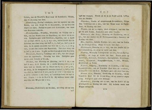 C si 5 ? 9aiden , van de Texelfche - Kaai voor de Ramskooi ; Woefis „ dag en Zaïurdag van daar . Middelburg , Zondag ' s morgens ., met het openen van den Boom , van den Singel bij de Ströomarta , en op dezelfde dagen van - daar , Pasfagjefs^gaan over Rotterdam , van waar ' een Beuvtman.ivertrefet . Monnikendam ., Mf.andag , Woenstfag en Vrijdag ten i - ■ ÜKt » van h<?t Water , voer de'KapéKleeg , en daass er na te- rug . Pasfagiers gaan'over Buikfloot -, dagelijks , van i April ■ tot 30 Sept . ten 6 , 9 , 2 , 4 en 5 ure , vertrekkende dan de • Schutten van - daar terug ten half 6,7 , half jo , half 3 e » 6 ure ; in de andere maanden van hier ten 7 , - 11 , 2,3 « n'4 ure , en met het luiden der Boomklok . Van daar terug ten 9 , half ;-® en 6 ure . Vracht tot Bnilfloot4ï en in de Roef 6 ft . Mon tf eert , Maandag % middags ten 2 ure , van den Singel over de Appelmarfec . Zaturdag van daar , Pasfagiers gaas meest over Utrecht of Gouda . ' Maiden , van Maandag tót Zaturdag , ten 6 . 8 . 10 . 2 en haf 6 urêj doch Zondag de 2 ' eerde Schuiten ten 5 en " 7 ure ; van 21 Octob . tot 15 Maart ten 8 . i-i . 2 en 4 ure , en terug , fa de etrstgemelele maanden ten half 7 , half 9 , half ISij'half 3 , half óen 8 ure , en'in de over e maanden de 3 eerüe Schuiten ' 1 uur laterj en ' s middags alleen ten half ( 3 ■« re ; Vracht 6 en in de Roef 8 ft . Bij beflo ten water rijdt dagelijks een « Wagen - ten 2 ure . •^ SJWi'^B.-C^WuVftÖtoit ) als Muiden , en terug eèn en ' een half " tóf-flur vroeger . Vracht 9ï en in de Roef 12 ! ff . ' s Win » ters als Maiden . ■ Naarden , Vracht - of zoogenoemde Buitenfchuit , Dings*dags ' s middags ten 1 ure , van'het Water voor de Papen- brug , en Zondag van daar . iöifi ;' Namen , om de 14 dagen , doch onbepaa'd , van den Sin- gel bij den Toren . Pasfagiers gaan over Brusfel . Nederhorst den Berg , Maandag en Donderdag , ten ra are , van den Amftel bij de Haivemaansbiug ;- Zaturd-!g ' en Zondag van- daar , Nes , dagelijks , behalve Zondag , ten 1 ure , van het Rokïn bij de Olfeflagersfleeg . Baags te voien van daar . Nichtevecht , Maandag ten 12 ure , van den Amftel bij-de ^ Halvemaansbrug , en daags te voren van daar . Niedofp , Woensdag ' s morgens ten 10 ure , vandeHaring- pakketói , - en daags te voren van daar . Neemt mede op Aarswoud , Eenvoud , Dirkshorn , flaringhuïzen , Heereboge- waard , Hoogwoud , Hooghuizeu waard , ' t Velt , Winkel , Zeijdewindt en Tolke «« S ,-.* N.jksrk , Dingsdag ., Donderdag en Zaturdag , 1 öur voor ÏSoomklokluiden , van de Texelfche Kaai Voor de *< amskooi ,. en daags te voren van daar . Pasfagiers gaan ook over Naa den . Nieuwe Diep , Dingsdag , Donderdag en Zaturdag , van de Texelfche Kaai bij de Nicuwebrug , en op dezelfde dagen terug . Pasfagiers gaan over Alkmaar . ■ - Nieuvikeop , Maandag ten 12 ure , van het Rokin bij-de Olellagersileeg ; Zondag van daar . Bij btfloten water ee » Wagen onbepaald , *«*